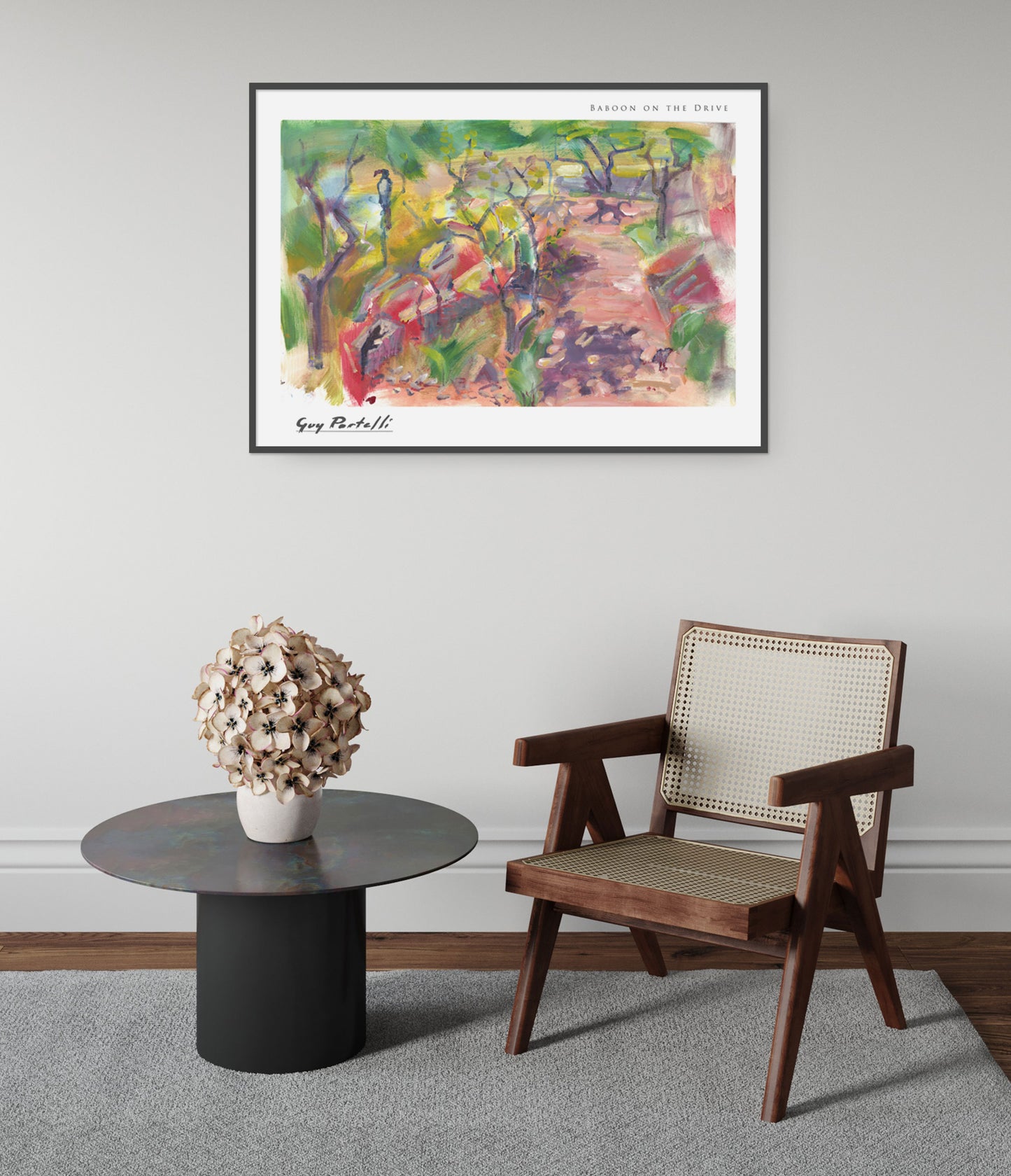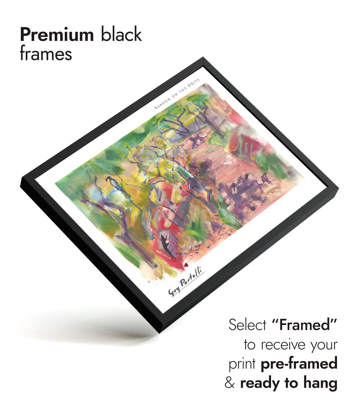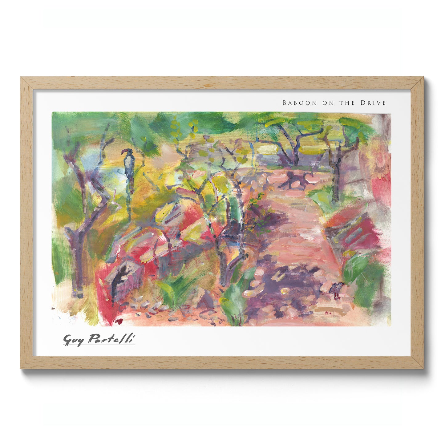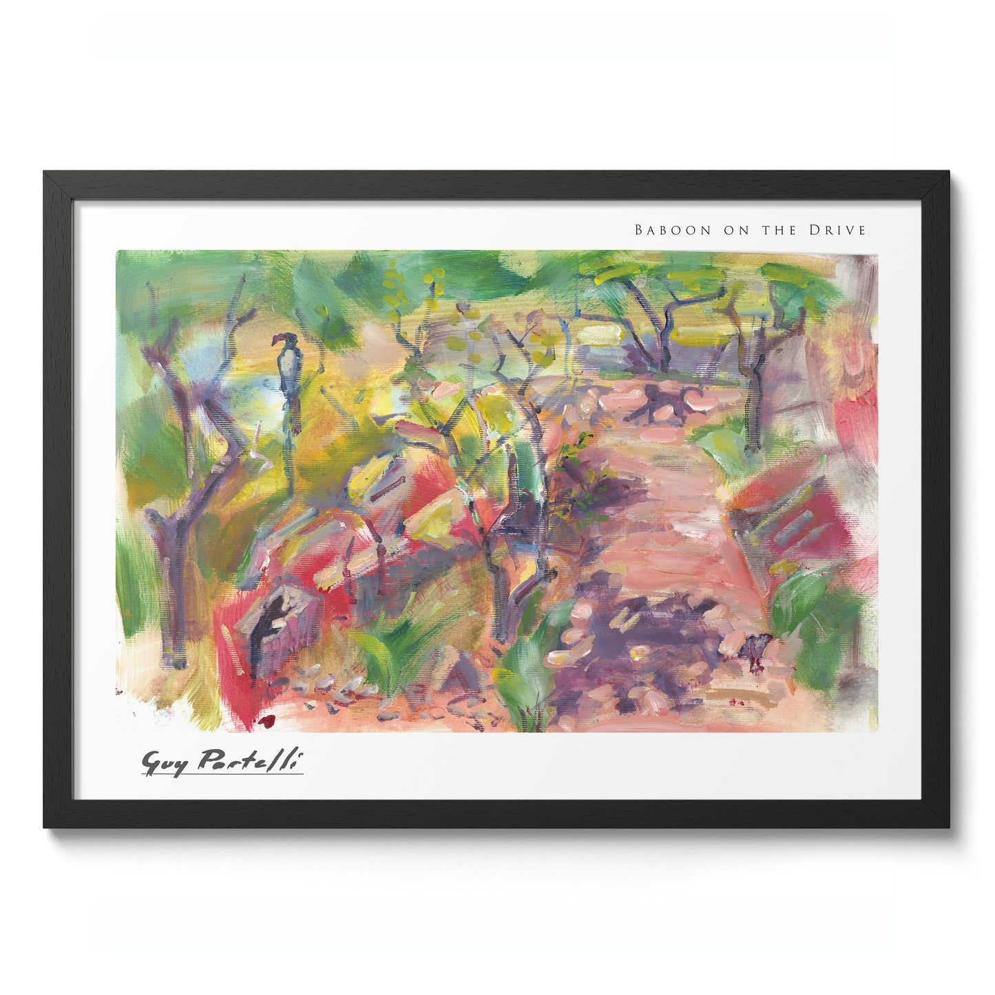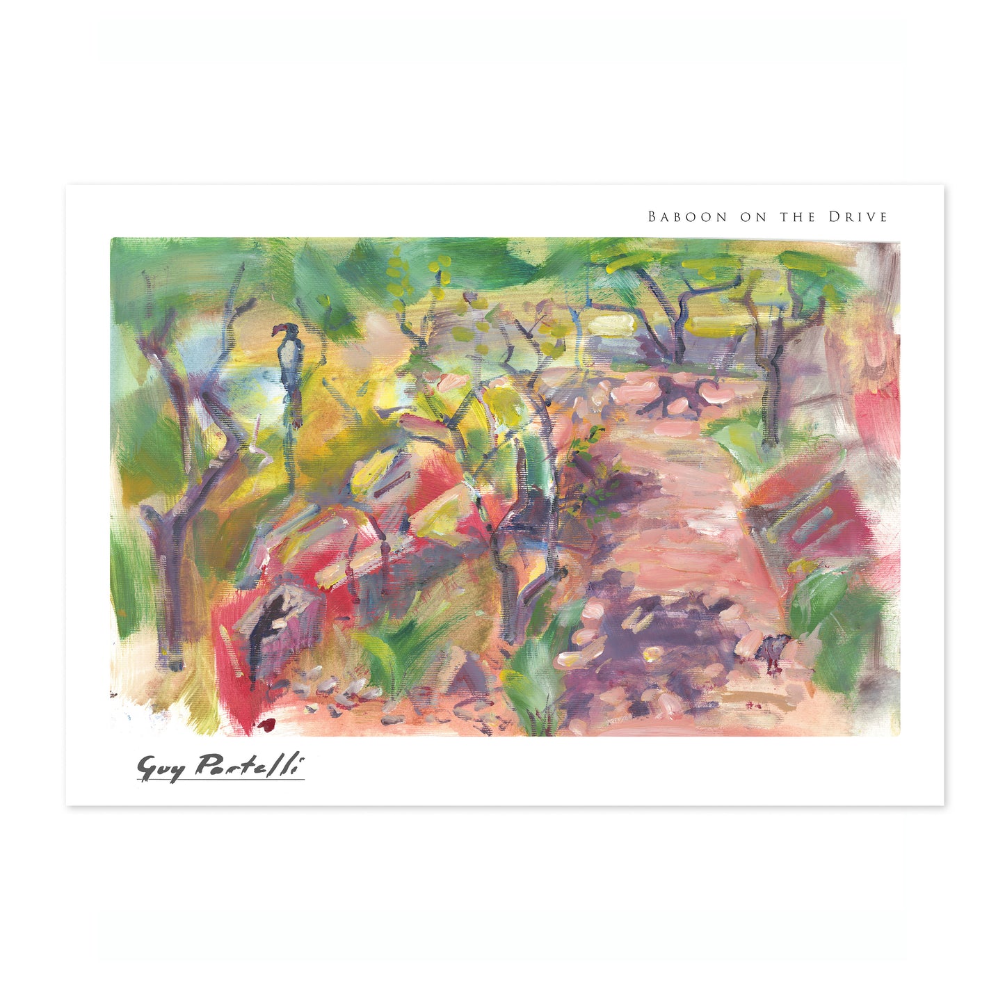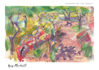 "Baboon on the Drive" by Guy Portelli captures a whimsical forest scene with vibrant, Fauvist-inspired watercolours. This landscape poster features an abstract baboon amidst a colourful, sun-dappled African forest path. Distinctive brushwork and vivid hues bring the natural setting to life, making it perfect for nature and animal art enthusiasts. Ideal for adding a touch of artistic wilderness to any space.