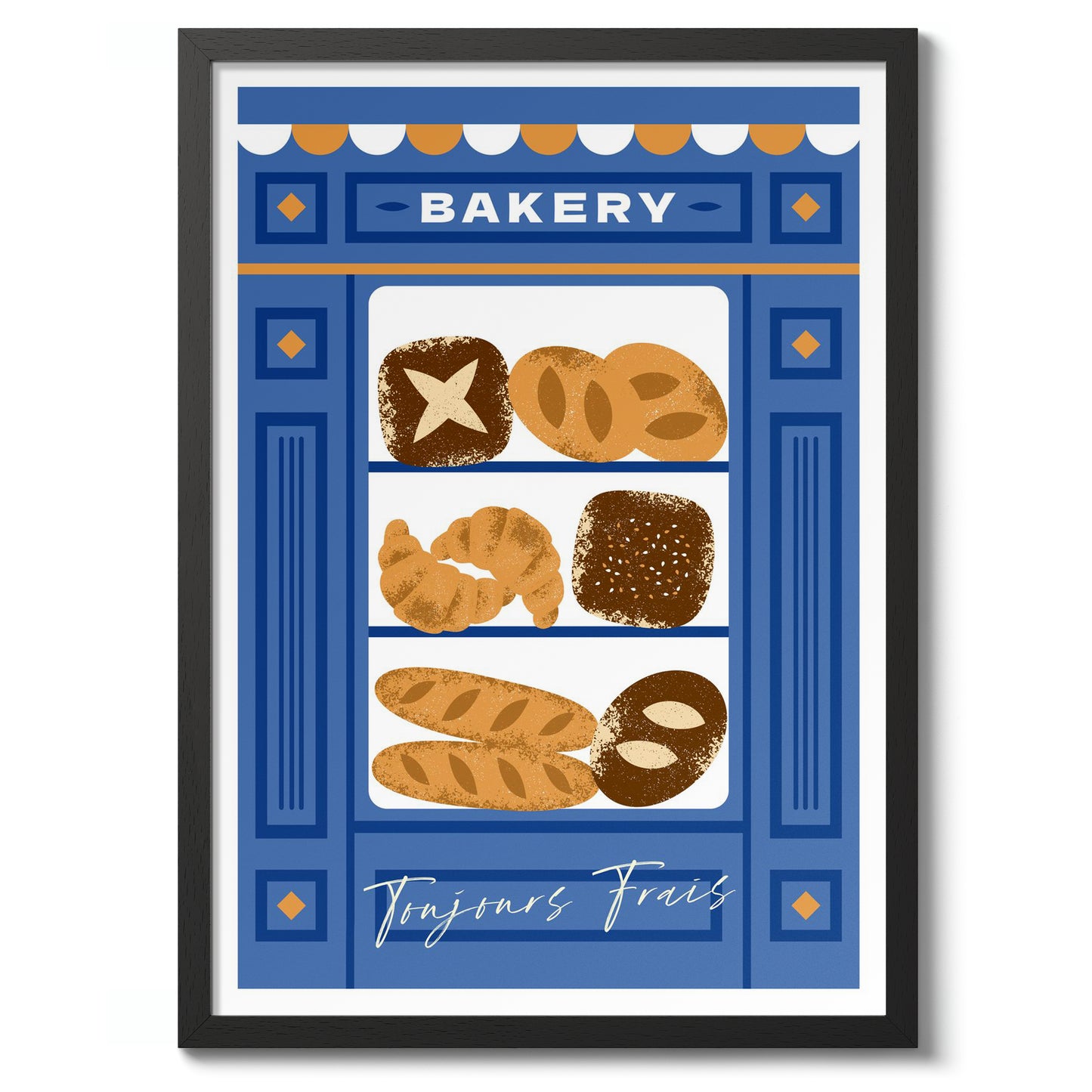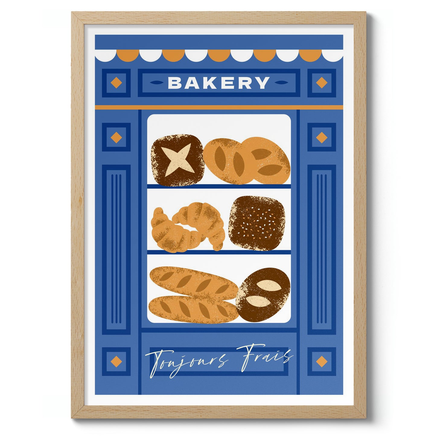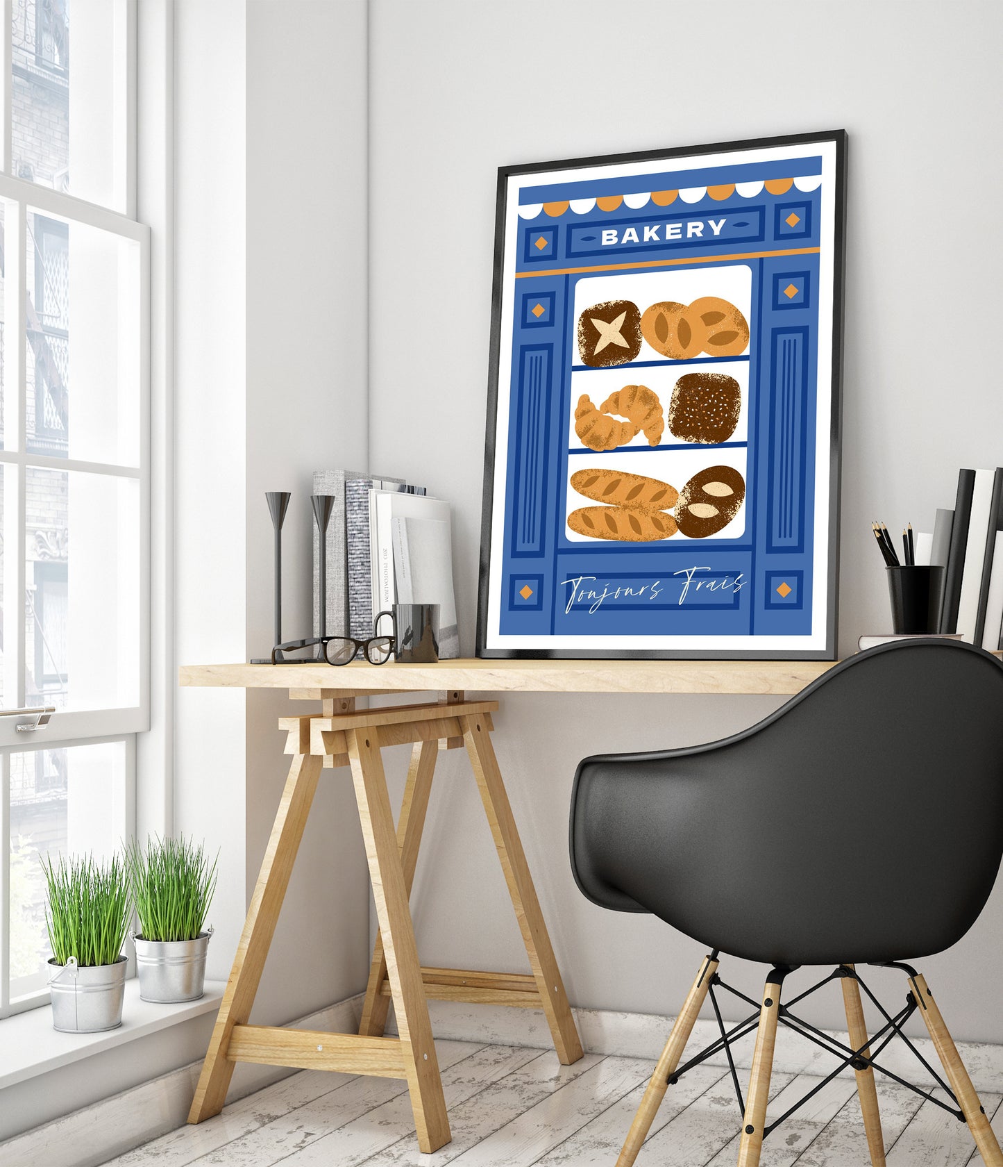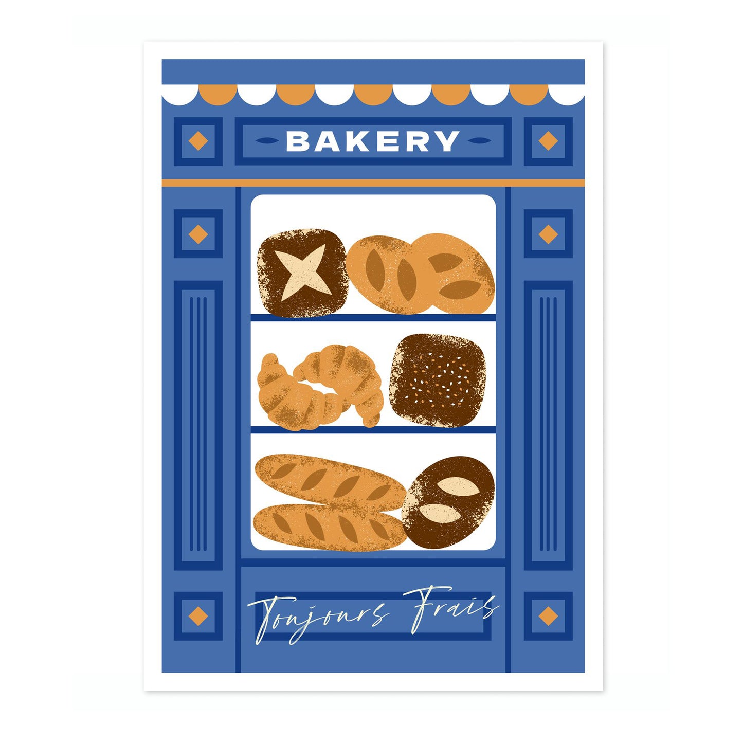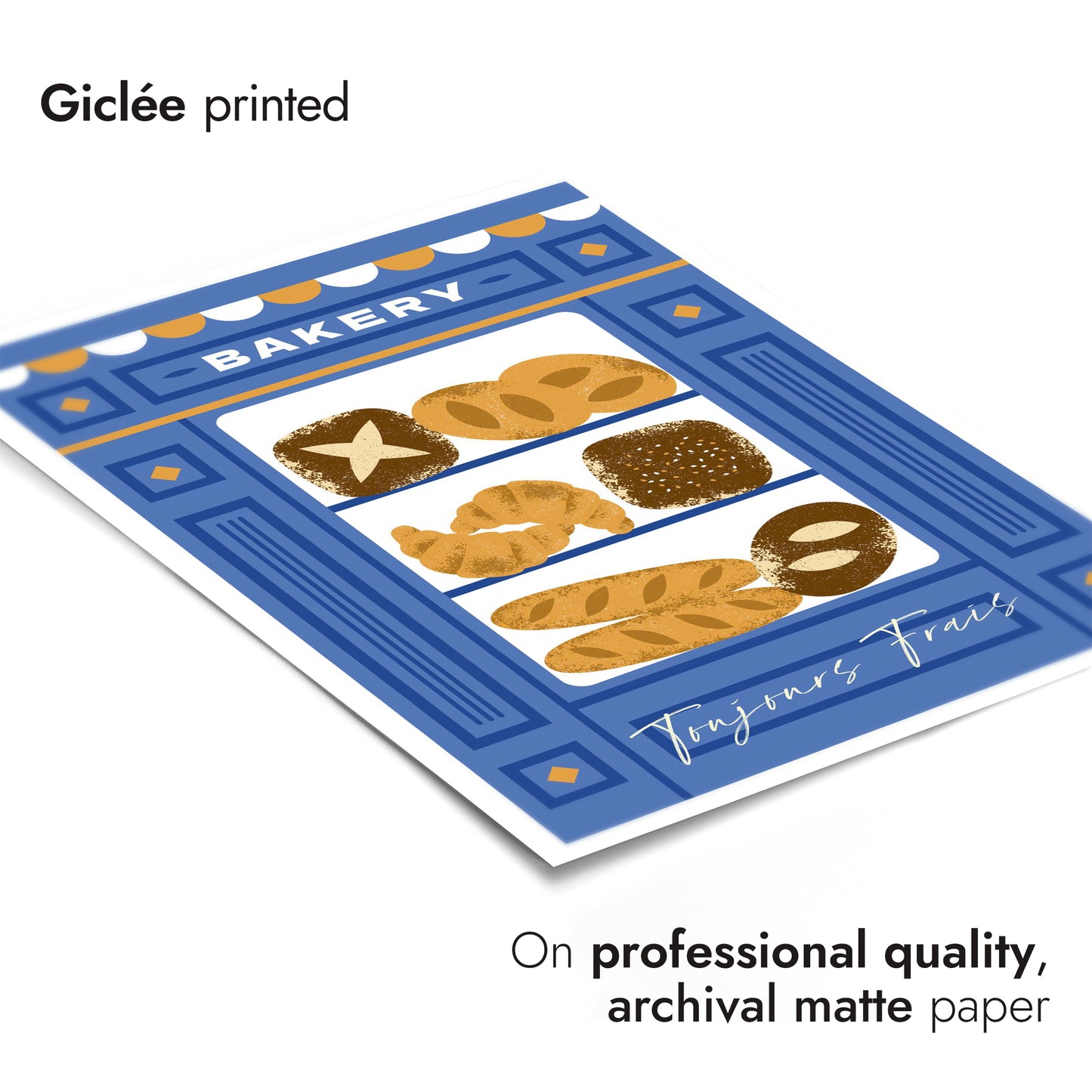 This modern graphic poster titled "Bakery, Always Fresh" showcases a charming French bakery window adorned in blue. The illustration captures an array of delectable breads, including croissants and loaves, embodying bakery freshness. The intricate collage style highlights the texture and form of each item, making it a delightful piece for those appreciating food art with a French twist.