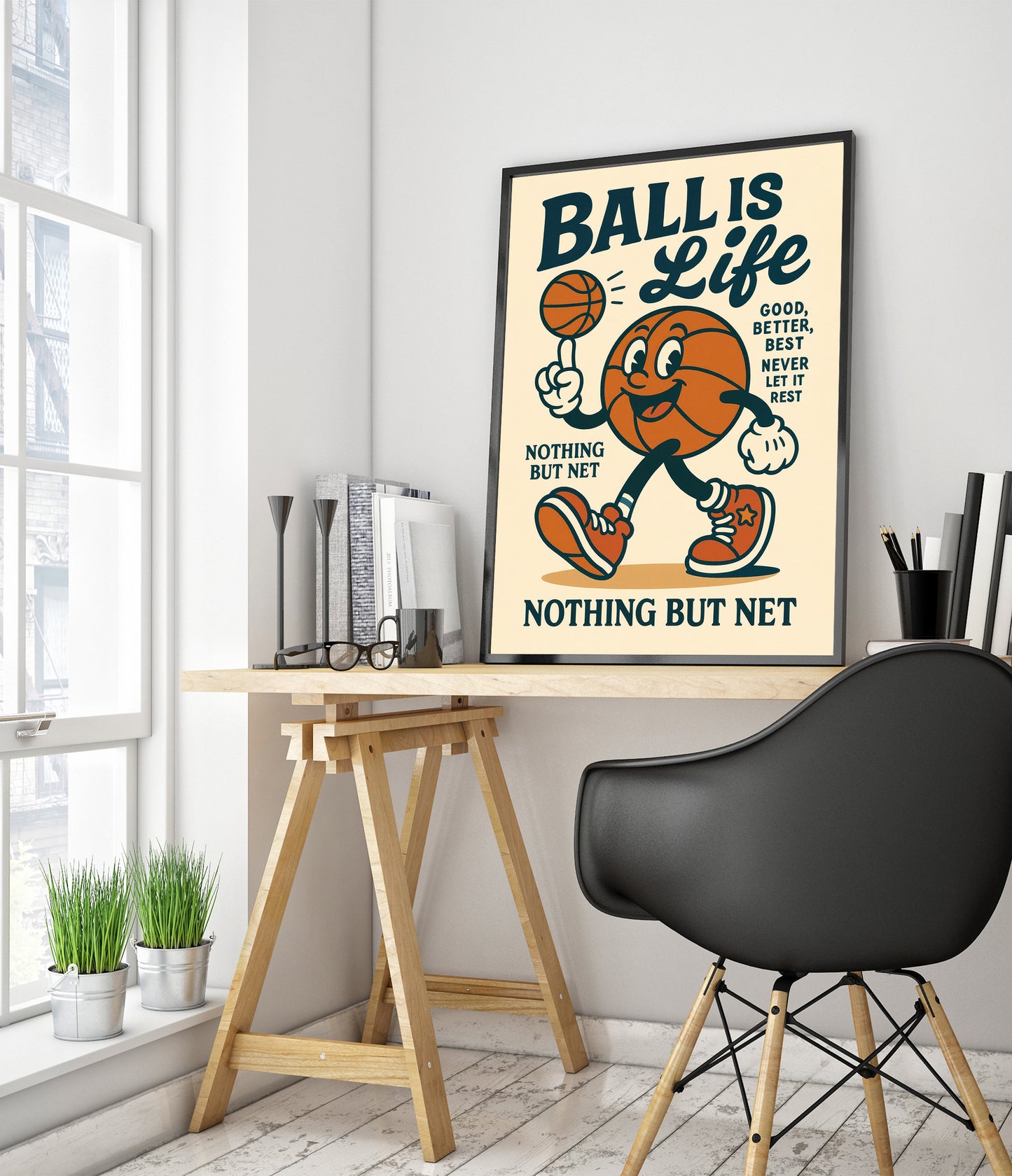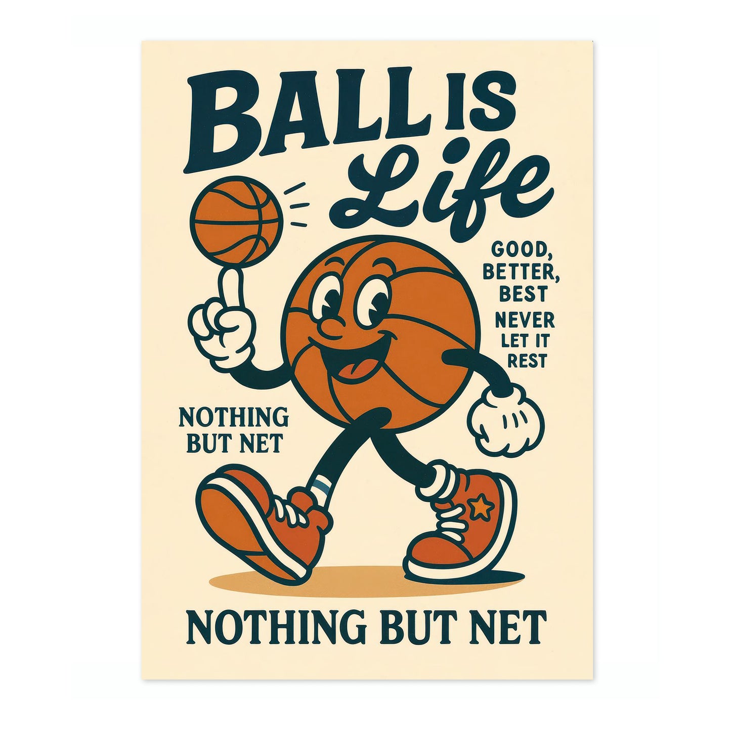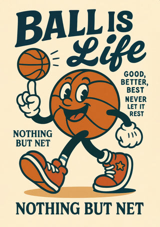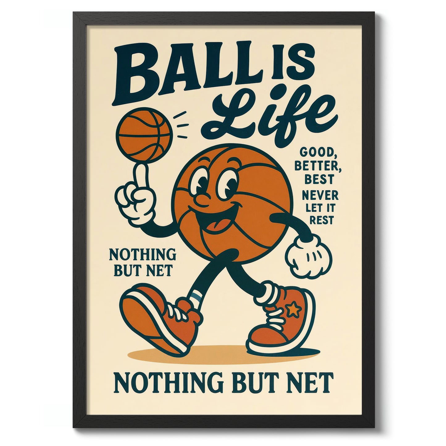 The "Ball is Life" poster showcases a lively cartoon basketball character exuding enthusiasm. Set against a beige backdrop, this vintage-style illustration merges sports and typography, emphasizing phrases like "Nothing But Net." Ideal for basketball lovers, its energetic design and nostalgic feel capture the essence of passion for the game, making it a standout wall art piece.