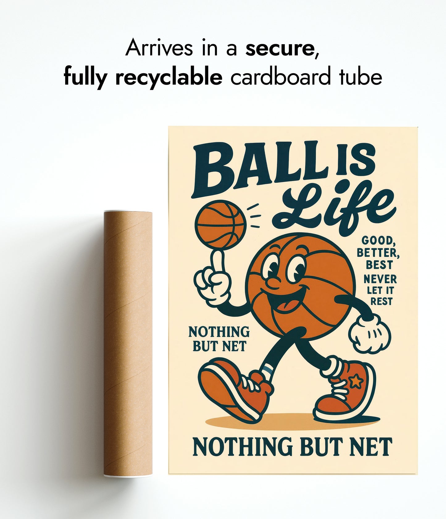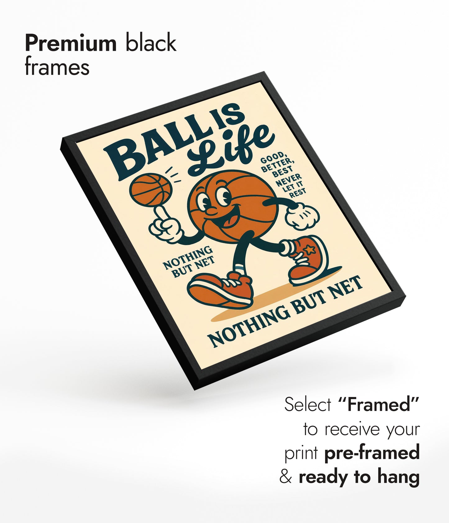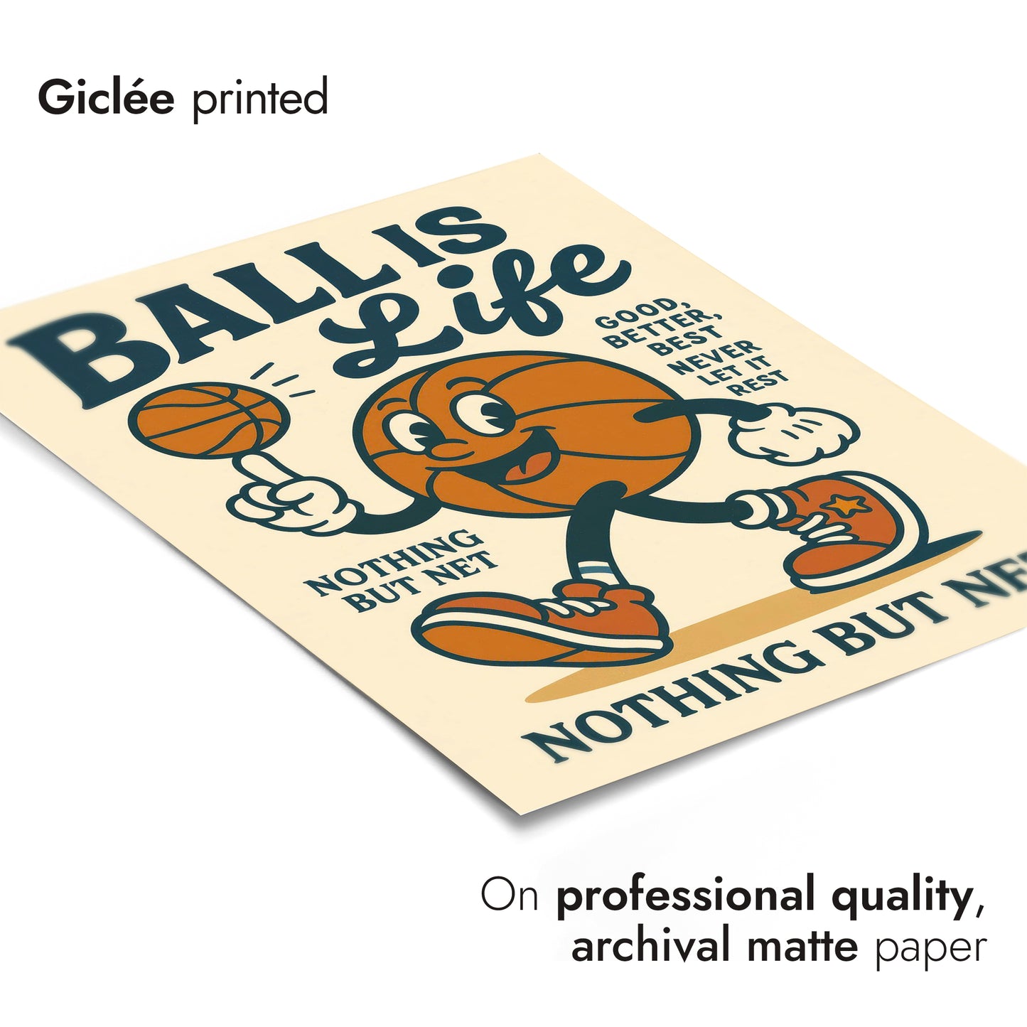The "Ball is Life" poster showcases a lively cartoon basketball character exuding enthusiasm. Set against a beige backdrop, this vintage-style illustration merges sports and typography, emphasizing phrases like "Nothing But Net." Ideal for basketball lovers, its energetic design and nostalgic feel capture the essence of passion for the game, making it a standout wall art piece.