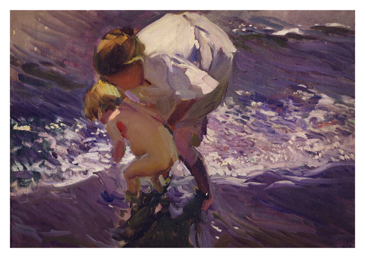 "Baño en la Playa" by Joaquín Sorolla showcases an intimate beach scene, capturing a tender moment between a bather and a child against the backdrop of softly rolling waves. This impressionist painting poster highlights delicate brushstrokes and a muted colour palette, evoking a serene, timeless connection with the seaside. Ideal for admirers of coastal landscapes and classic art.