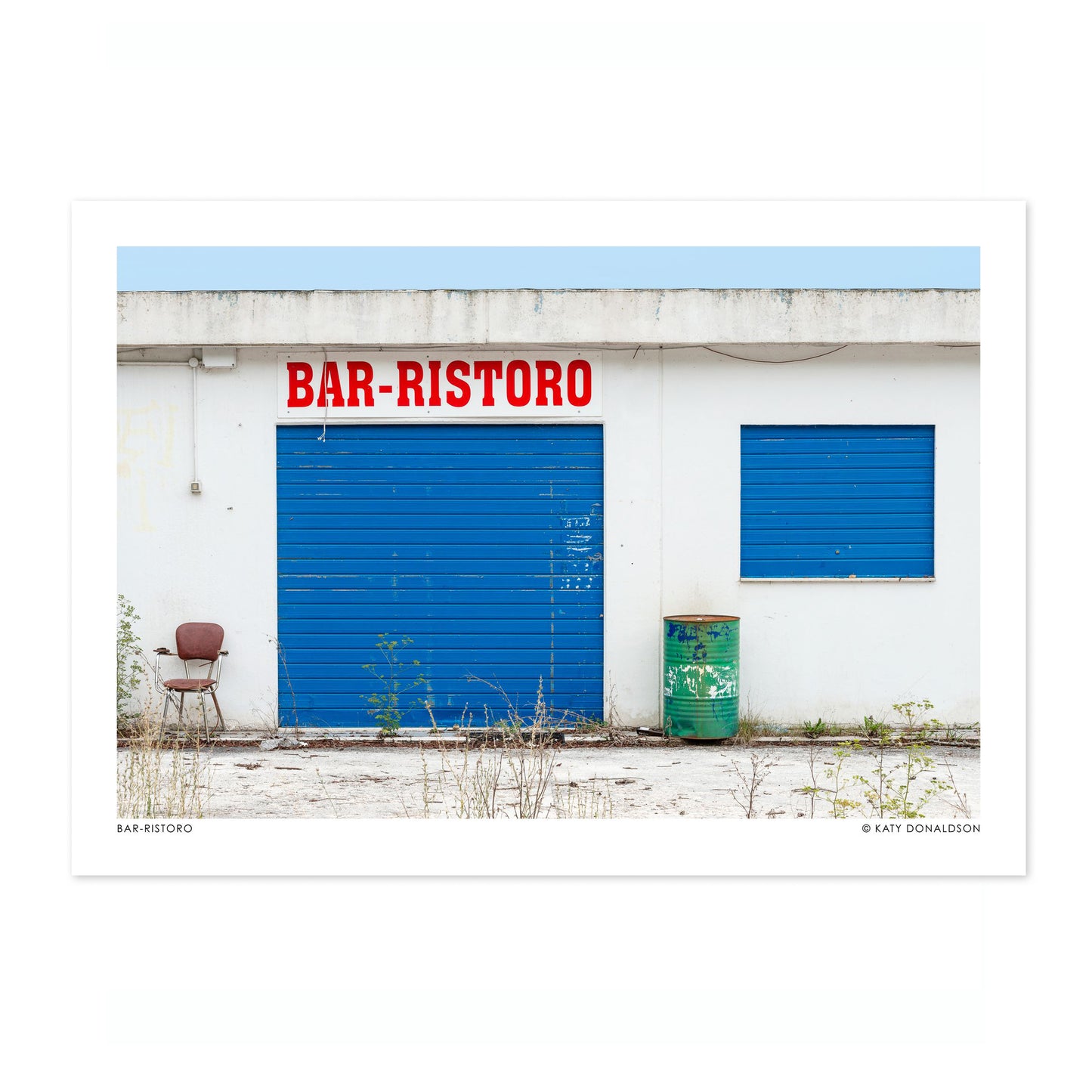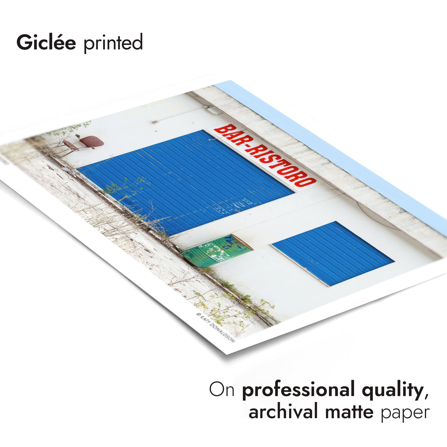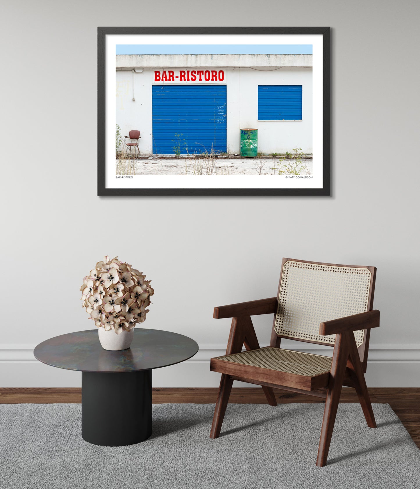 Capture the tranquil essence of a quiet Italian street with Katy Donaldson's "Bar-Ristoro Landscape" poster. This vibrant image features a minimalist scene showcasing vivid blue shutters and a matching door, contrasted with a bold red "BAR-RISTORO" sign. The deserted exterior, complemented by a lone chair and a weathered barrel, offers an intriguing glimpse into authentic Italian life. Perfect for travel and photography enthusiasts.