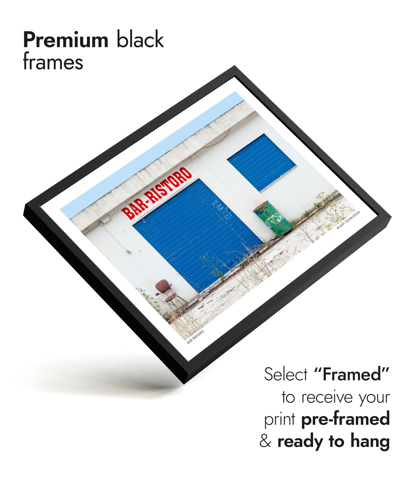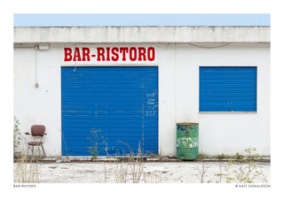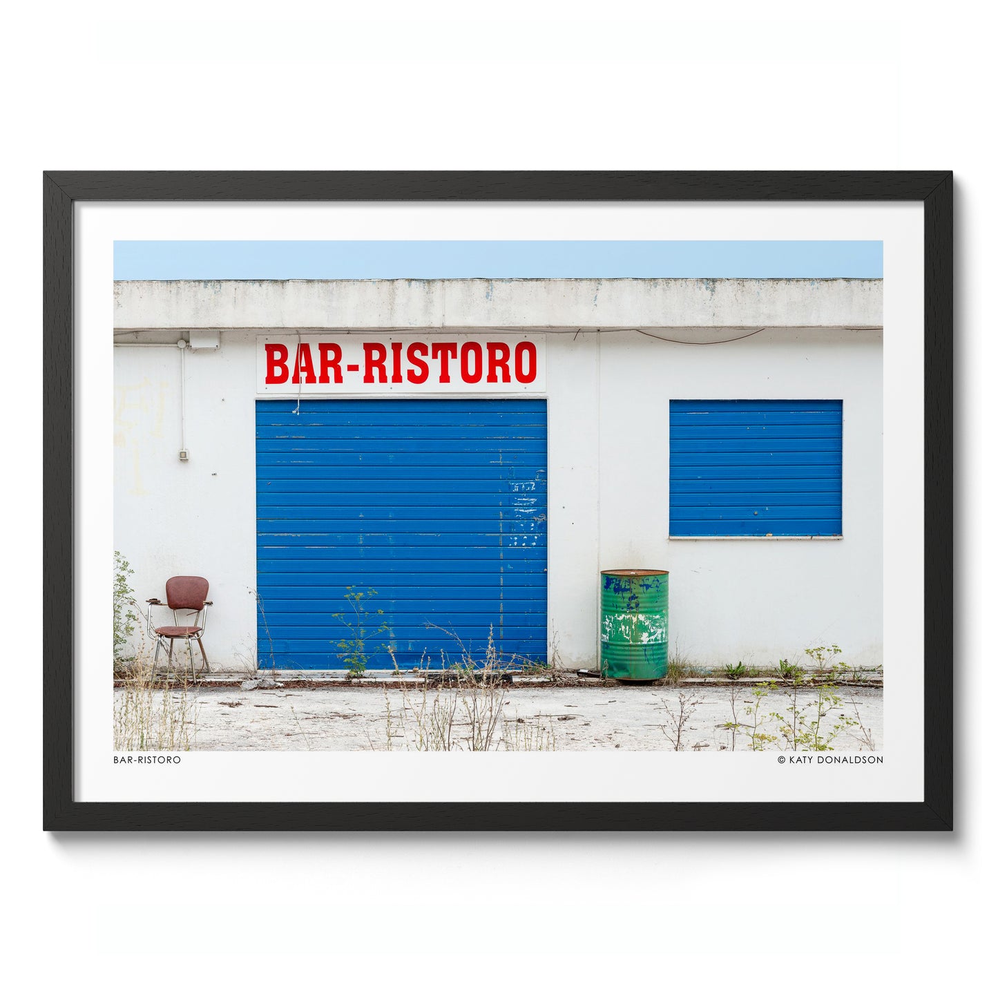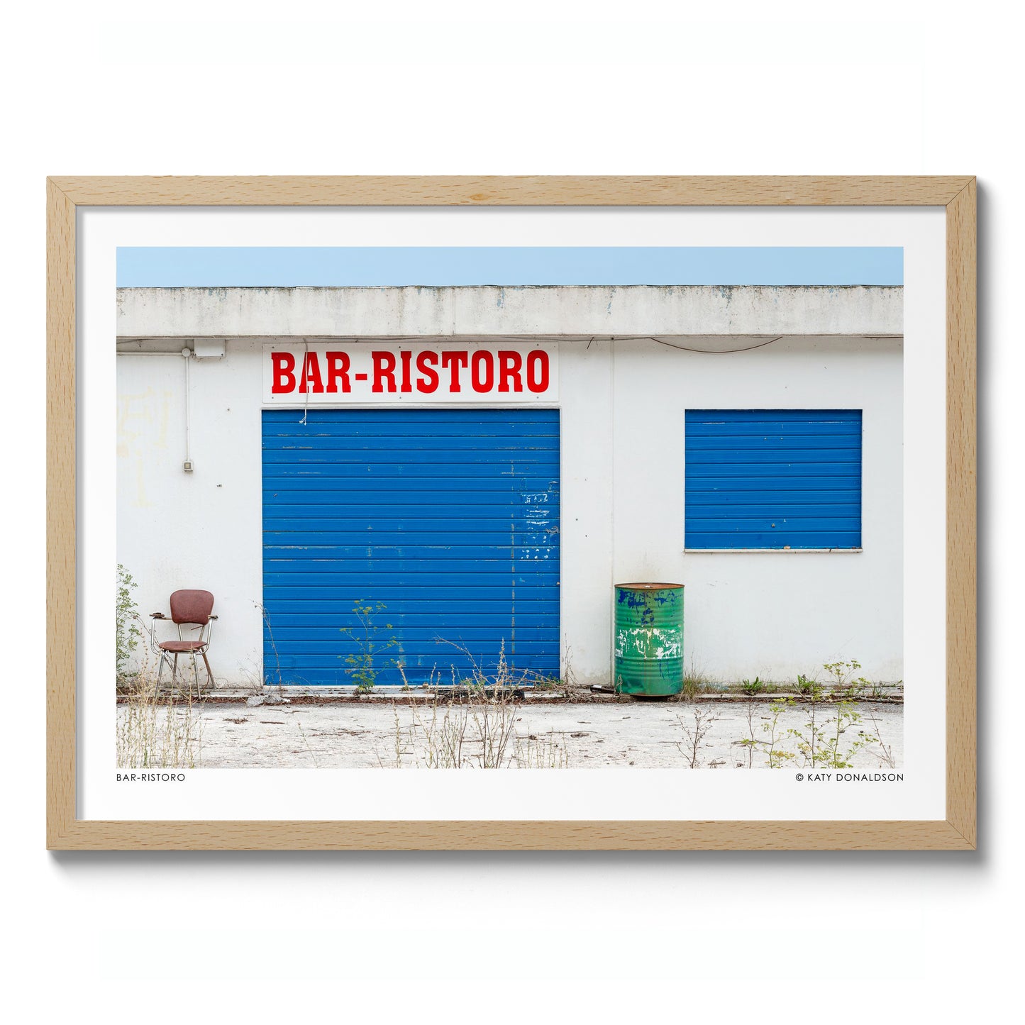 Capture the tranquil essence of a quiet Italian street with Katy Donaldson's "Bar-Ristoro Landscape" poster. This vibrant image features a minimalist scene showcasing vivid blue shutters and a matching door, contrasted with a bold red "BAR-RISTORO" sign. The deserted exterior, complemented by a lone chair and a weathered barrel, offers an intriguing glimpse into authentic Italian life. Perfect for travel and photography enthusiasts.