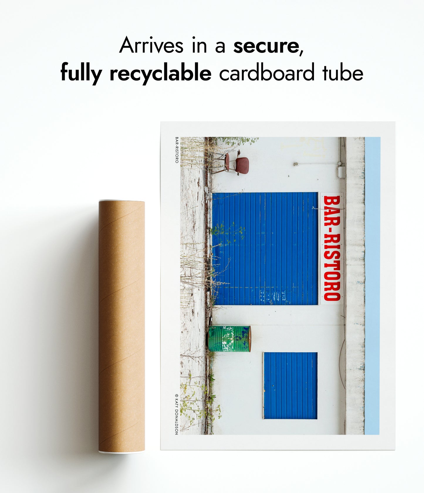 All orders are securely packed in recyclable, eco-friendly solutions. Frames are protected with sustainable bubble wrap alternatives inside thick boxes. Print only orders are shipped in heavy-duty cardboard tubes or protective hard-backed envelopes.
