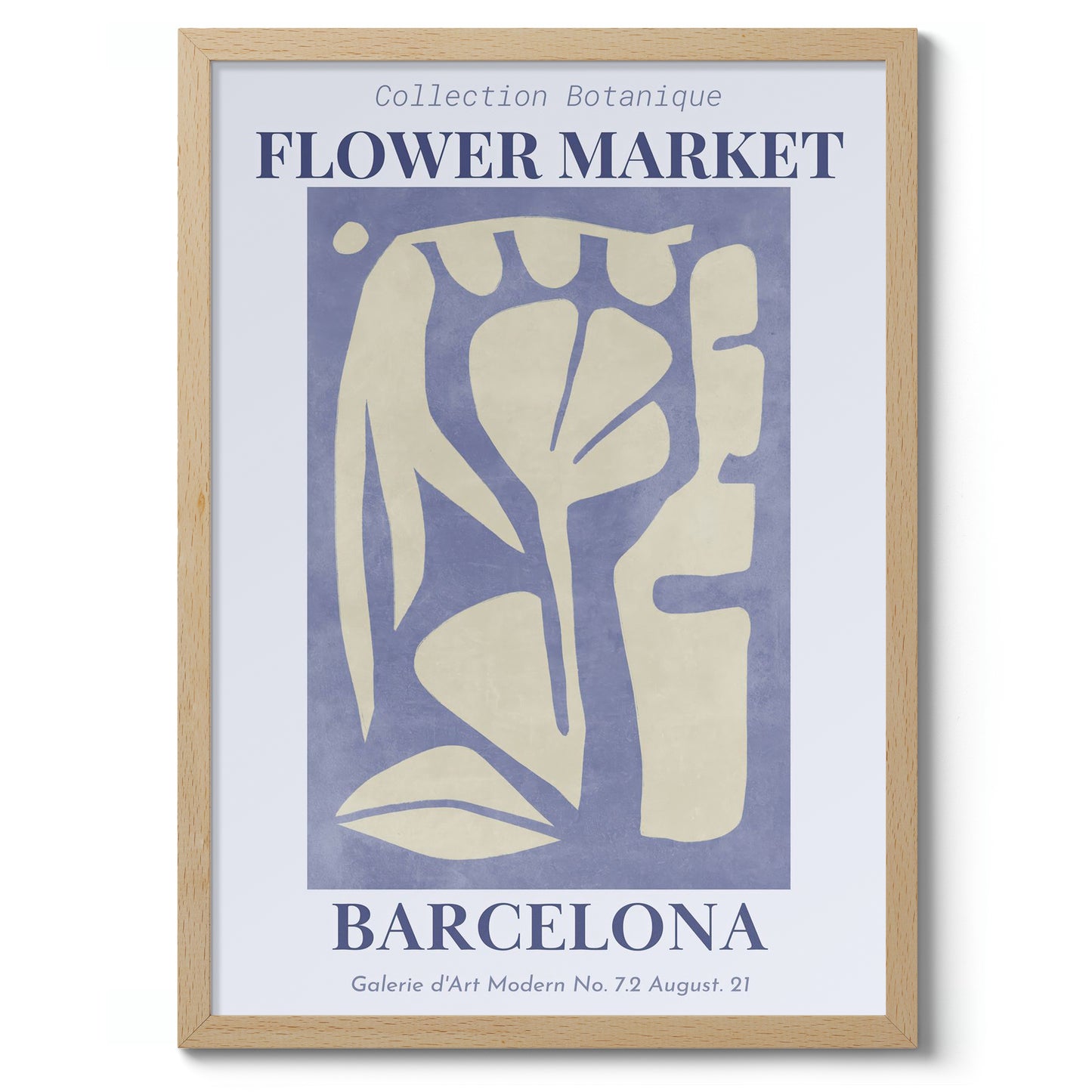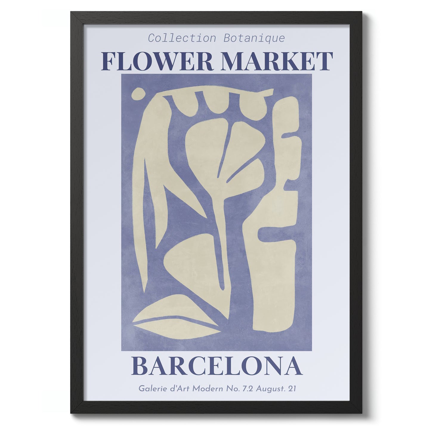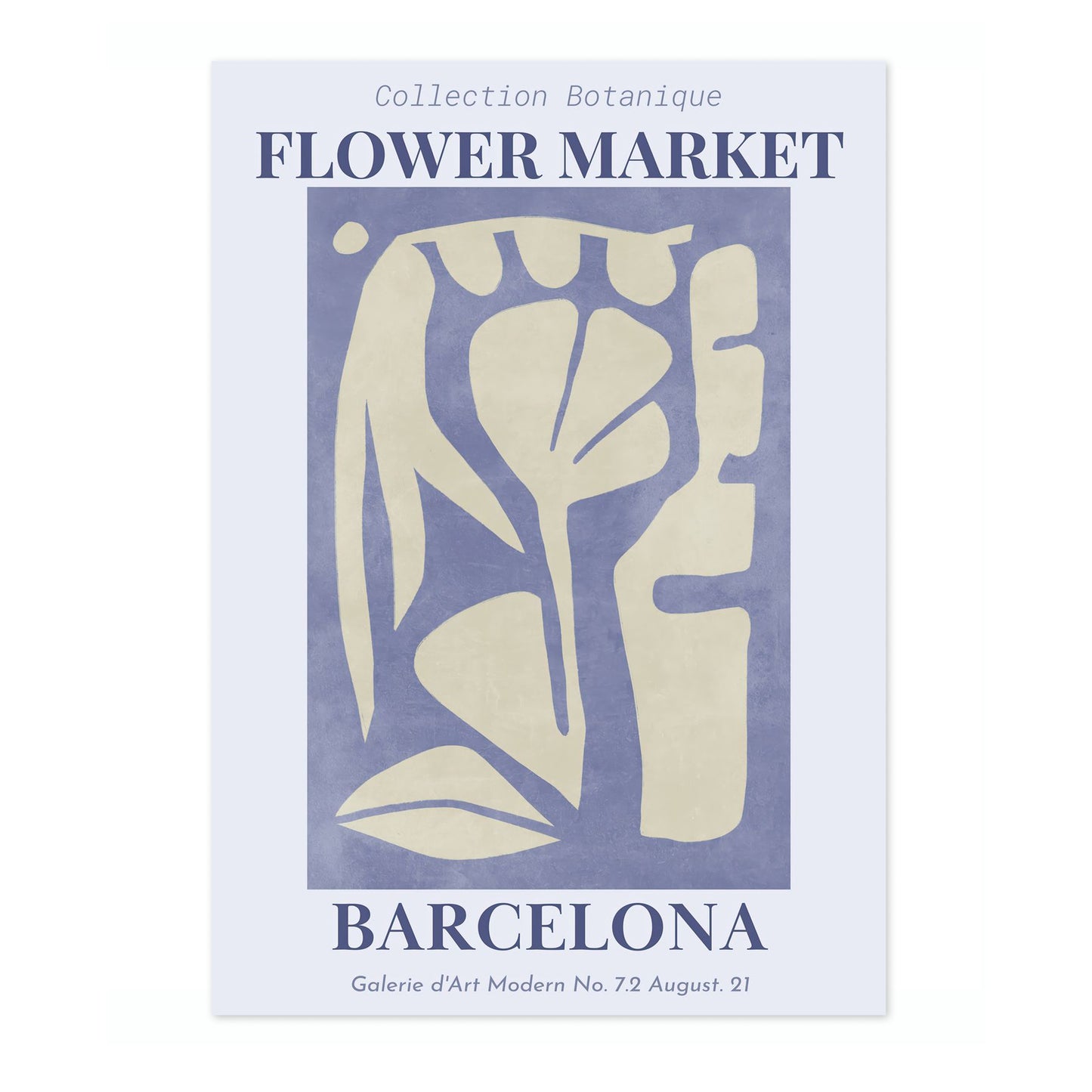 The "Barcelona Flower Market" poster captures the essence of vintage abstract art with a modern twist. Featuring stylized floral elements in calming blue tones, this graphic illustration embodies the lively spirit of a flower market in Spain's vibrant city, Barcelona. Ideal for those who appreciate botanical themes and boho aesthetics. Perfect for adding a cultural touch to your space.