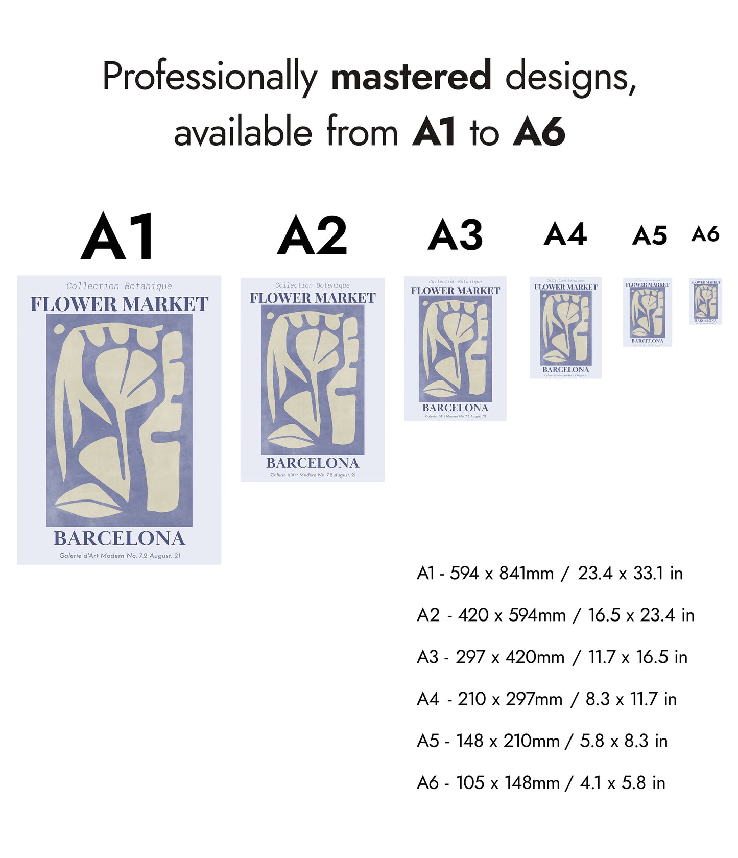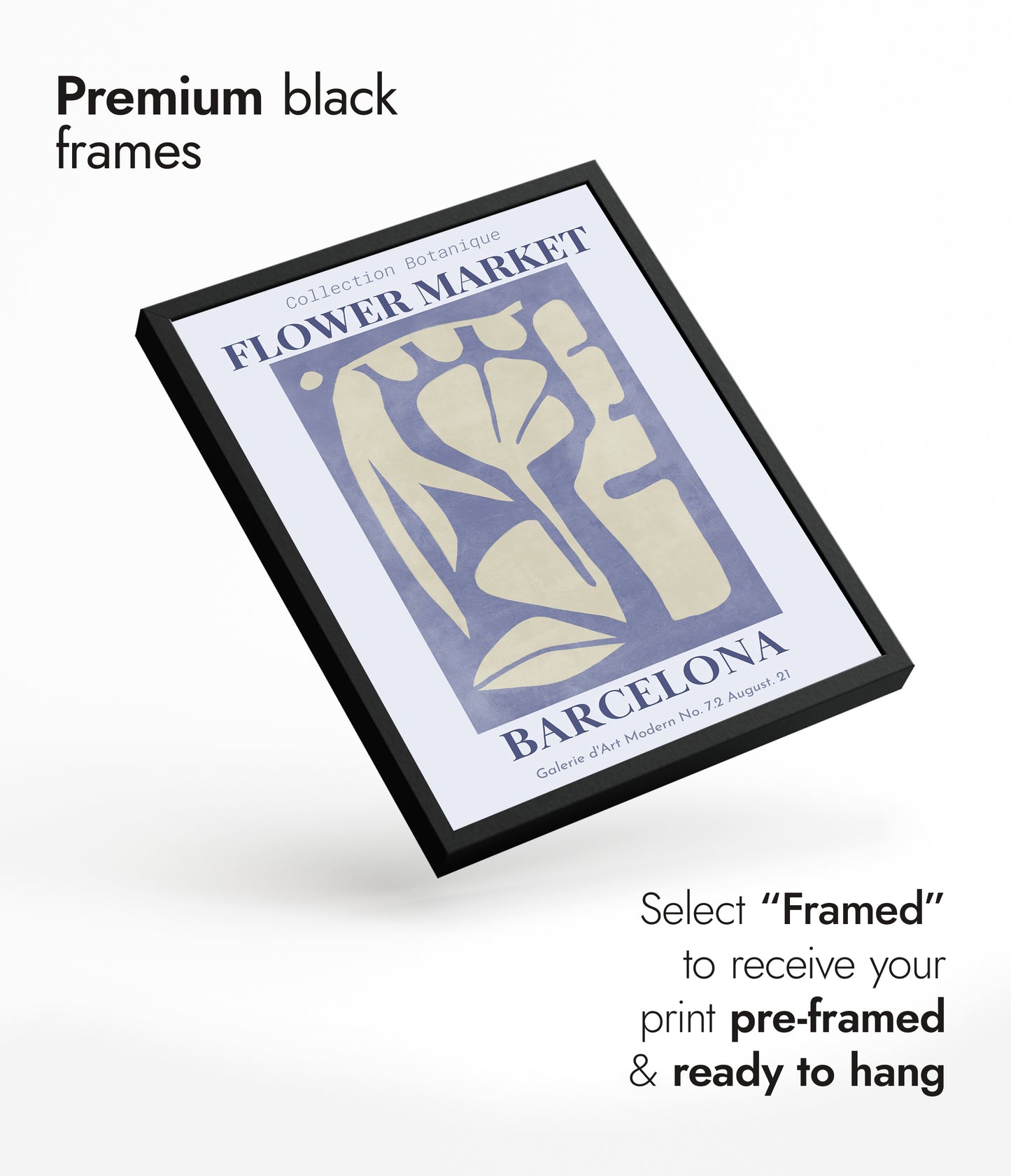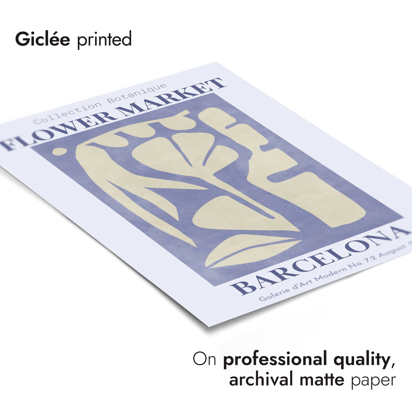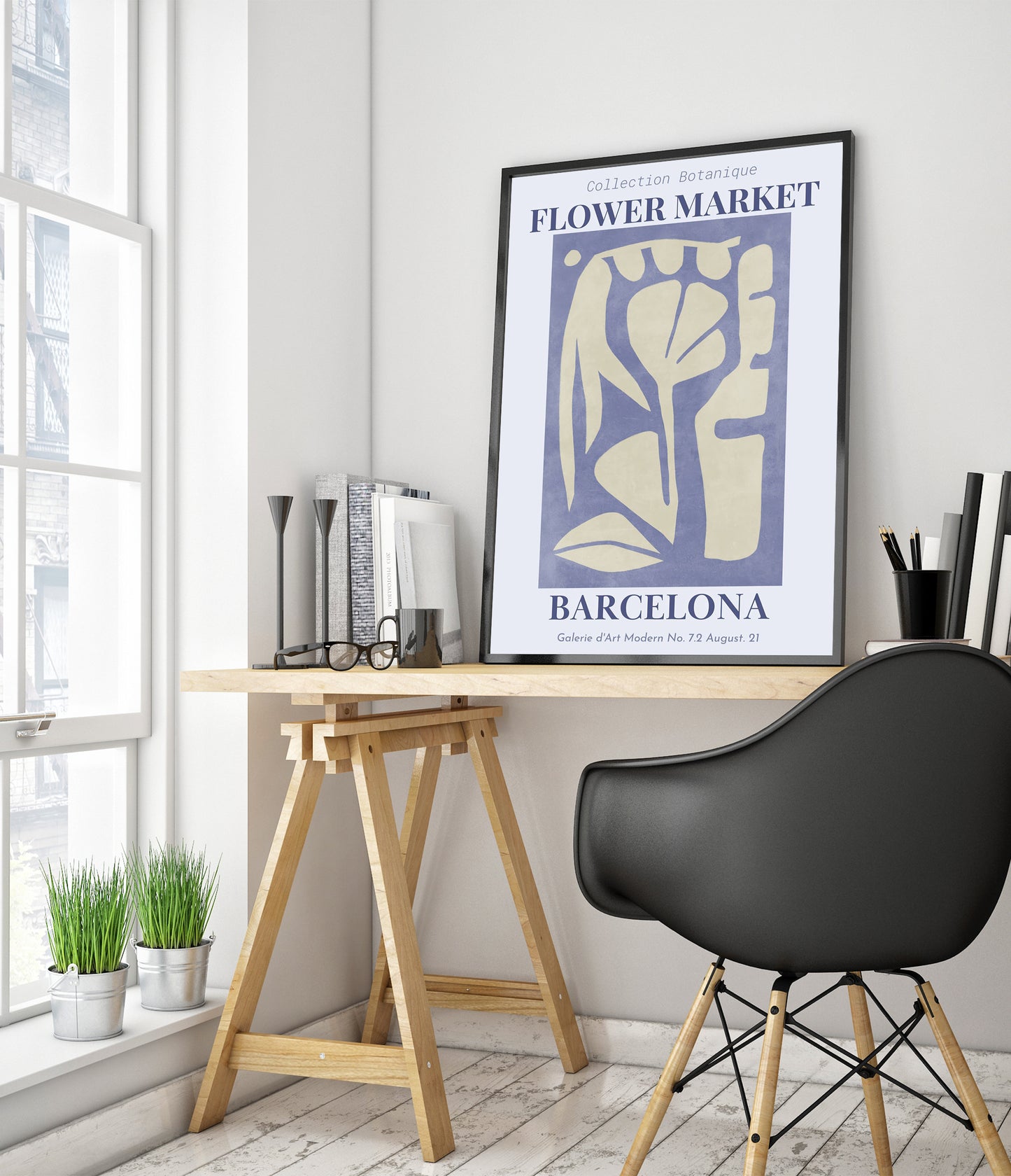 The "Barcelona Flower Market" poster captures the essence of vintage abstract art with a modern twist. Featuring stylized floral elements in calming blue tones, this graphic illustration embodies the lively spirit of a flower market in Spain's vibrant city, Barcelona. Ideal for those who appreciate botanical themes and boho aesthetics. Perfect for adding a cultural touch to your space.