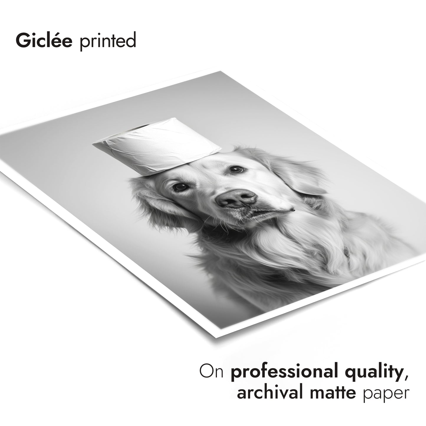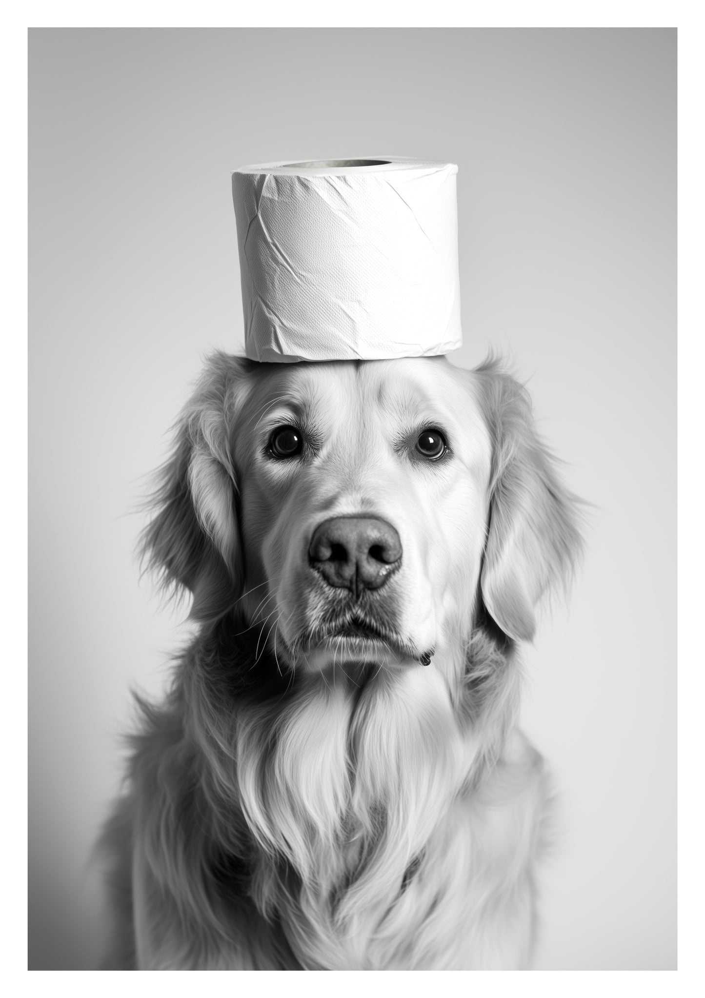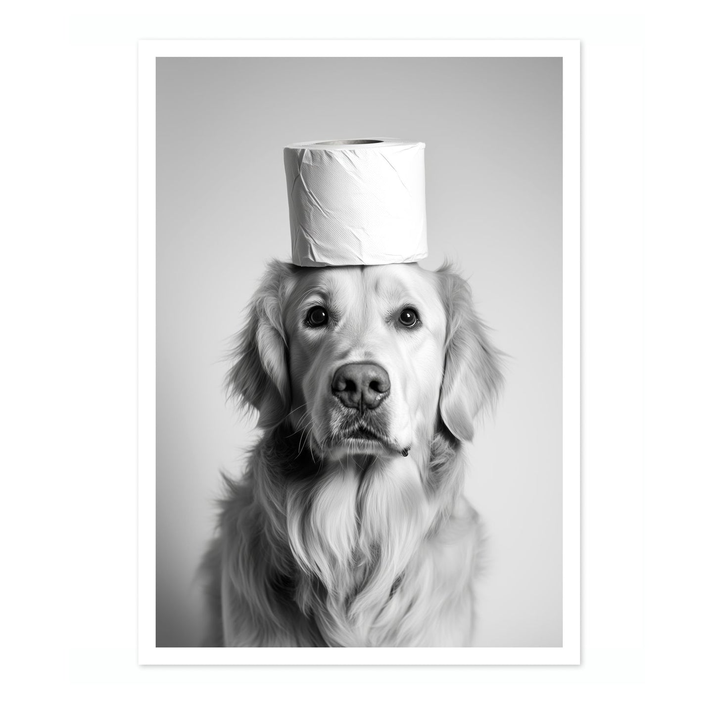 This black-and-white poster features a charming Golden Retriever with a roll of toilet paper balanced atop its head. Titled "Bark & Roll," the photographic artwork blends humor with elegance, highlighting the dog's gentle expression and intricately detailed fur. Perfect for adding a touch of whimsy to any bathroom decor.
