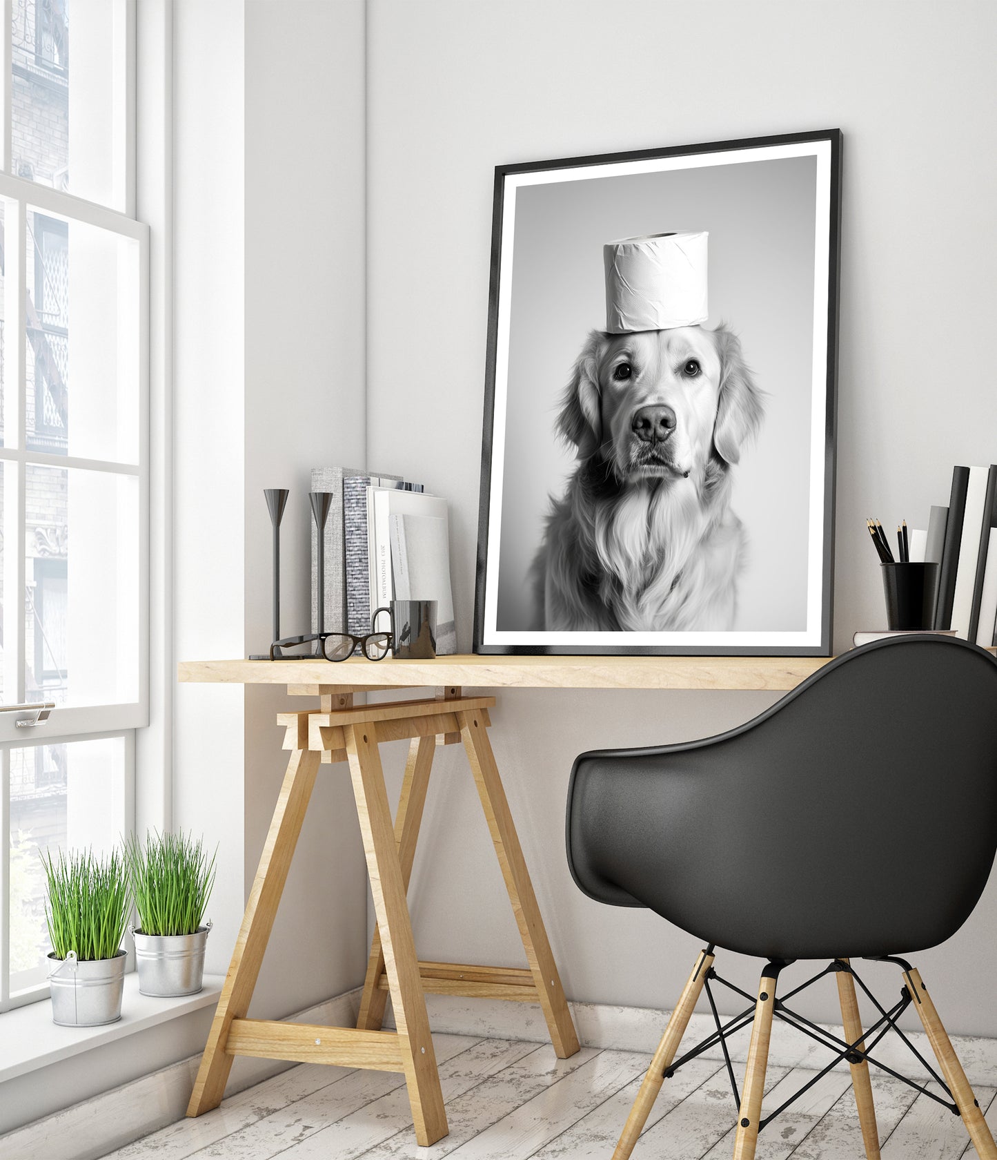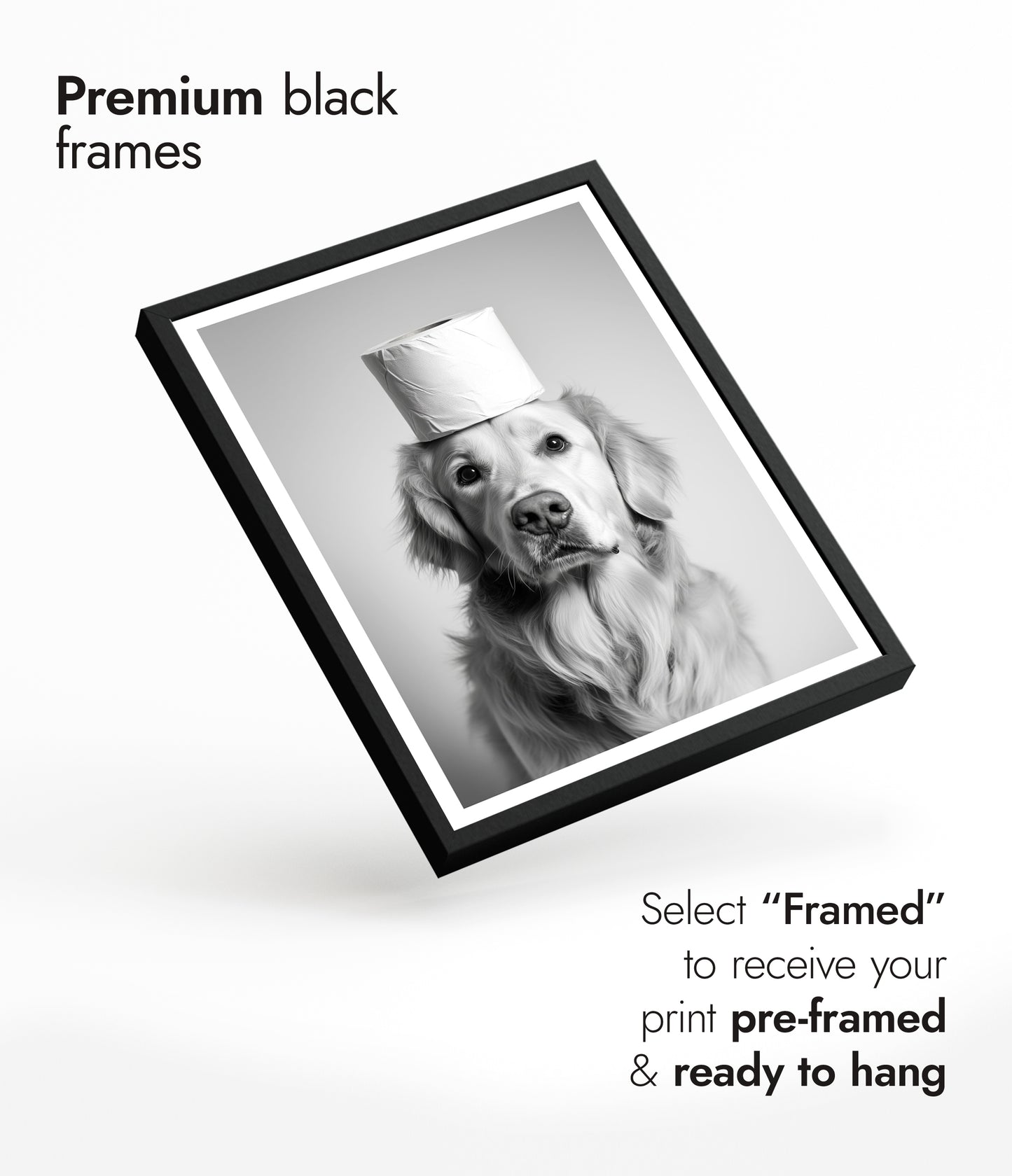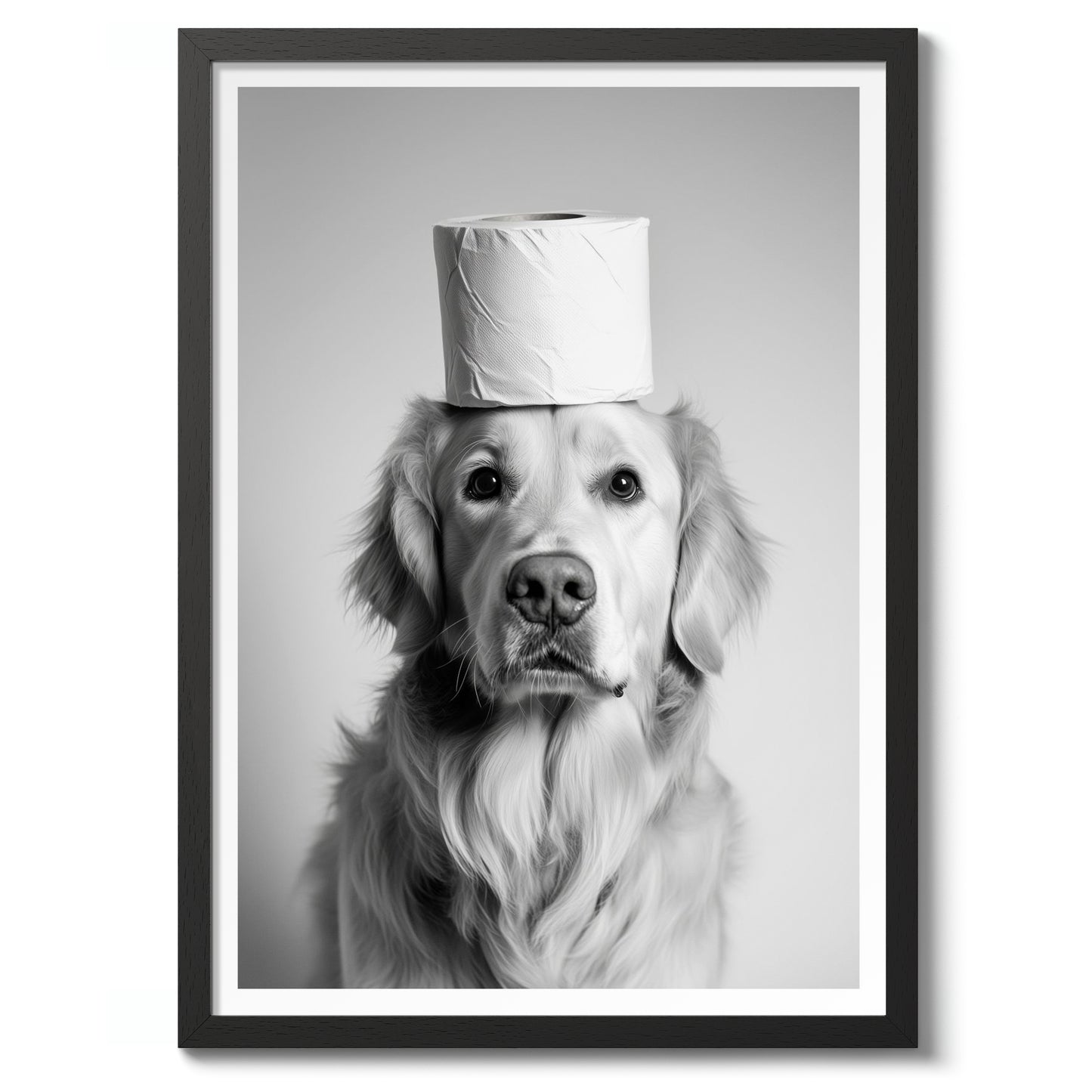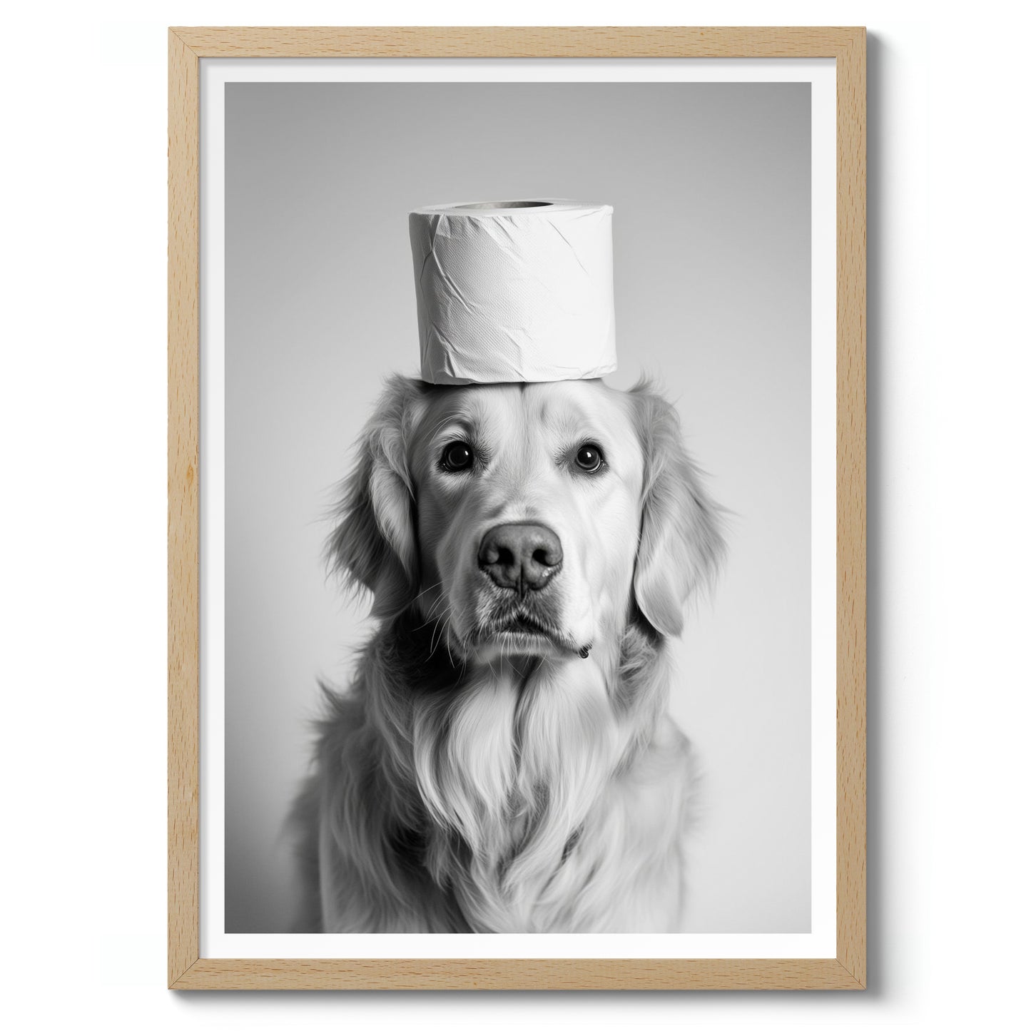 This black-and-white poster features a charming Golden Retriever with a roll of toilet paper balanced atop its head. Titled "Bark & Roll," the photographic artwork blends humor with elegance, highlighting the dog's gentle expression and intricately detailed fur. Perfect for adding a touch of whimsy to any bathroom decor.