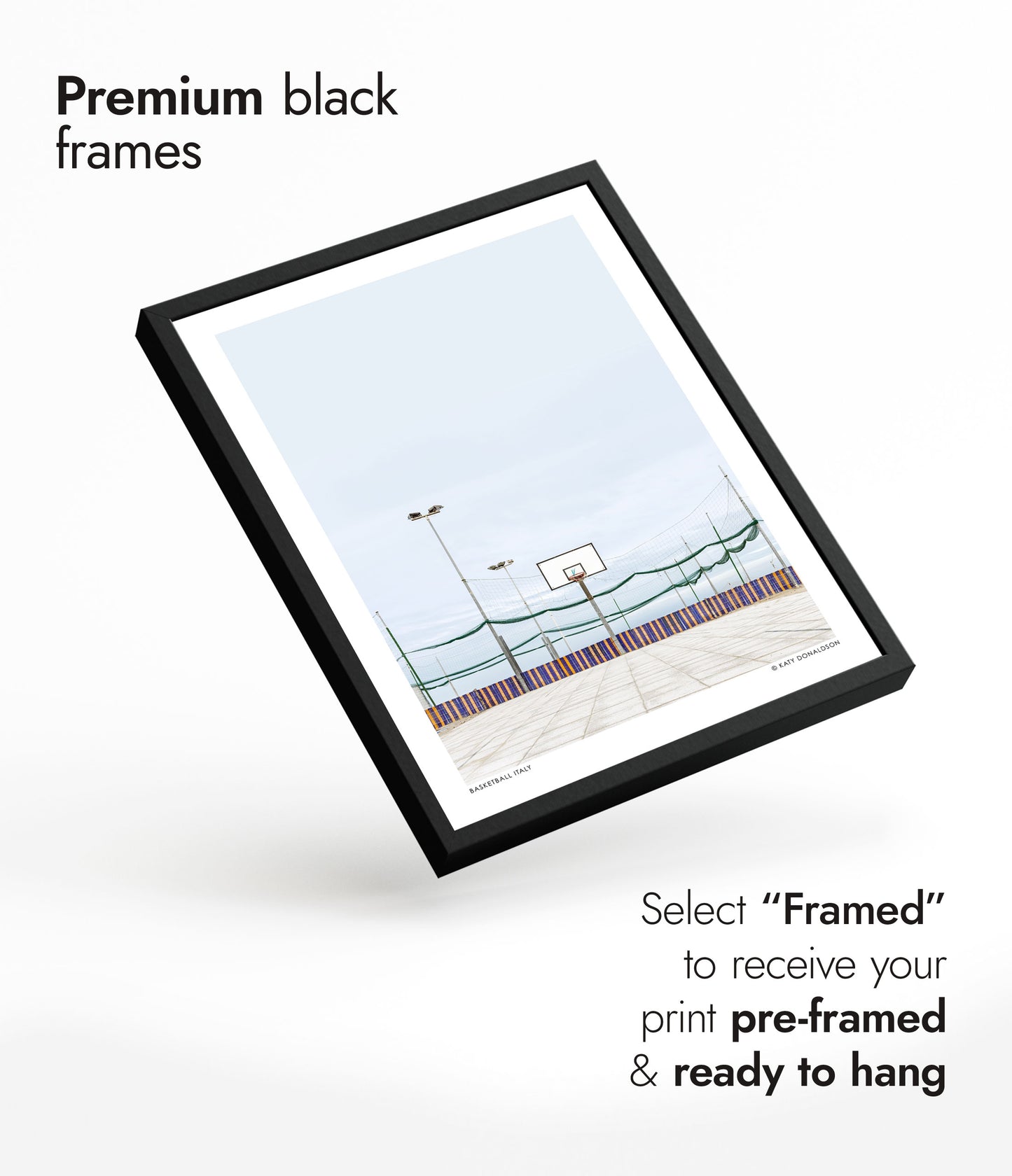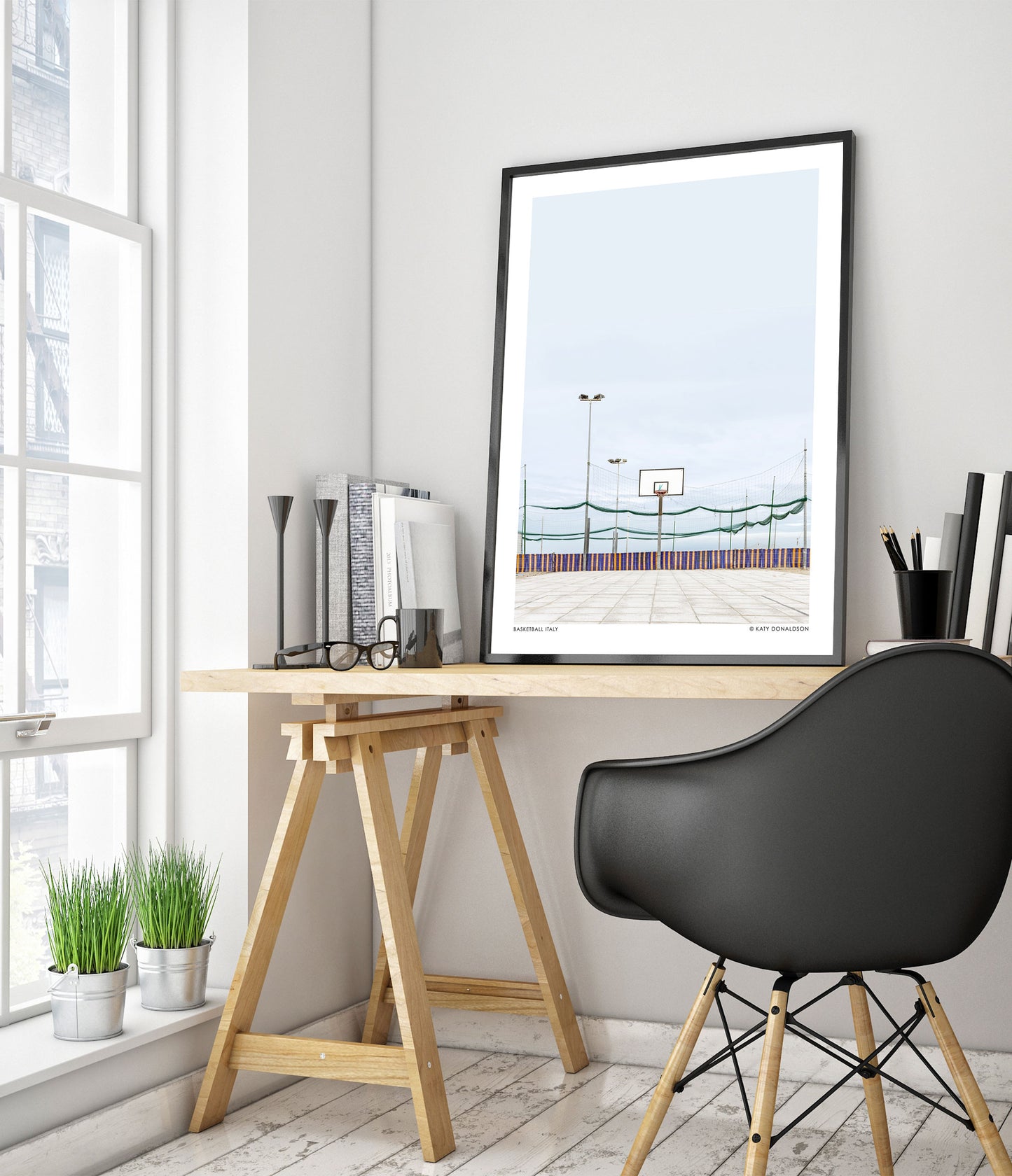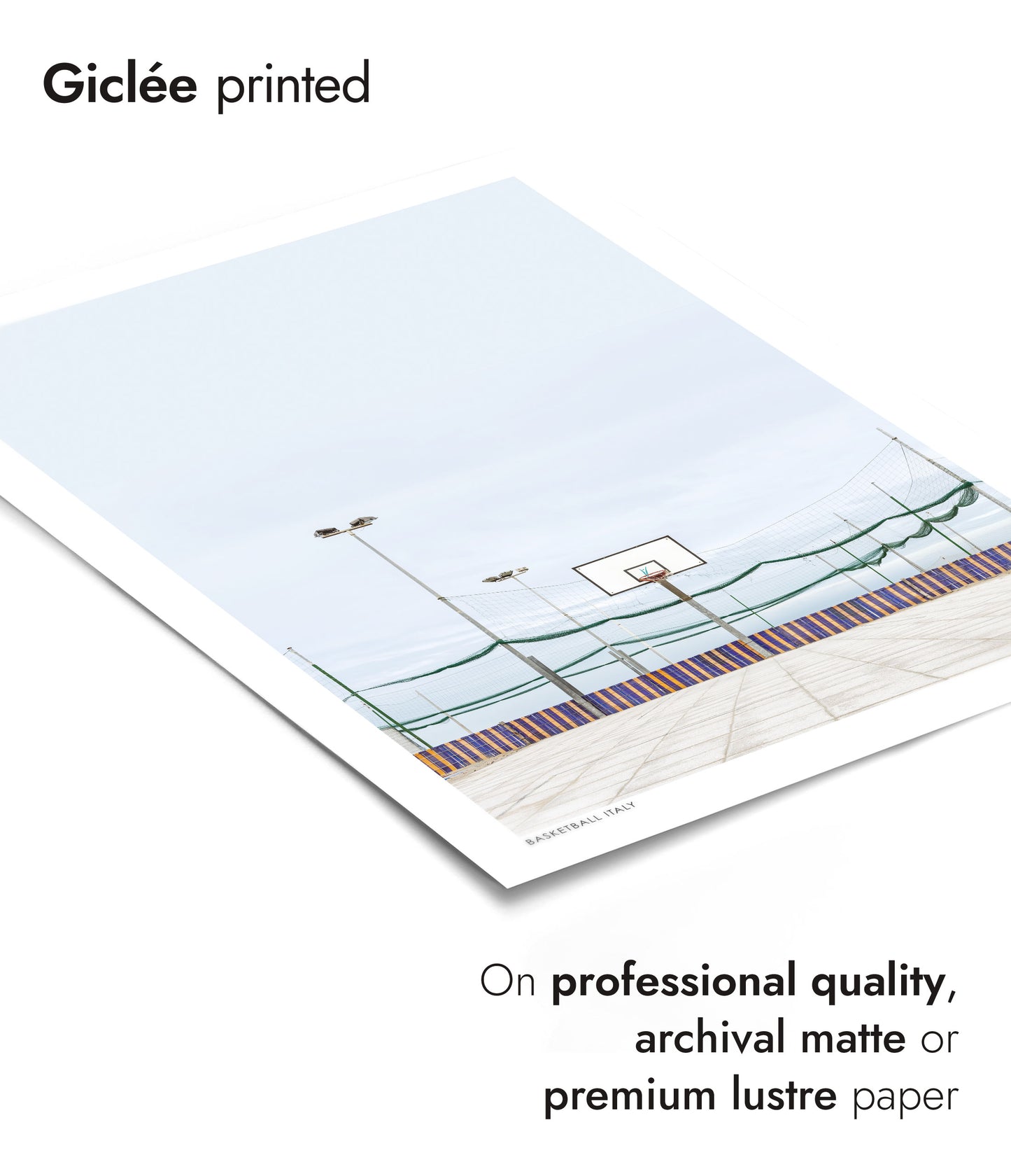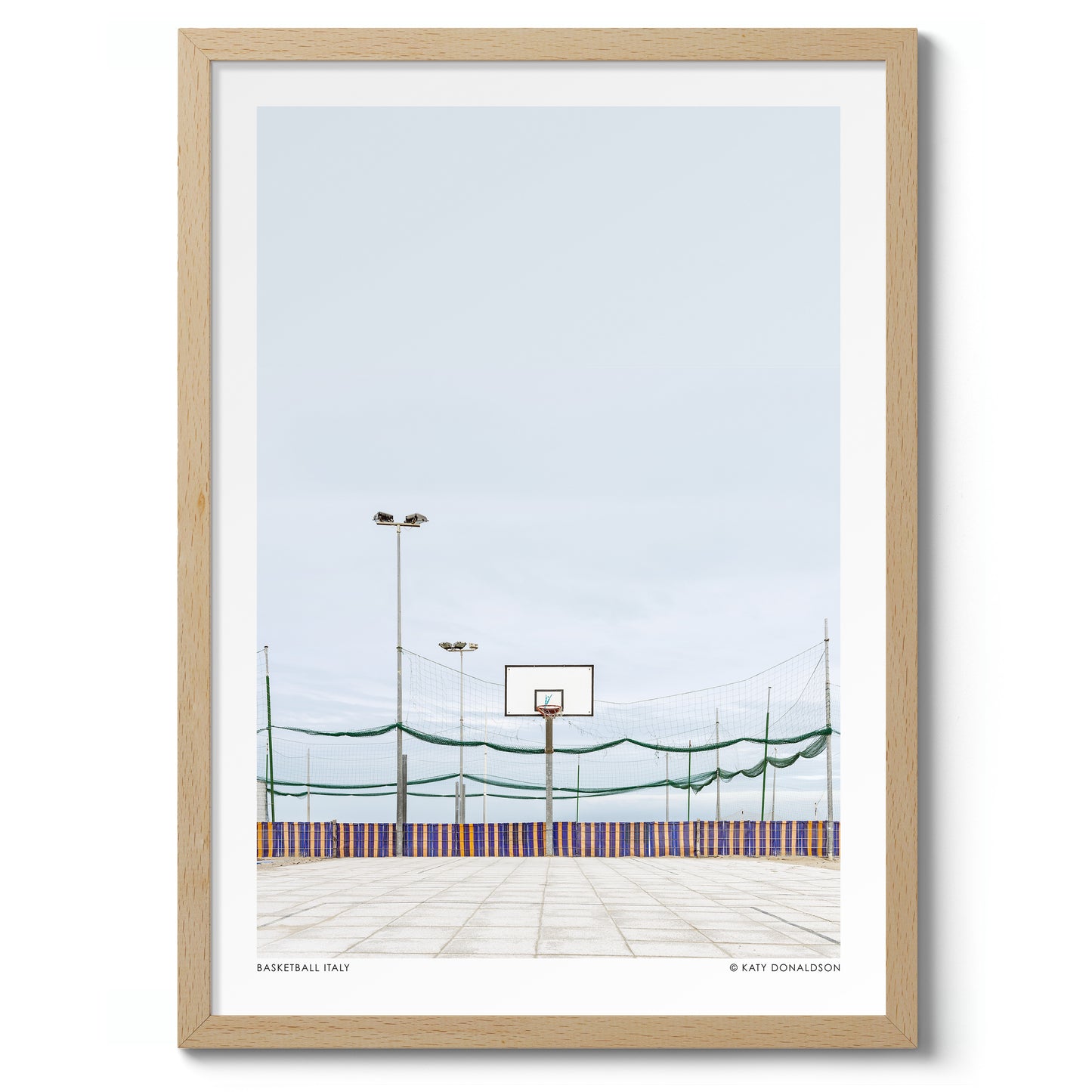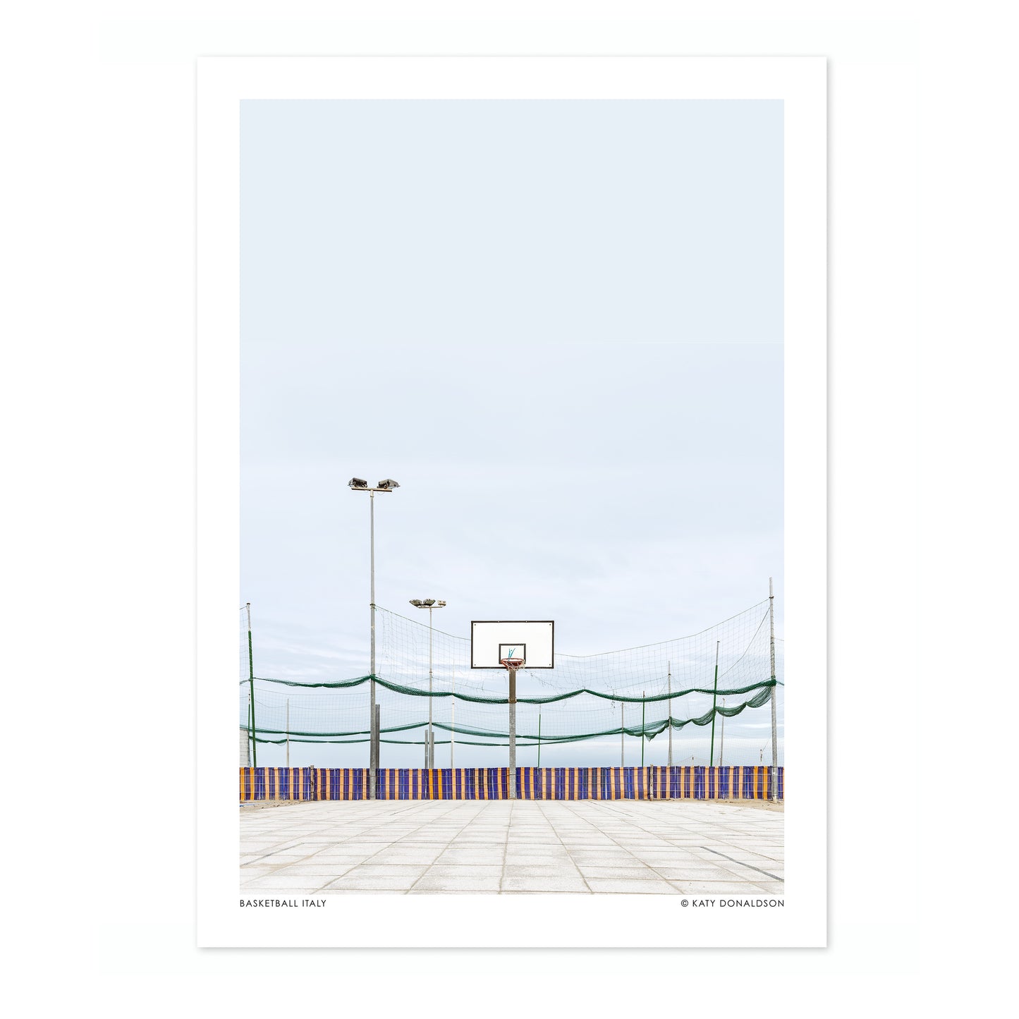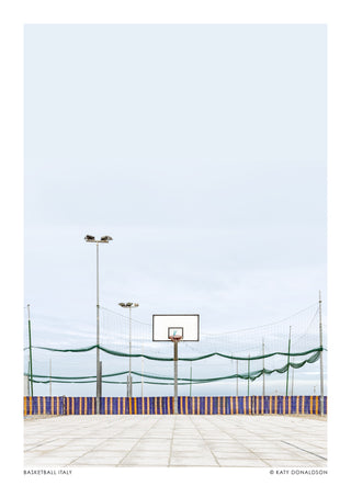 This minimalist photographic poster, titled "Basketball, Italy" by Katy Donaldson, captures a serene basketball court set against a clear sky. The image features a lone basketball hoop framed by urban lampposts and a colourful perimeter fence, reflecting modern, architectural simplicity. Ideal for sports enthusiasts and lovers of contemporary, minimalist art, this print adds a dynamic yet tranquil touch to any space.
