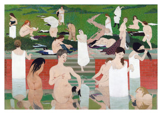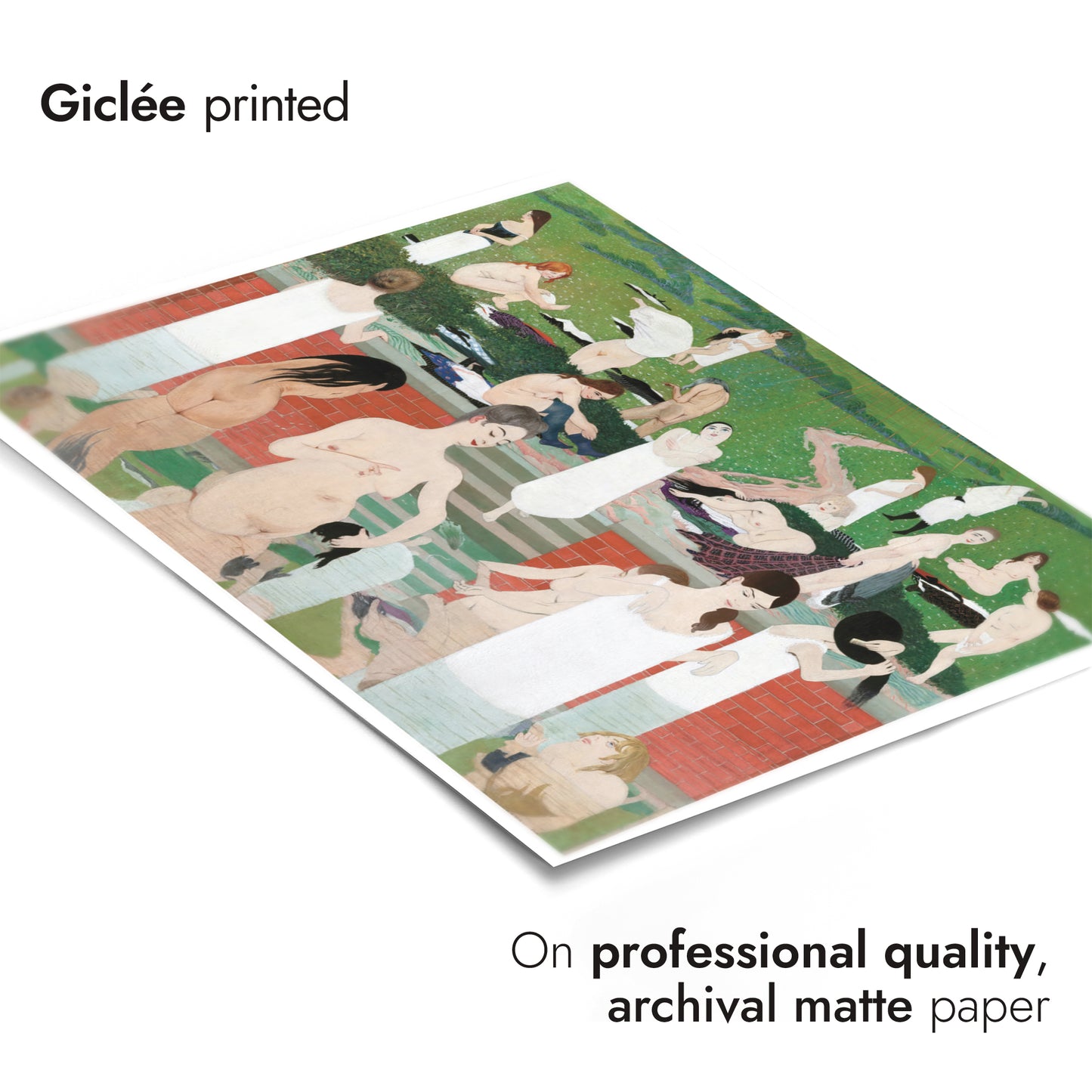 "Bathing on a Summer Evening" by Félix Vallotton captures tranquil female figures engaging in leisurely bathing activities in a lush, green landscape. Painted in 1892, this Impressionist poster features a blend of neo-impressionistic styles and vibrant colors, with the use of red and white contrasting against the greenery. The scene is serene yet dynamic, reflecting a harmonious connection between nature and humanity.