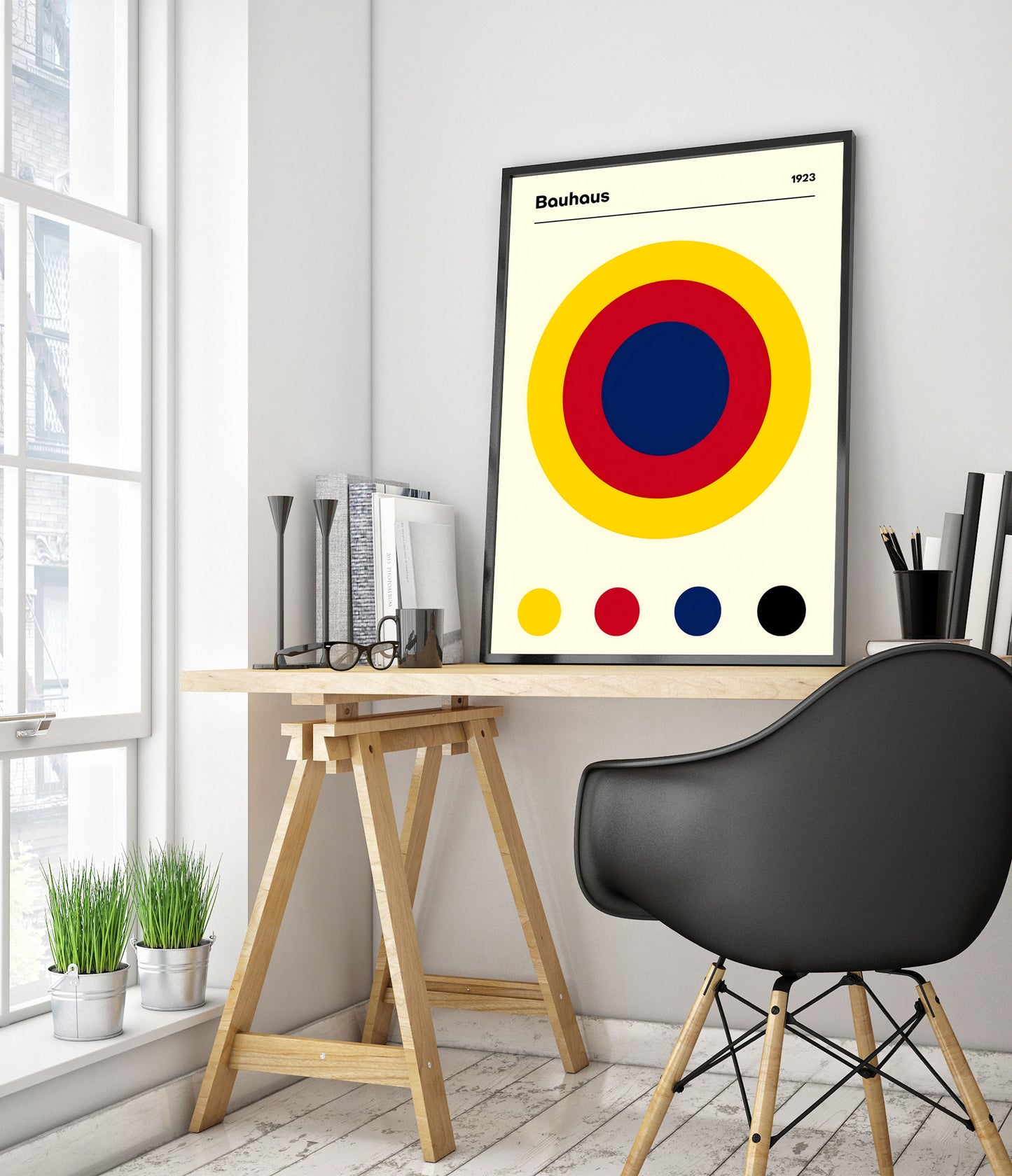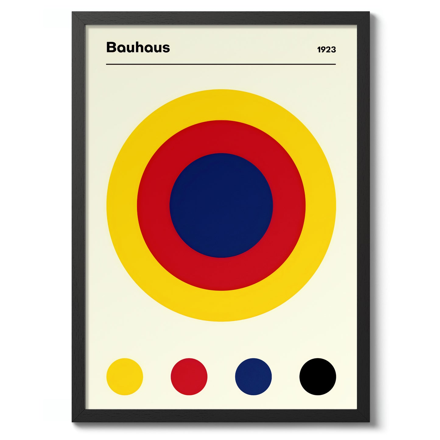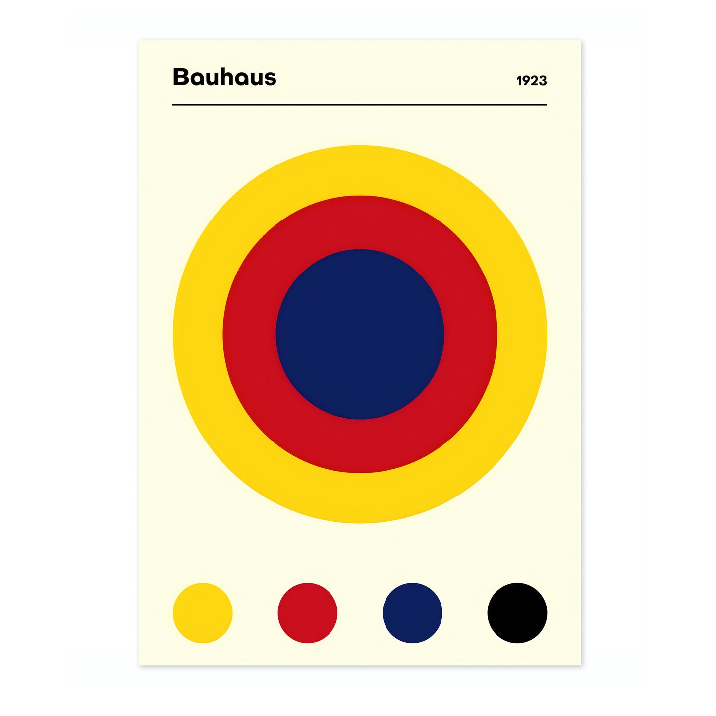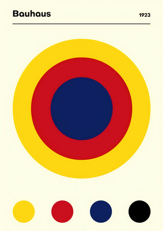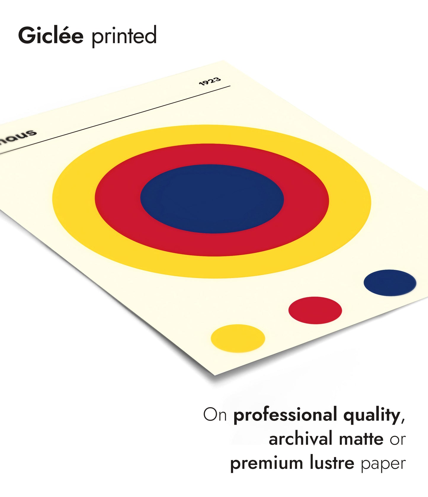 The "Circles" poster exemplifies Bauhaus design with minimalist, geometric elements. Vivid concentric circles in primary colours set against a clean white background bring a bold, modern aesthetic. Ideal for those who appreciate abstract forms and mid-century art. Perfect for enhancing any space with its timeless Bauhaus style and vibrant visual appeal.