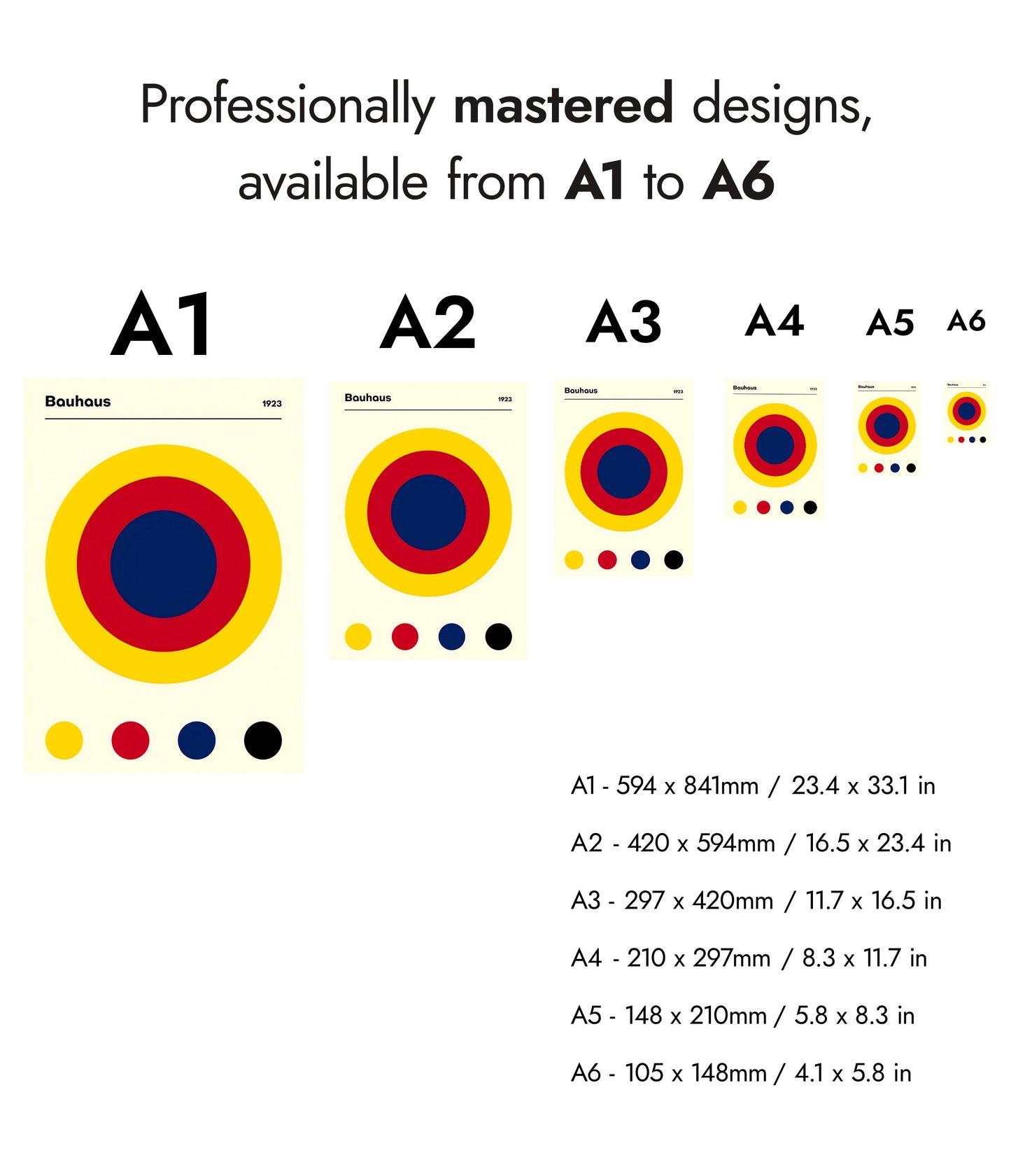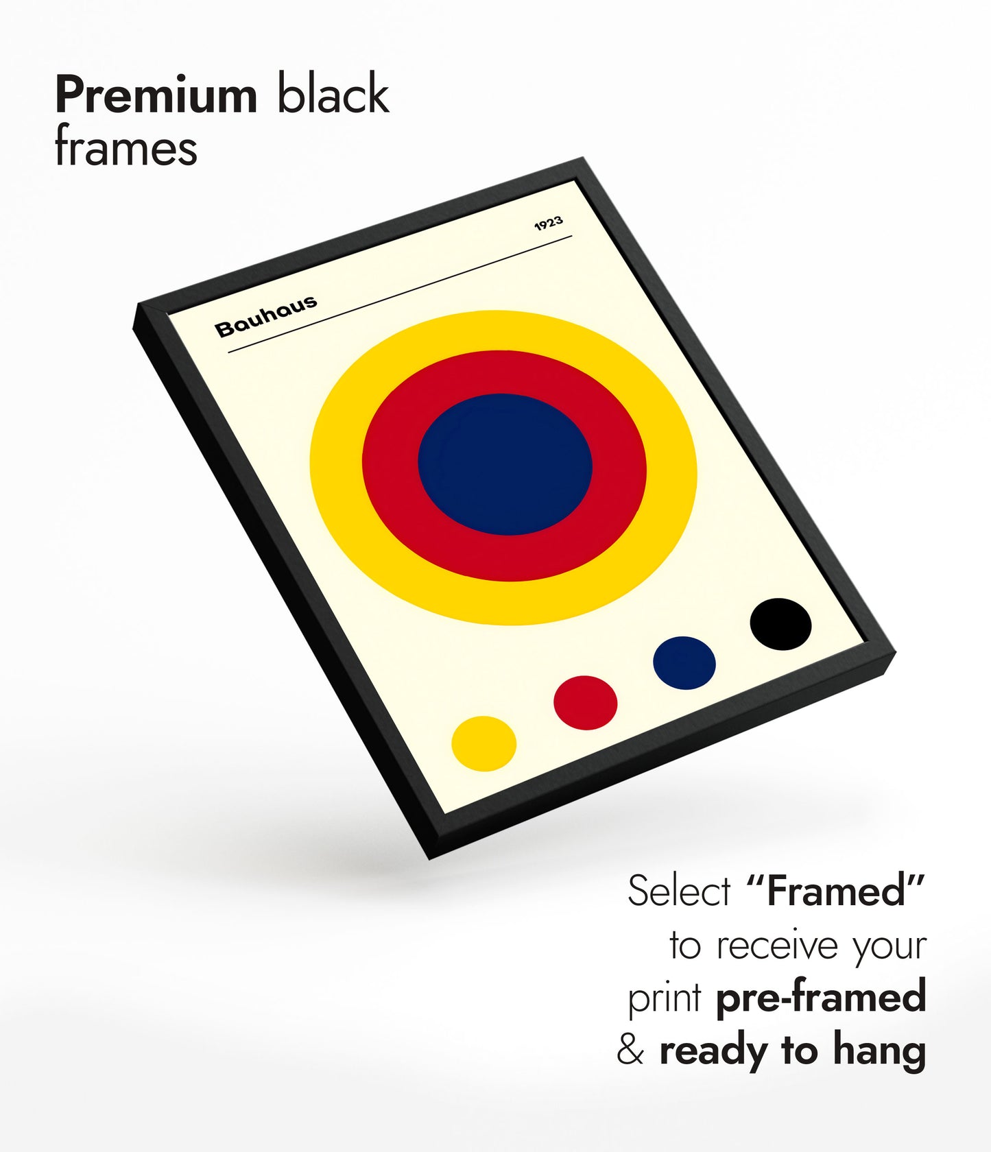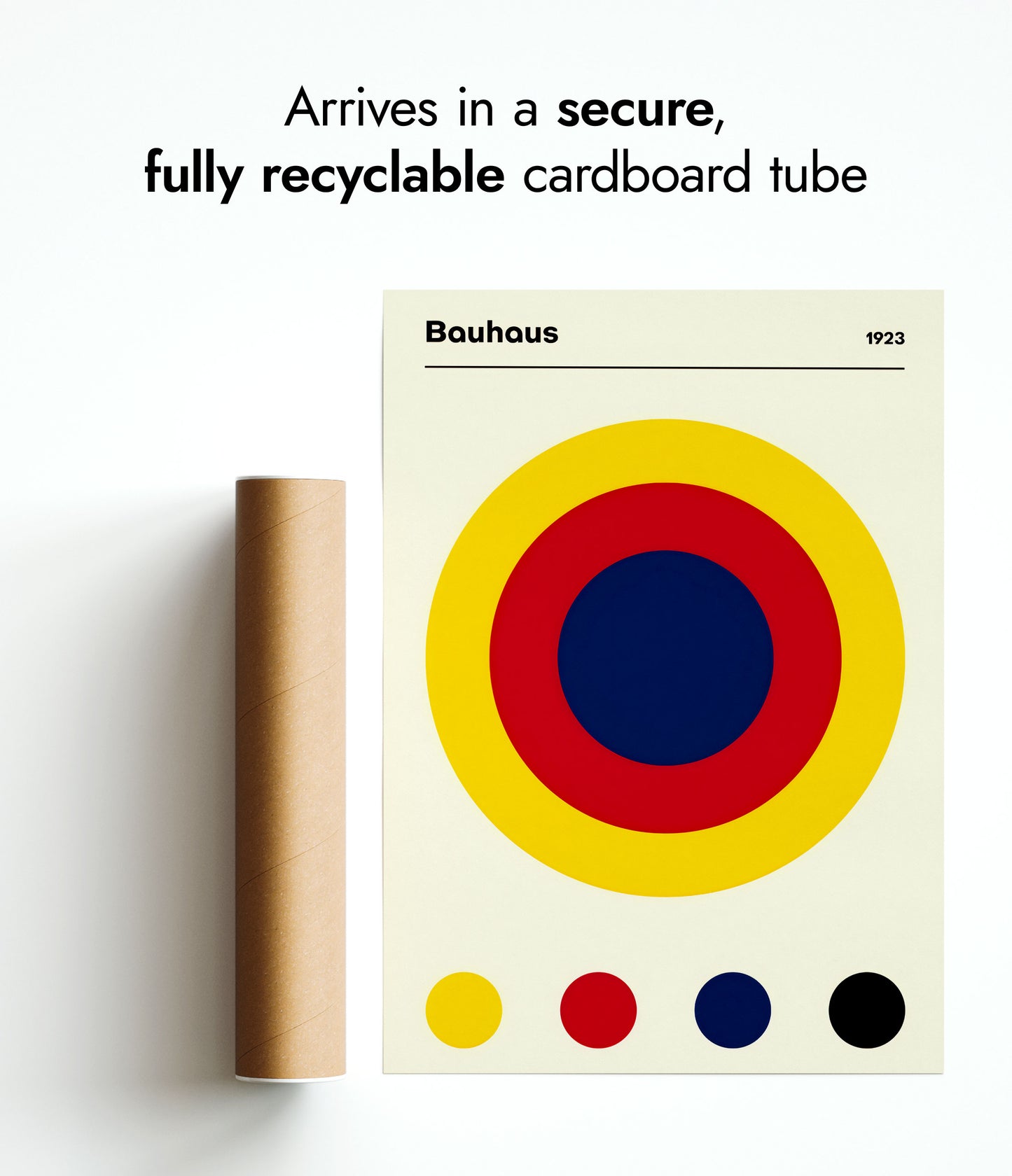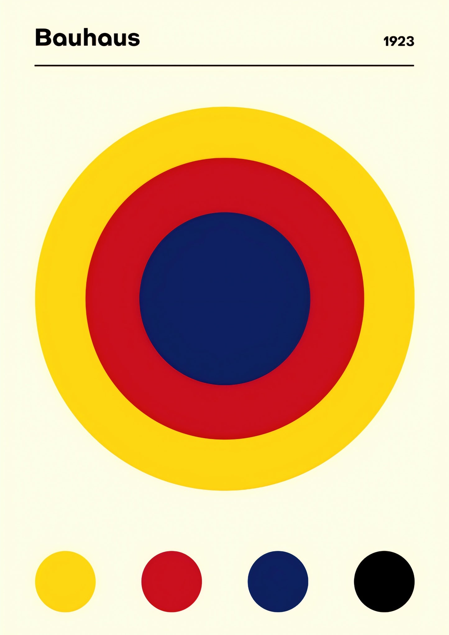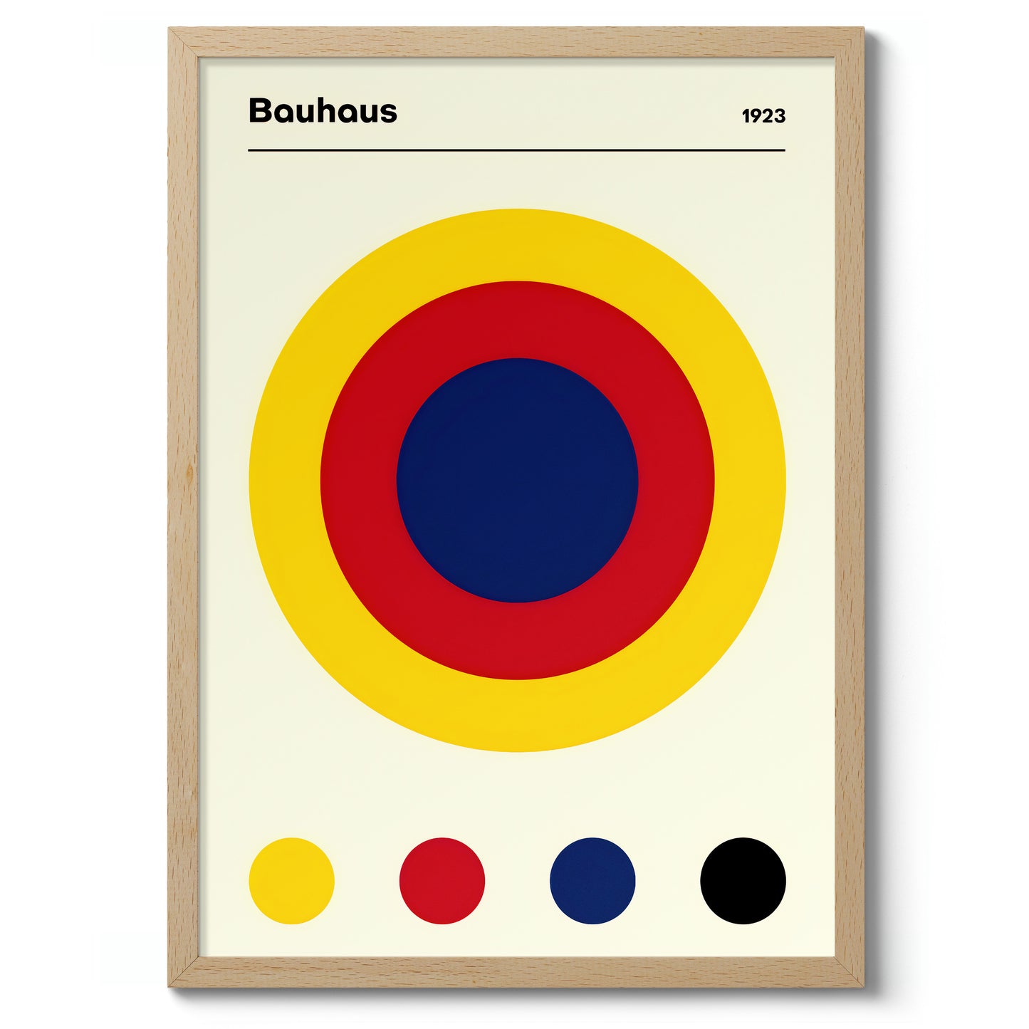 The "Circles" poster exemplifies Bauhaus design with minimalist, geometric elements. Vivid concentric circles in primary colours set against a clean white background bring a bold, modern aesthetic. Ideal for those who appreciate abstract forms and mid-century art. Perfect for enhancing any space with its timeless Bauhaus style and vibrant visual appeal.