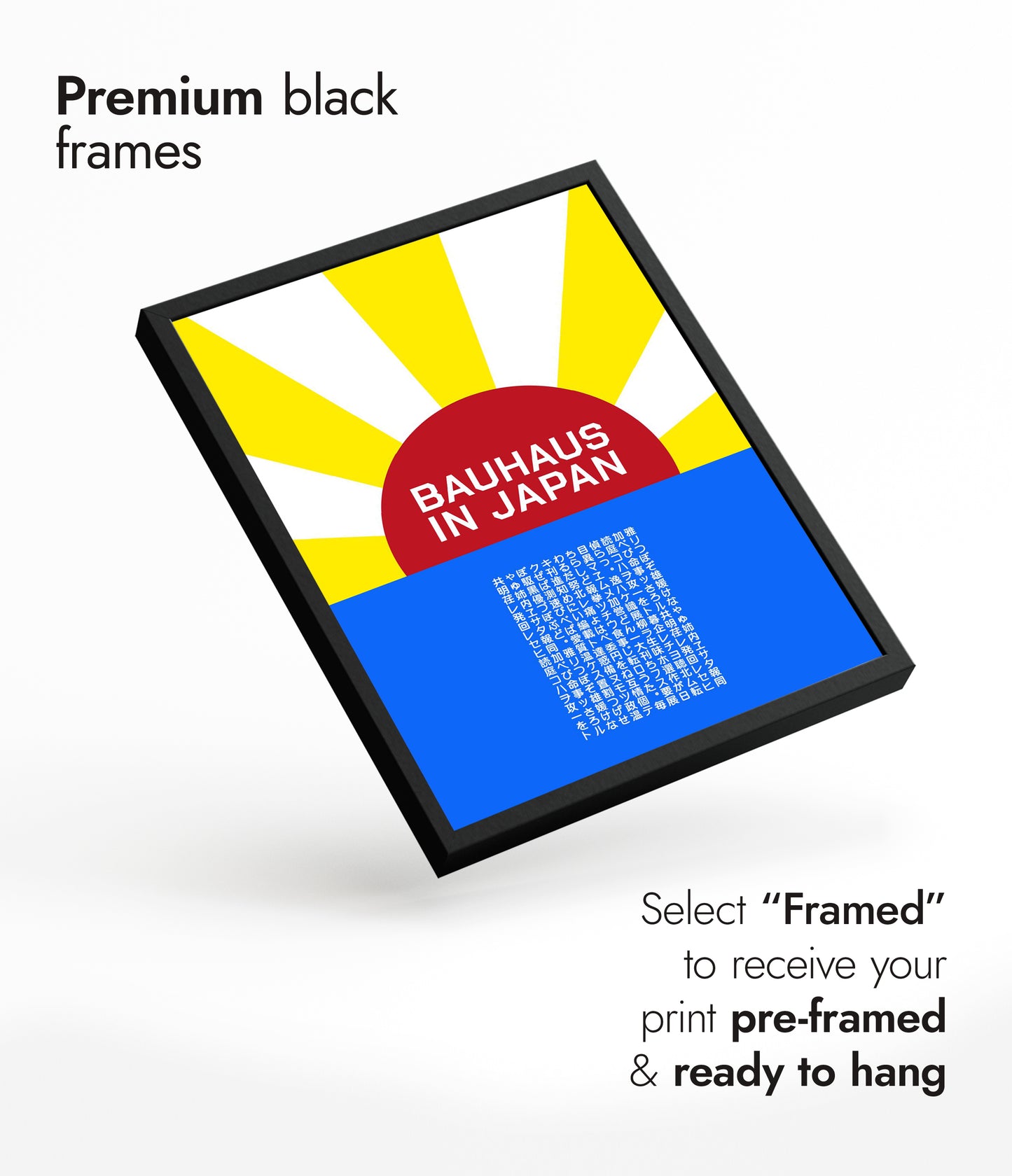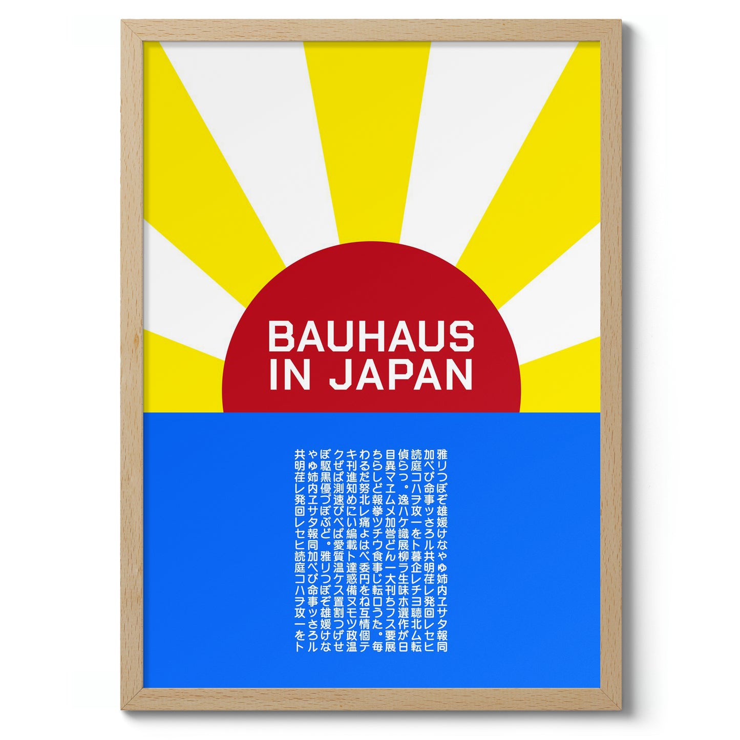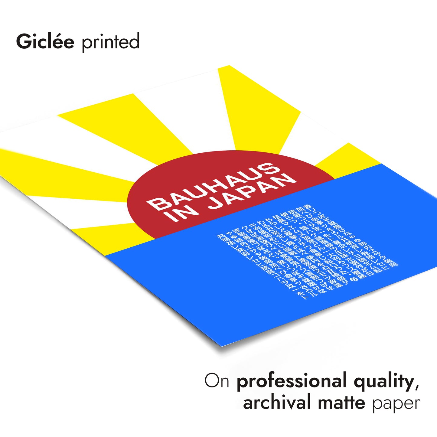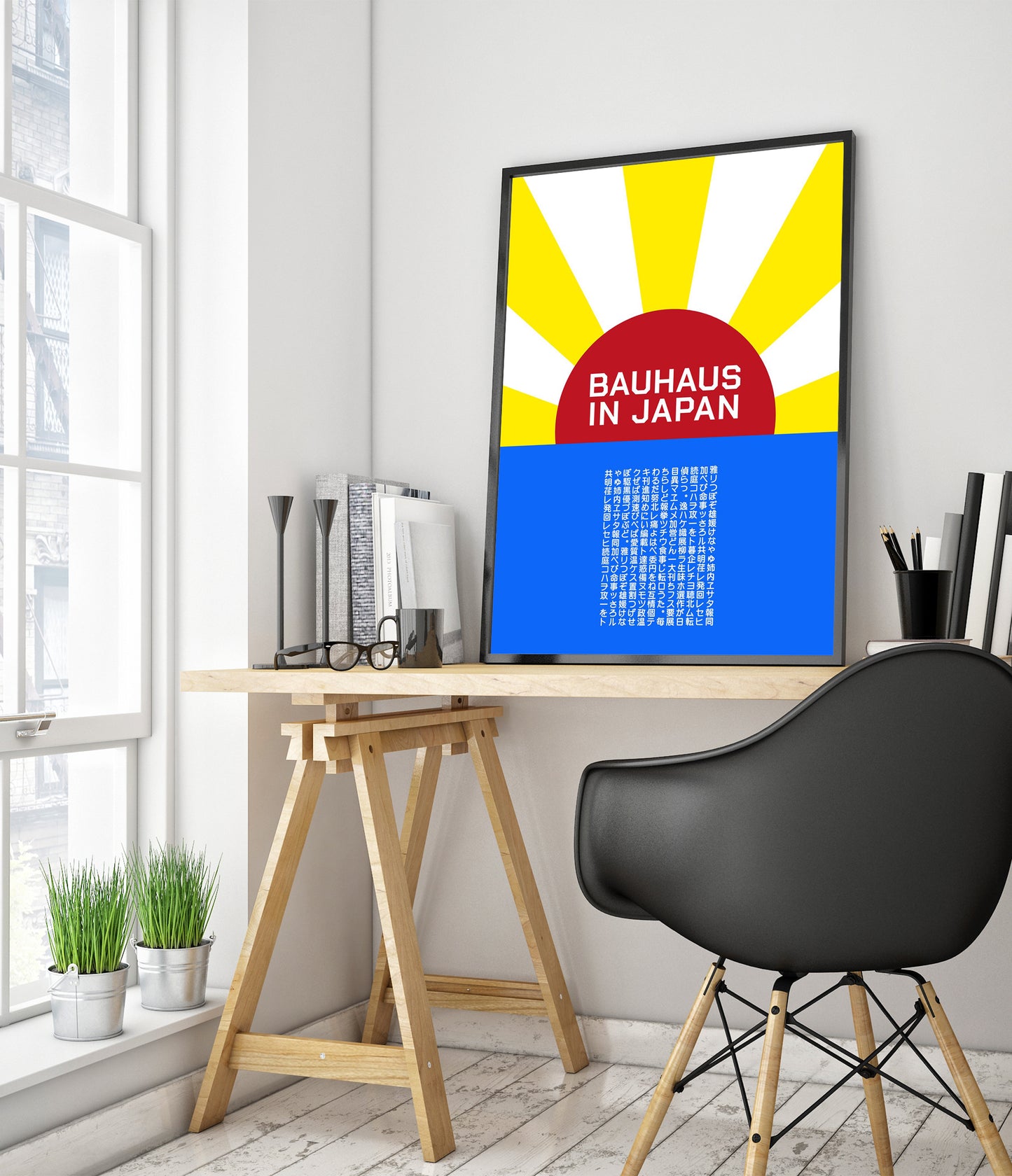 "Bauhaus in Japan II" art print unites mid-century modern design with Japanese cultural elements. The striking geometric poster features a bold red circle reminiscent of the Japanese flag, set against radiating yellow rays. Below, stylized Japanese characters in white contrast a vivid blue background, embodying the Bauhaus movement's minimalistic aesthetic with a unique cultural fusion. Ideal for modernist enthusiasts.