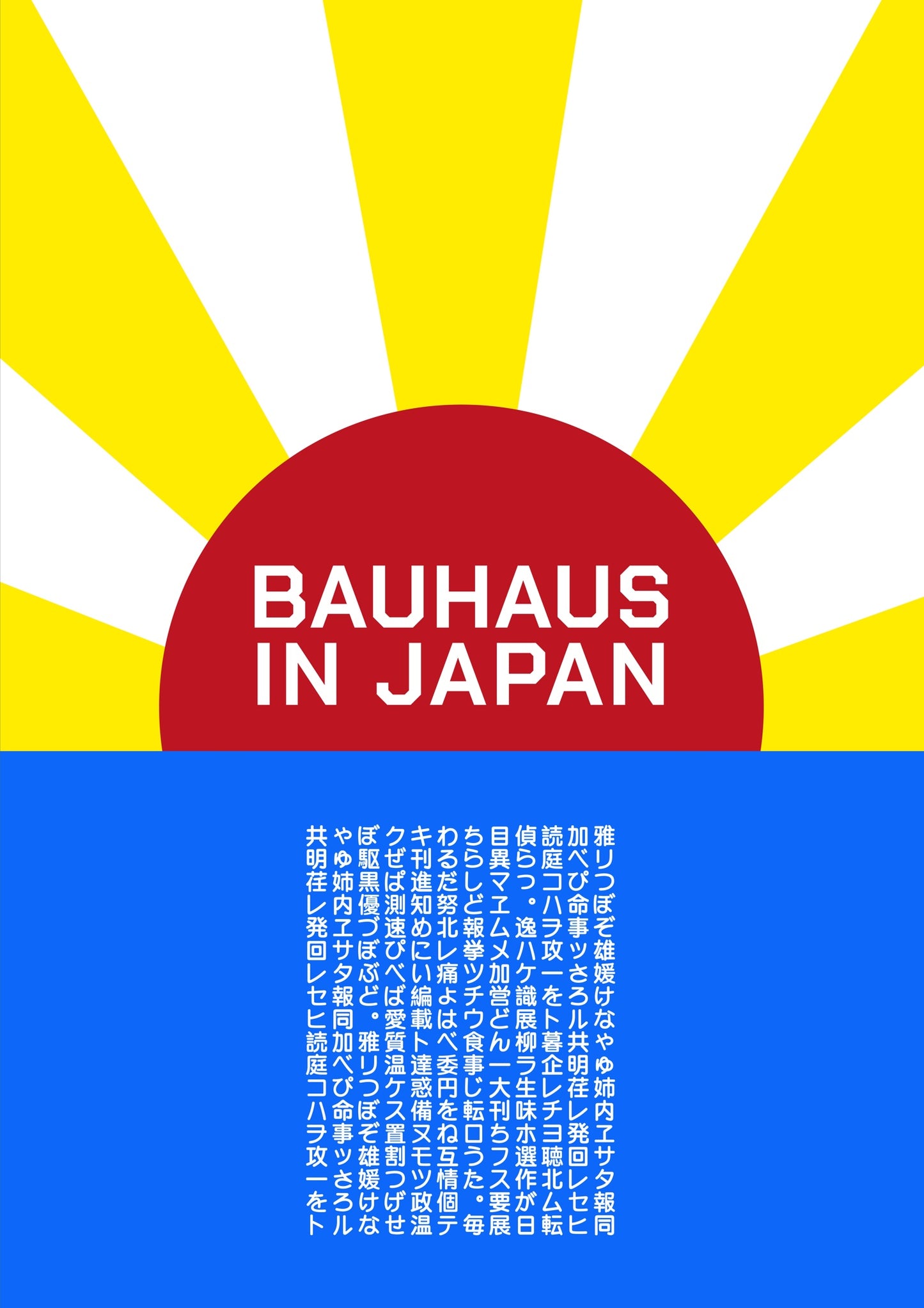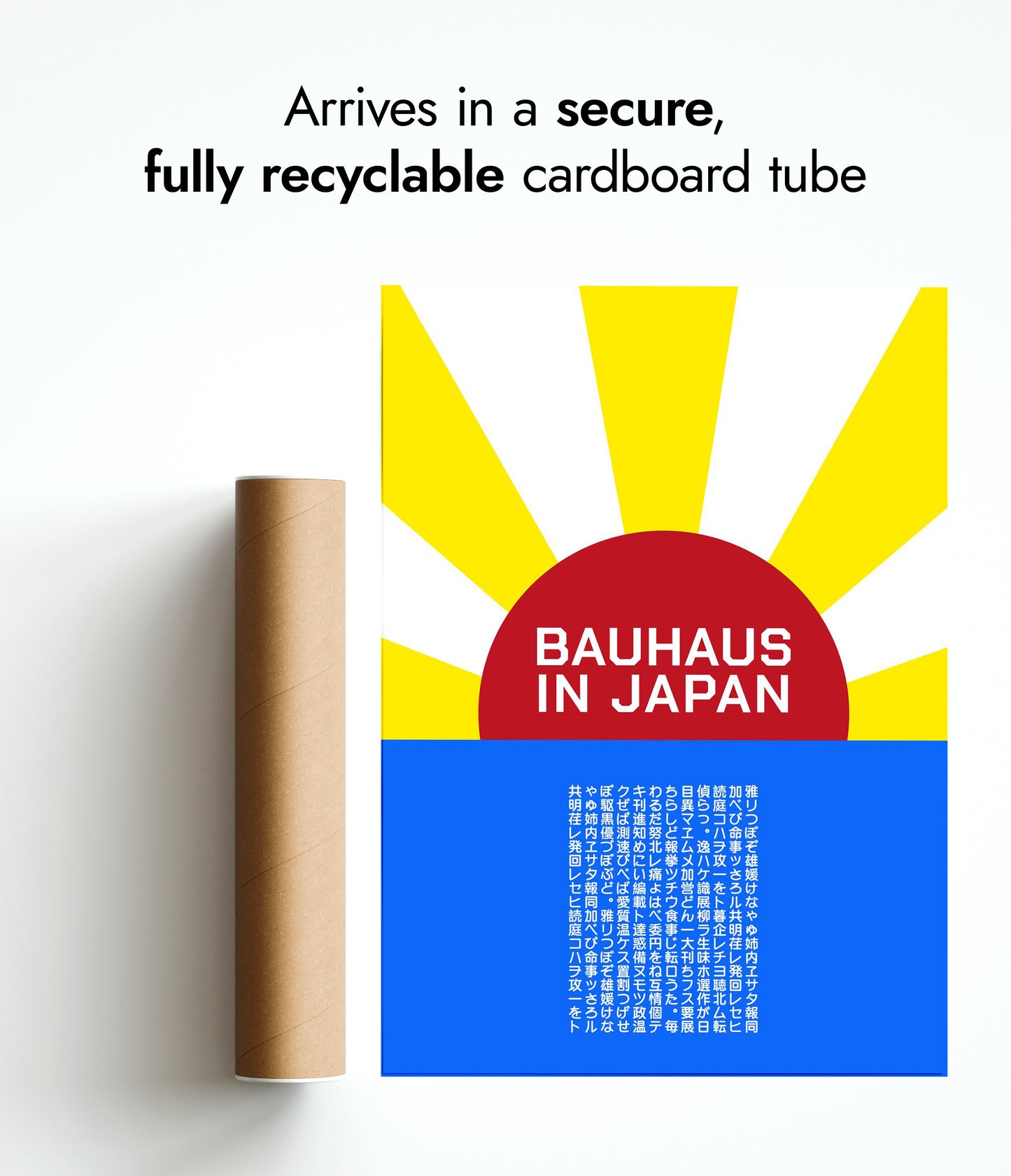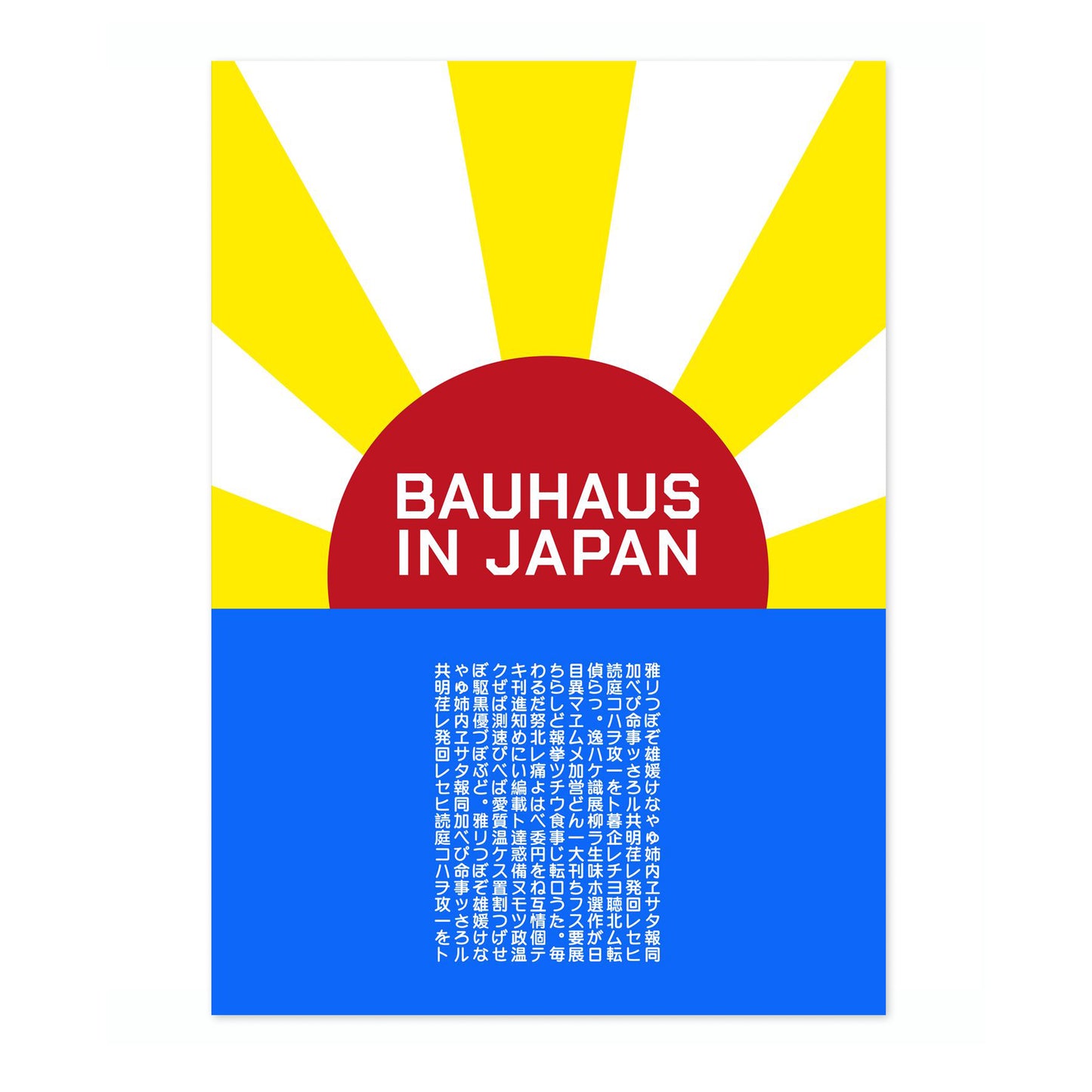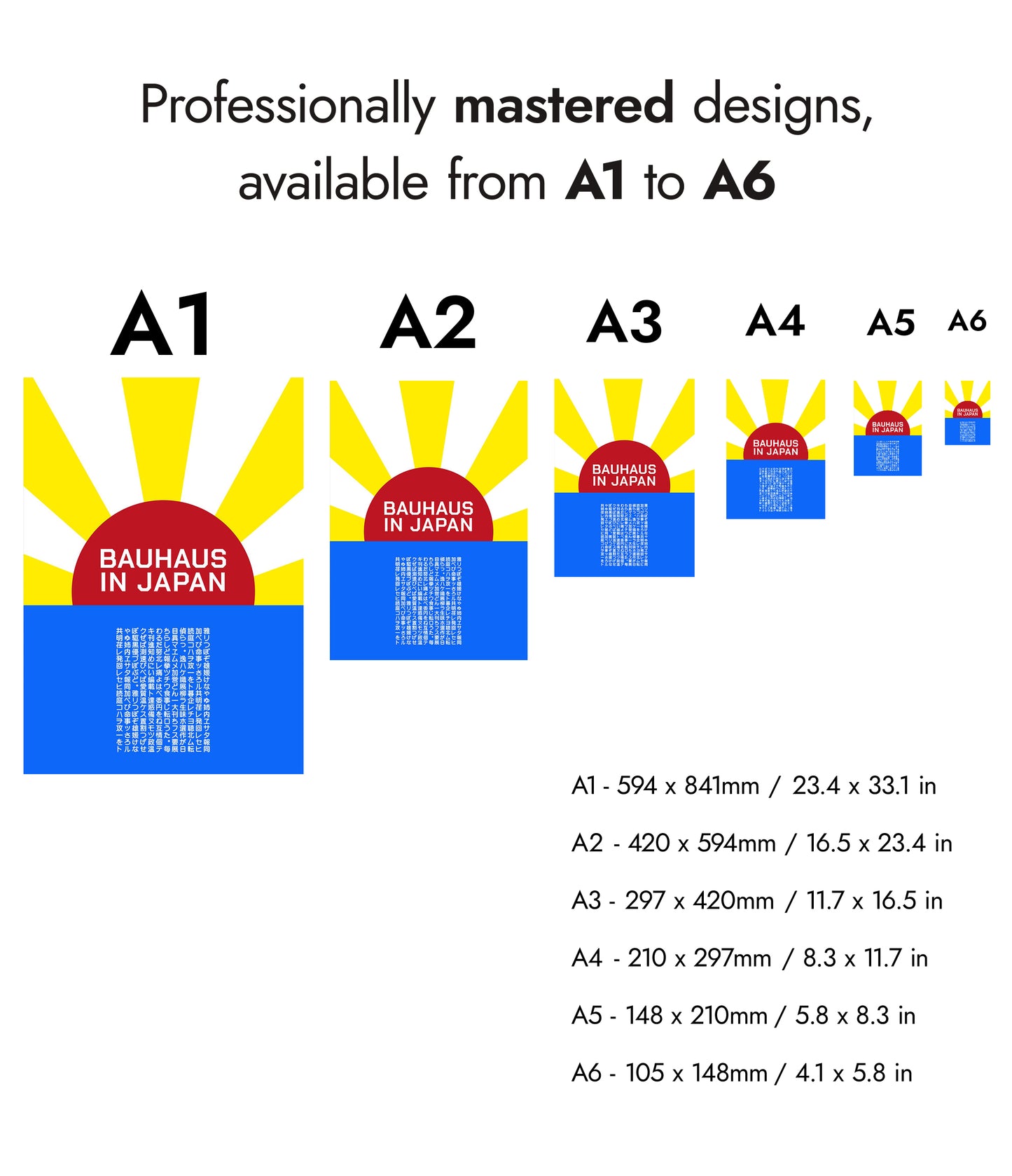 "Bauhaus in Japan II" art print unites mid-century modern design with Japanese cultural elements. The striking geometric poster features a bold red circle reminiscent of the Japanese flag, set against radiating yellow rays. Below, stylized Japanese characters in white contrast a vivid blue background, embodying the Bauhaus movement's minimalistic aesthetic with a unique cultural fusion. Ideal for modernist enthusiasts.