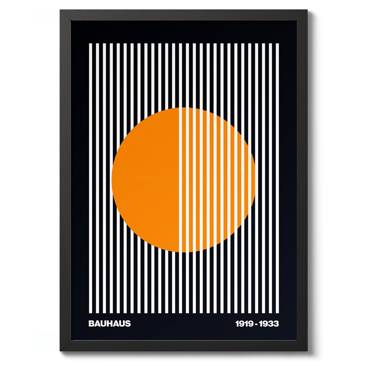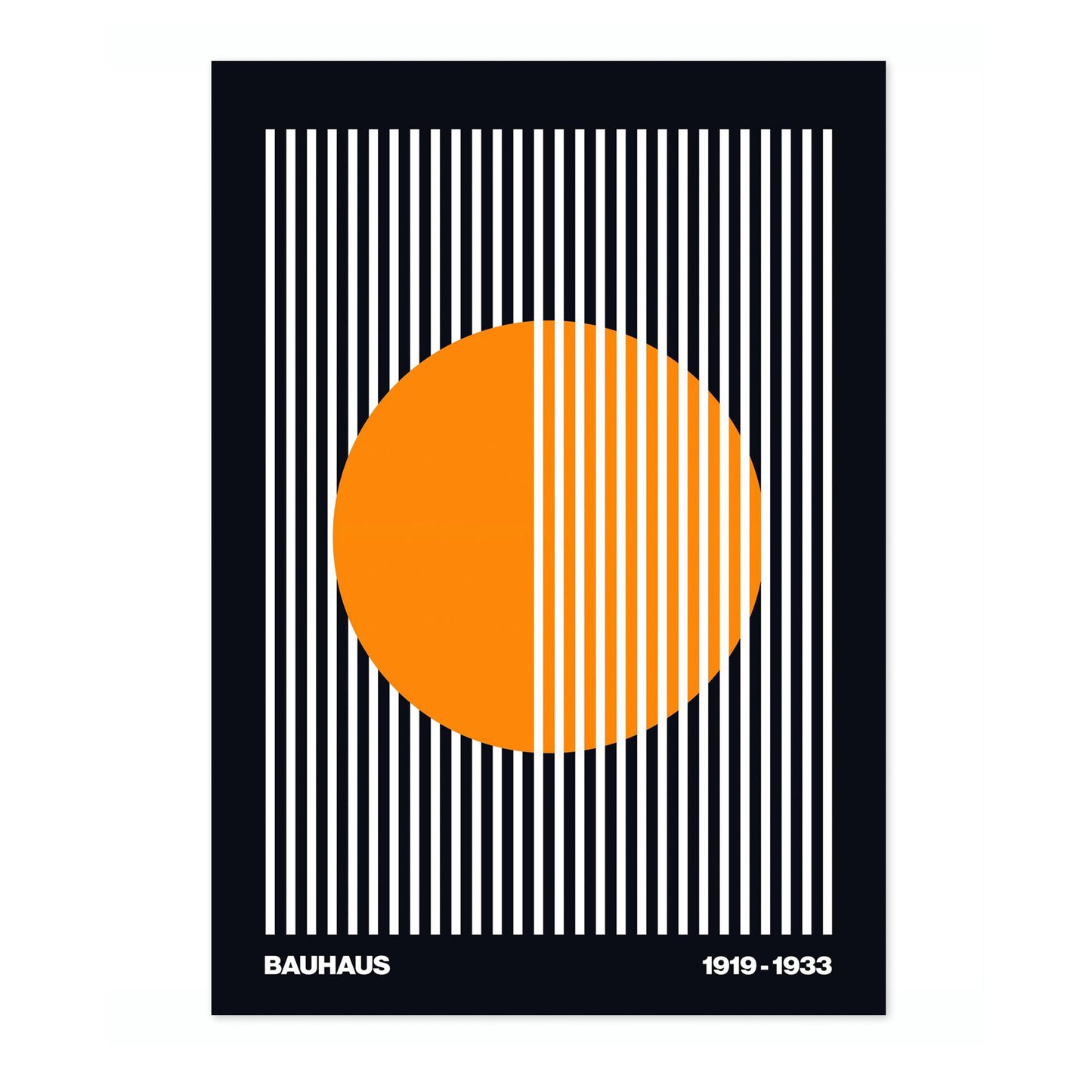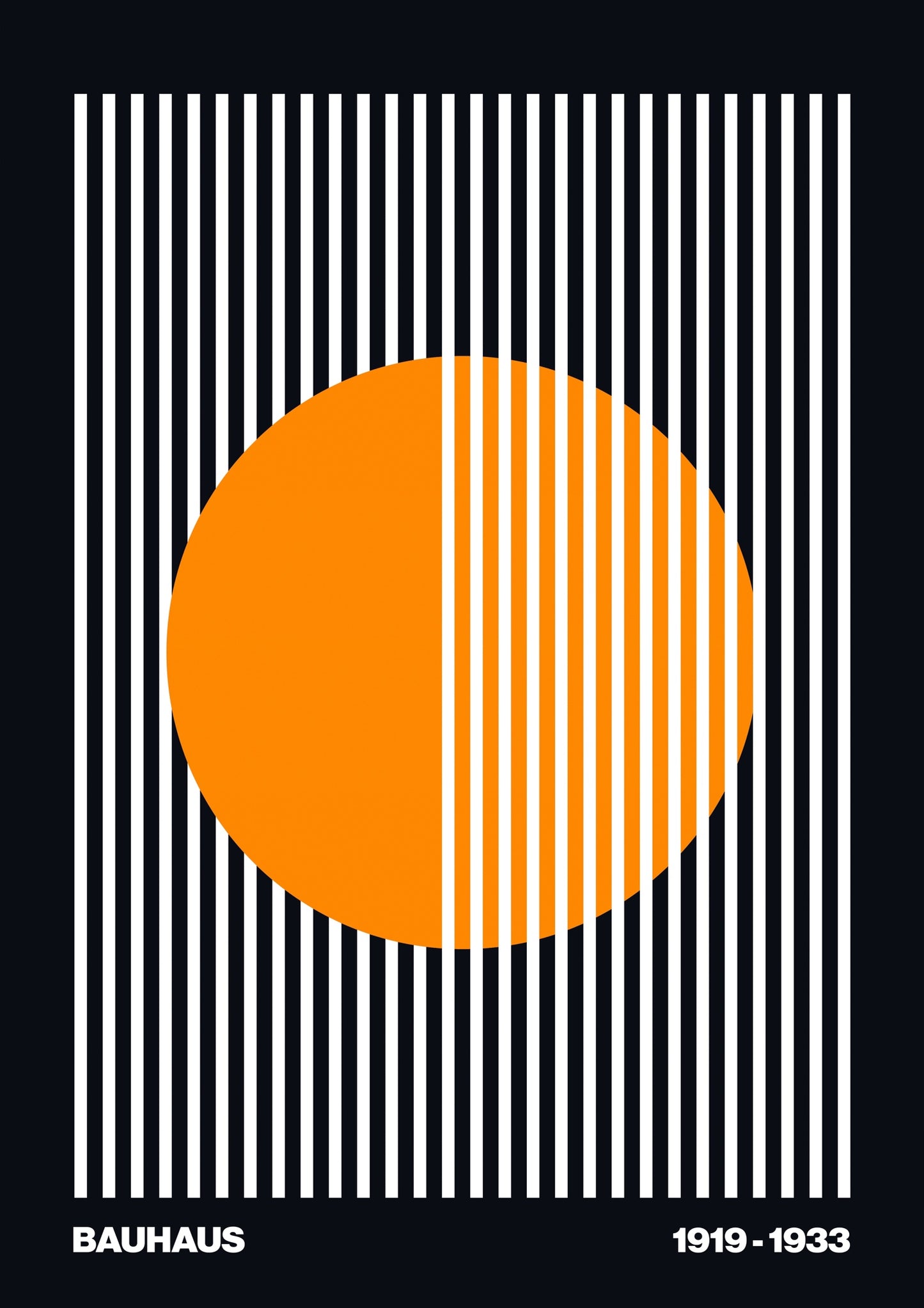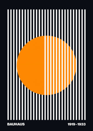 This Bauhaus poster features an iconic abstract design with a bold orange circle intersected by vertical white stripes on a black background. It embodies the geometric and modernist elements characteristic of the Bauhaus movement from 1919 to 1933. Perfect for mid-century enthusiasts, this graphic piece adds a striking, contemporary touch to any space. Ideal for lovers of abstract geometric art.