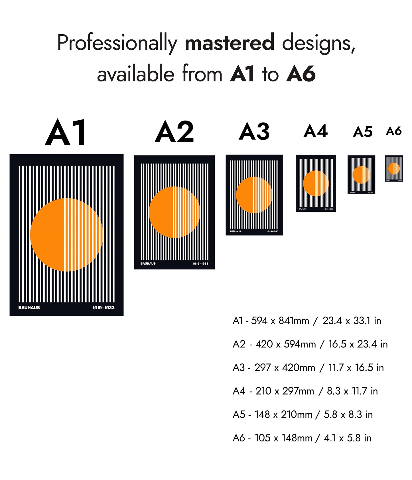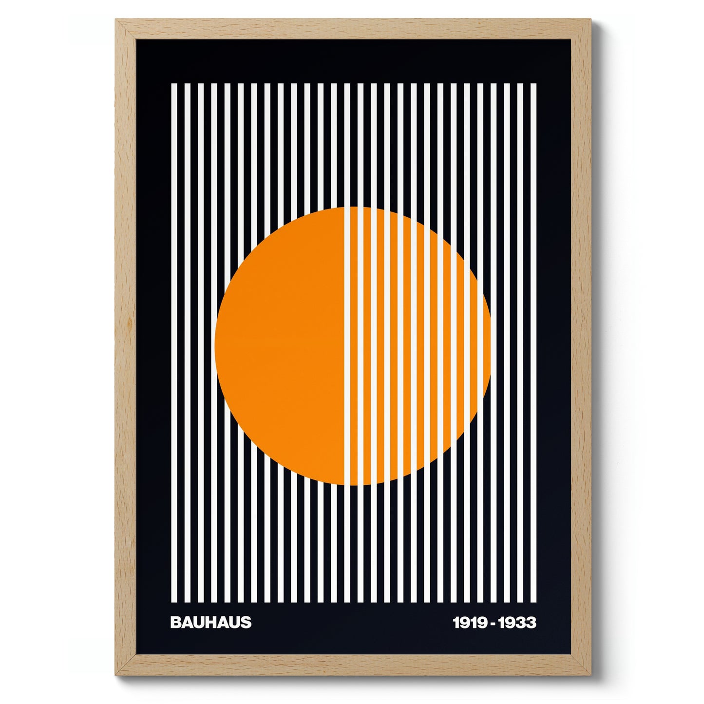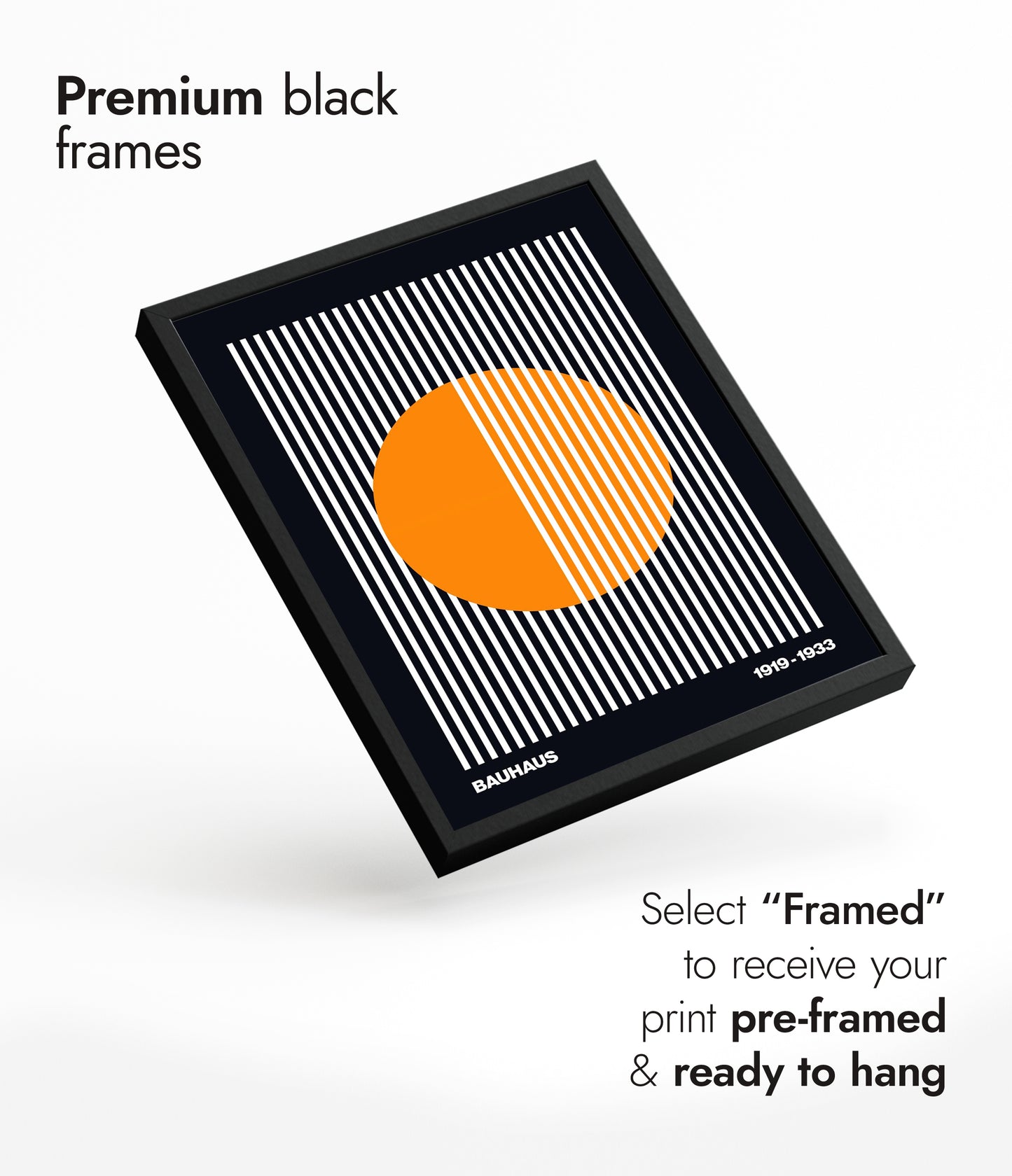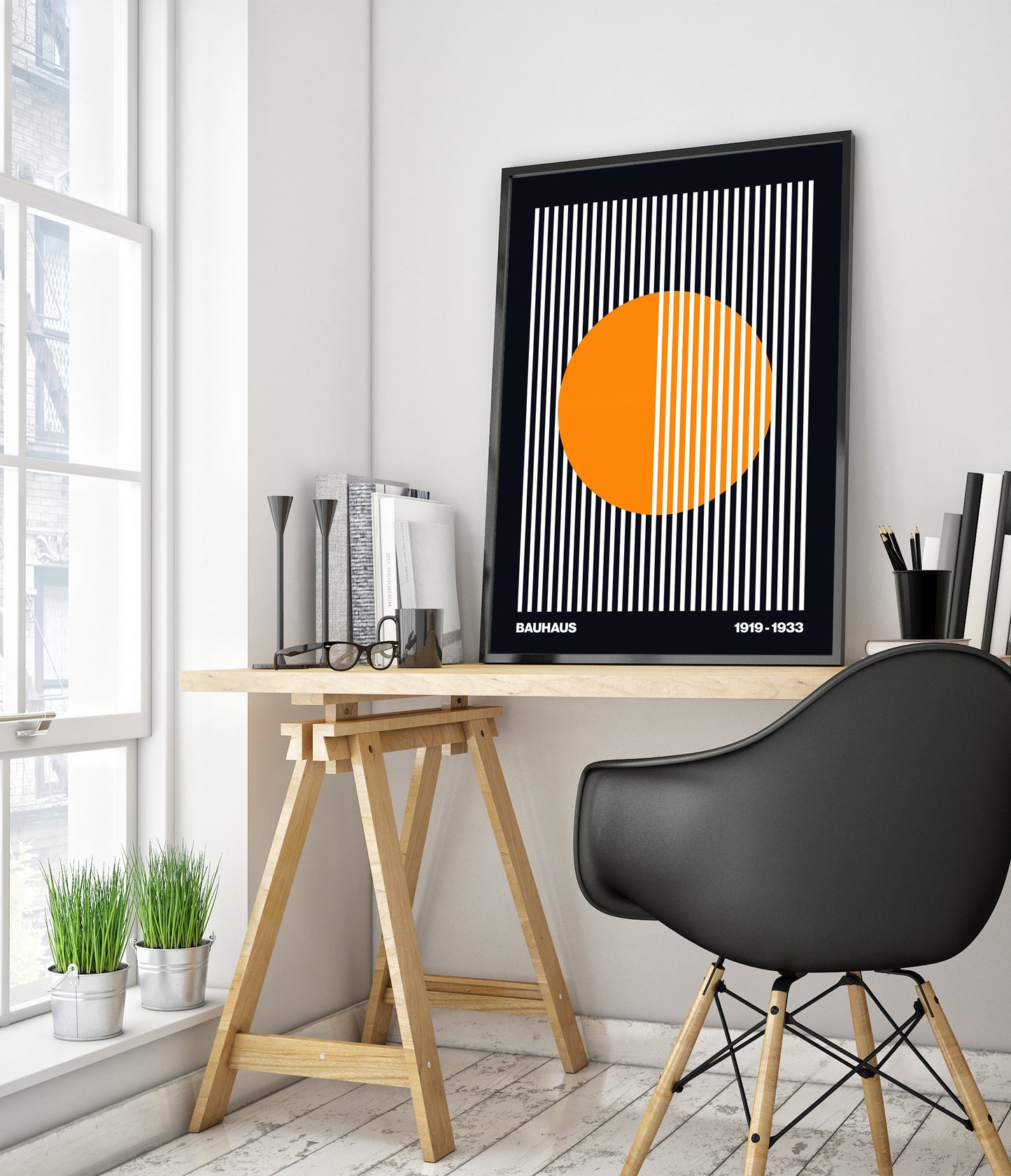 This Bauhaus poster features an iconic abstract design with a bold orange circle intersected by vertical white stripes on a black background. It embodies the geometric and modernist elements characteristic of the Bauhaus movement from 1919 to 1933. Perfect for mid-century enthusiasts, this graphic piece adds a striking, contemporary touch to any space. Ideal for lovers of abstract geometric art.