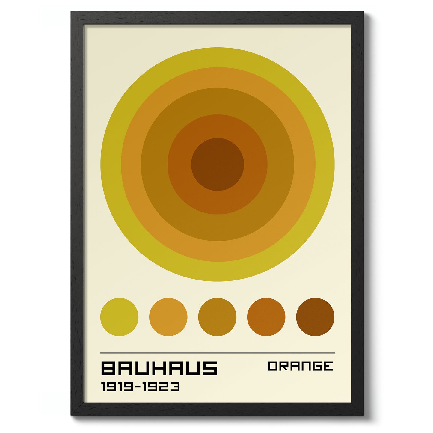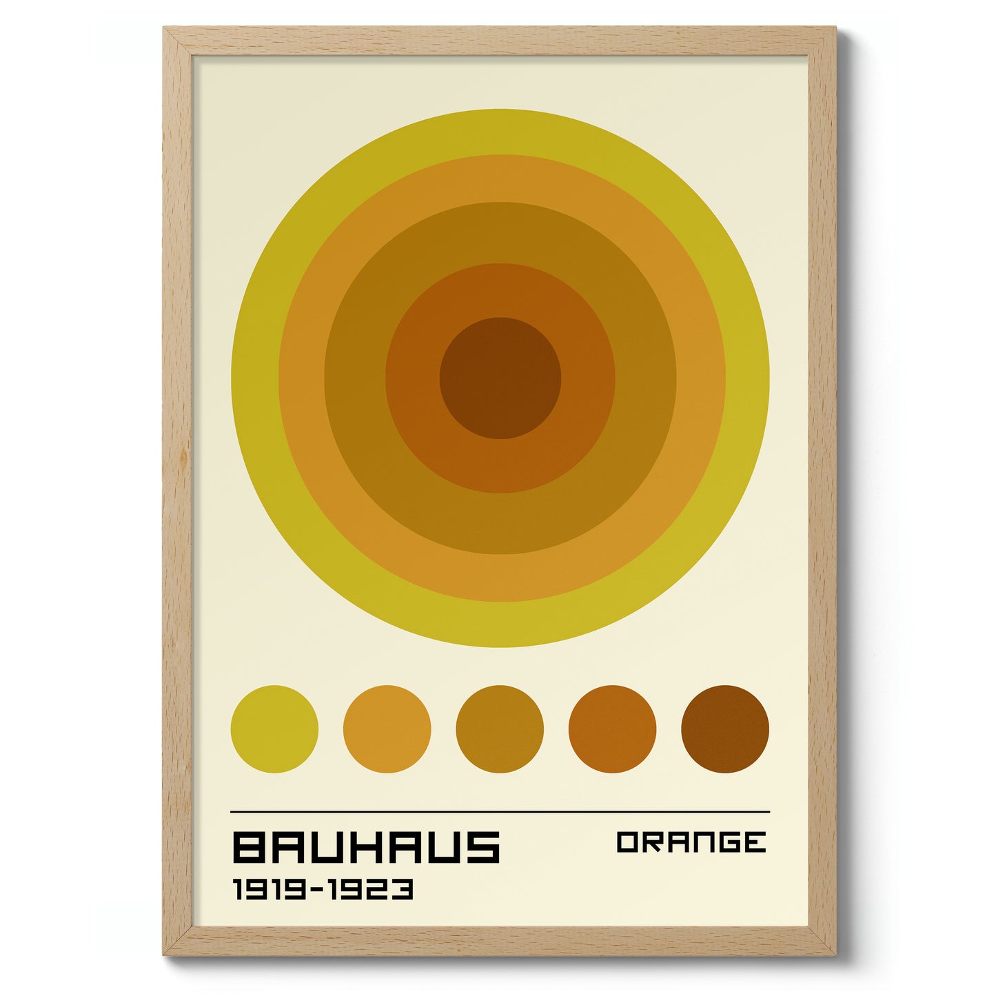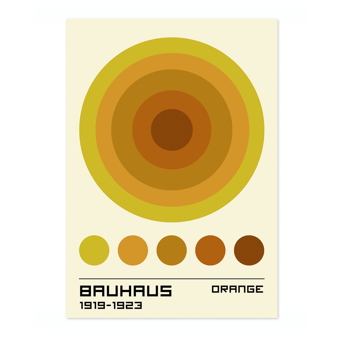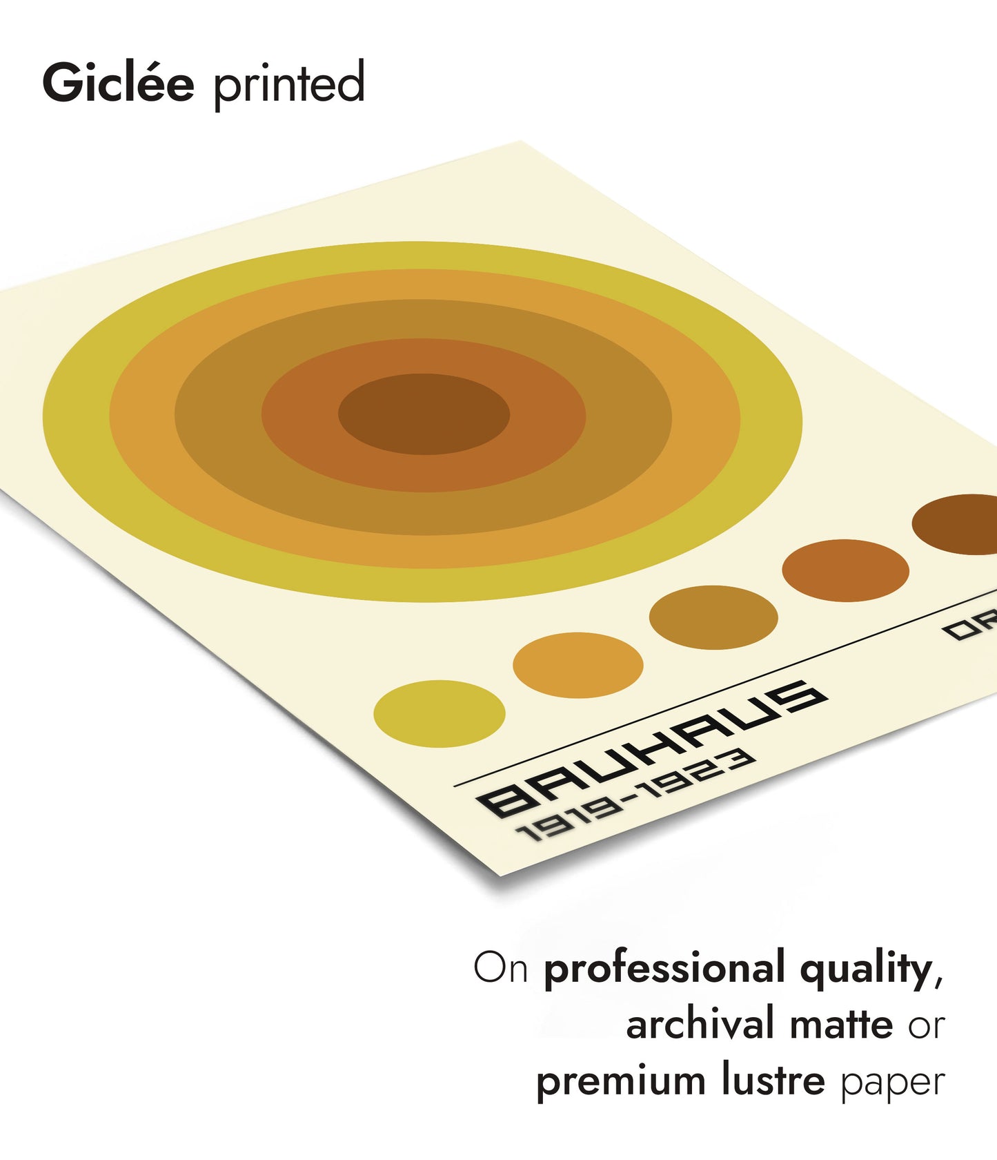 The "Orange Circles" poster showcases a striking minimalist design inspired by the Bauhaus movement. Featuring concentric circles in warm orange and brown hues, this geometric artwork embodies modern and abstract themes. Ideal for mid-century enthusiasts, the balanced composition and clean lines make it a standout piece for contemporary decor. Perfect as a portrait poster for adding a touch of modern Bauhaus sophistication.