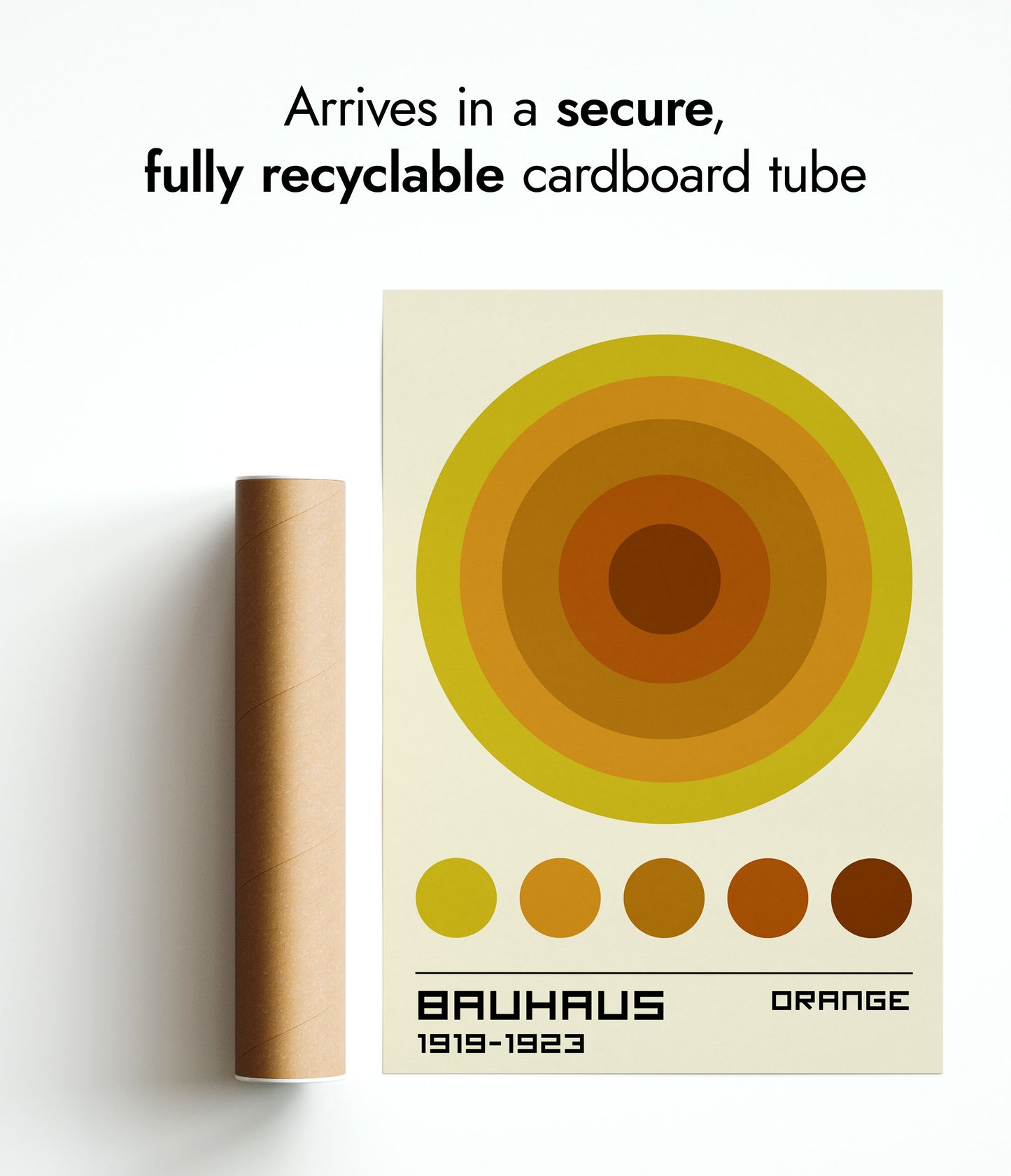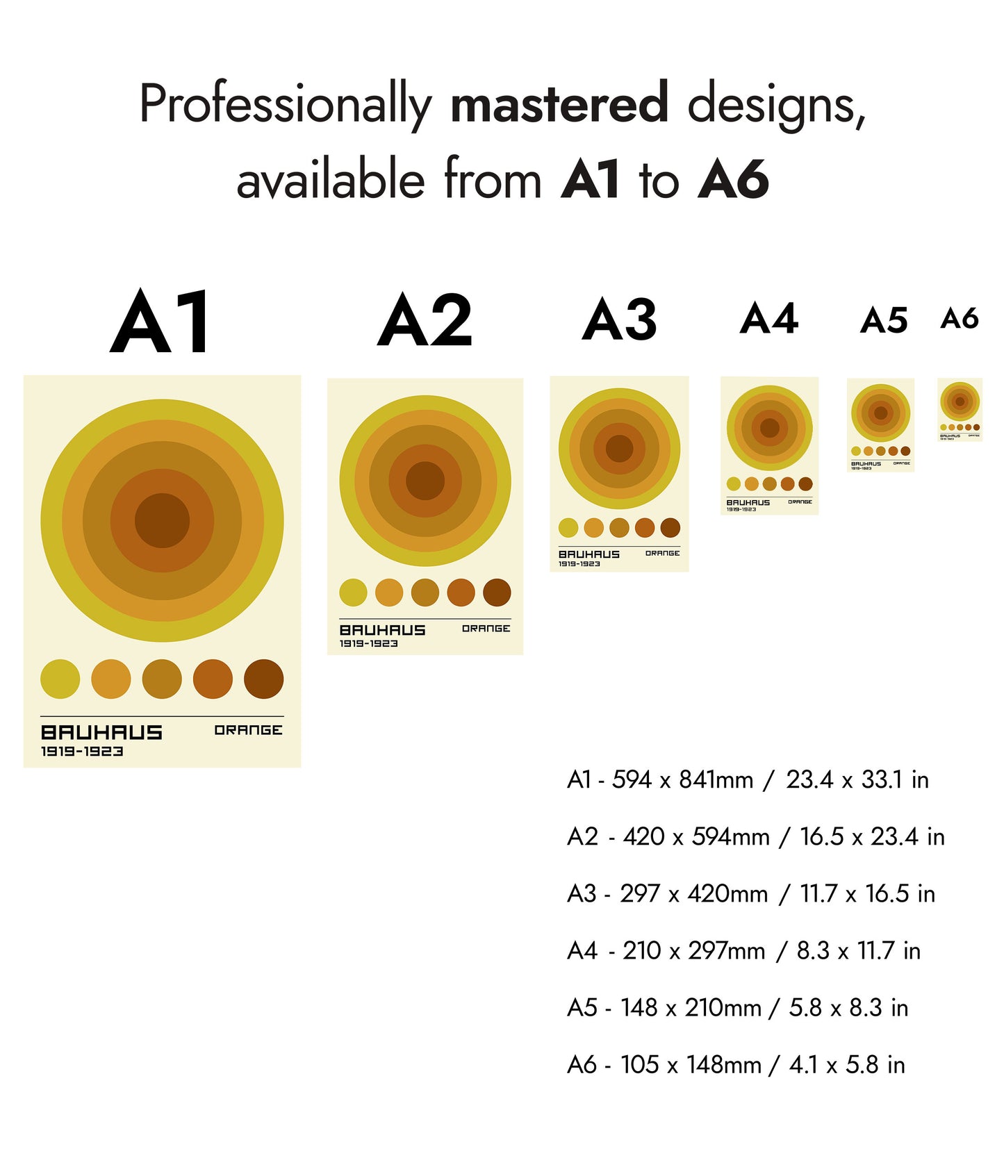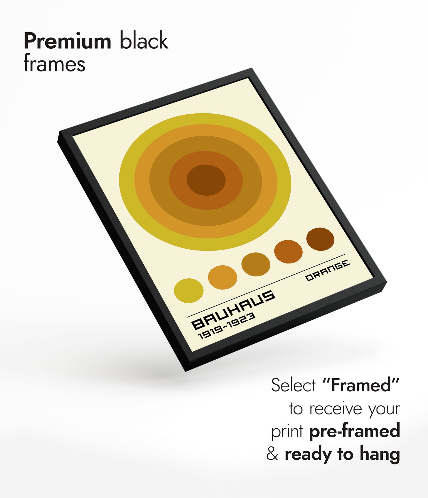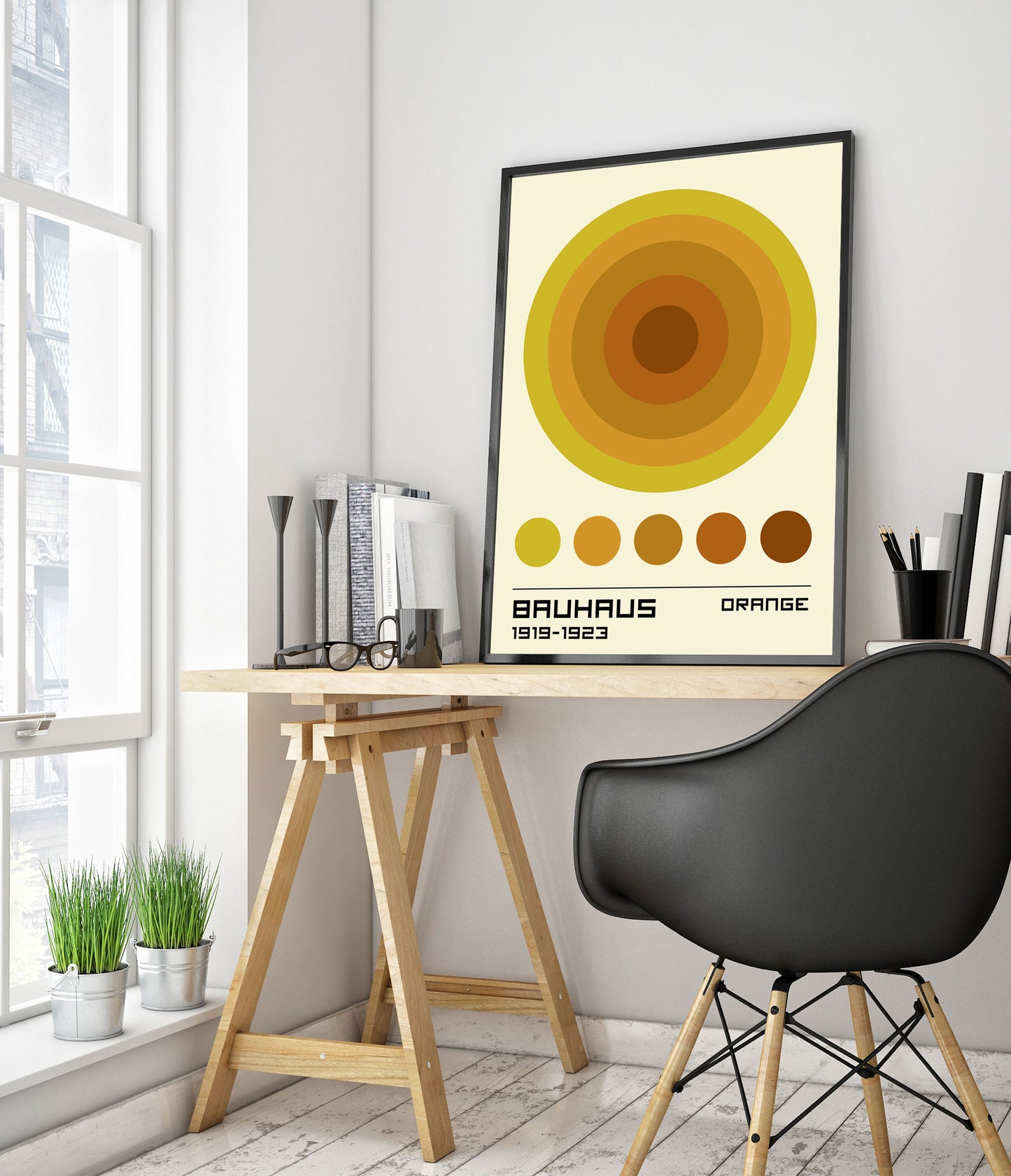 The "Orange Circles" poster showcases a striking minimalist design inspired by the Bauhaus movement. Featuring concentric circles in warm orange and brown hues, this geometric artwork embodies modern and abstract themes. Ideal for mid-century enthusiasts, the balanced composition and clean lines make it a standout piece for contemporary decor. Perfect as a portrait poster for adding a touch of modern Bauhaus sophistication.