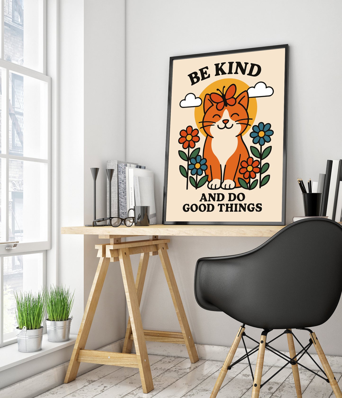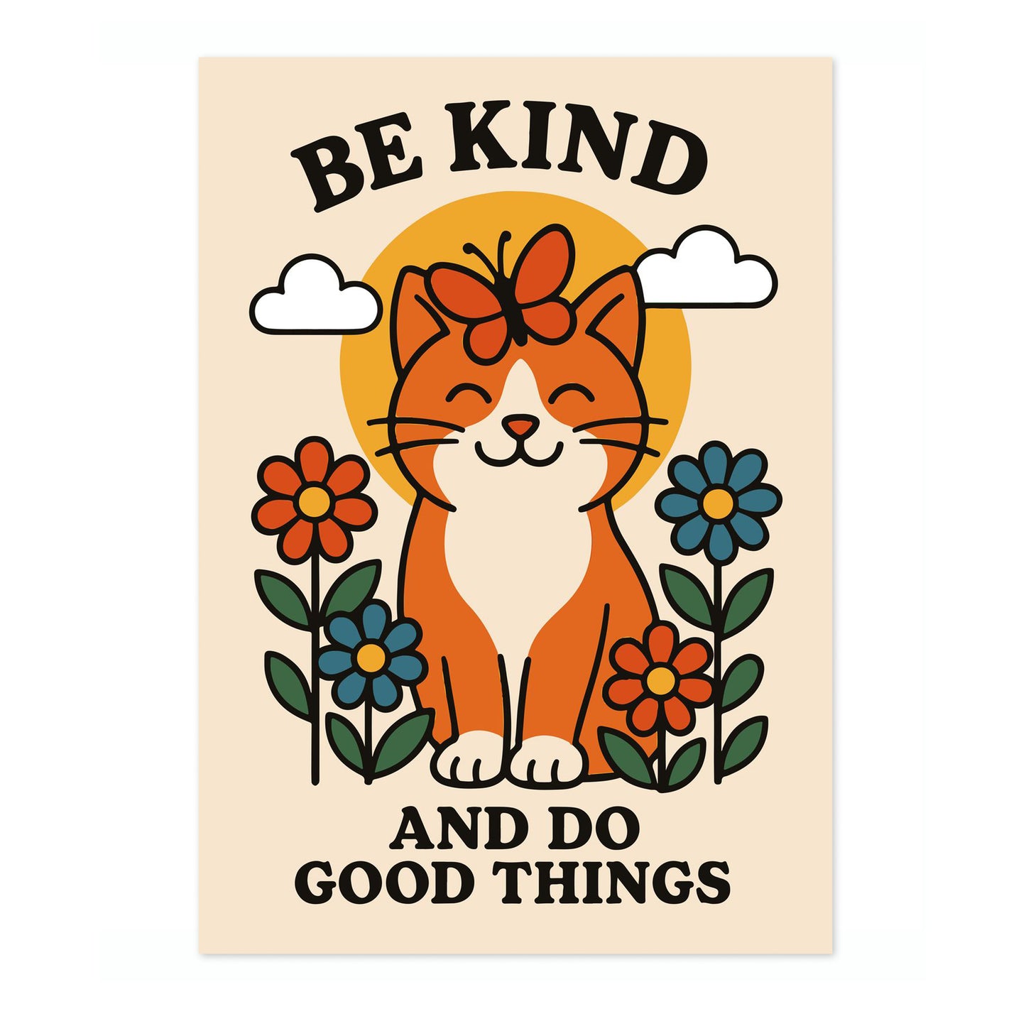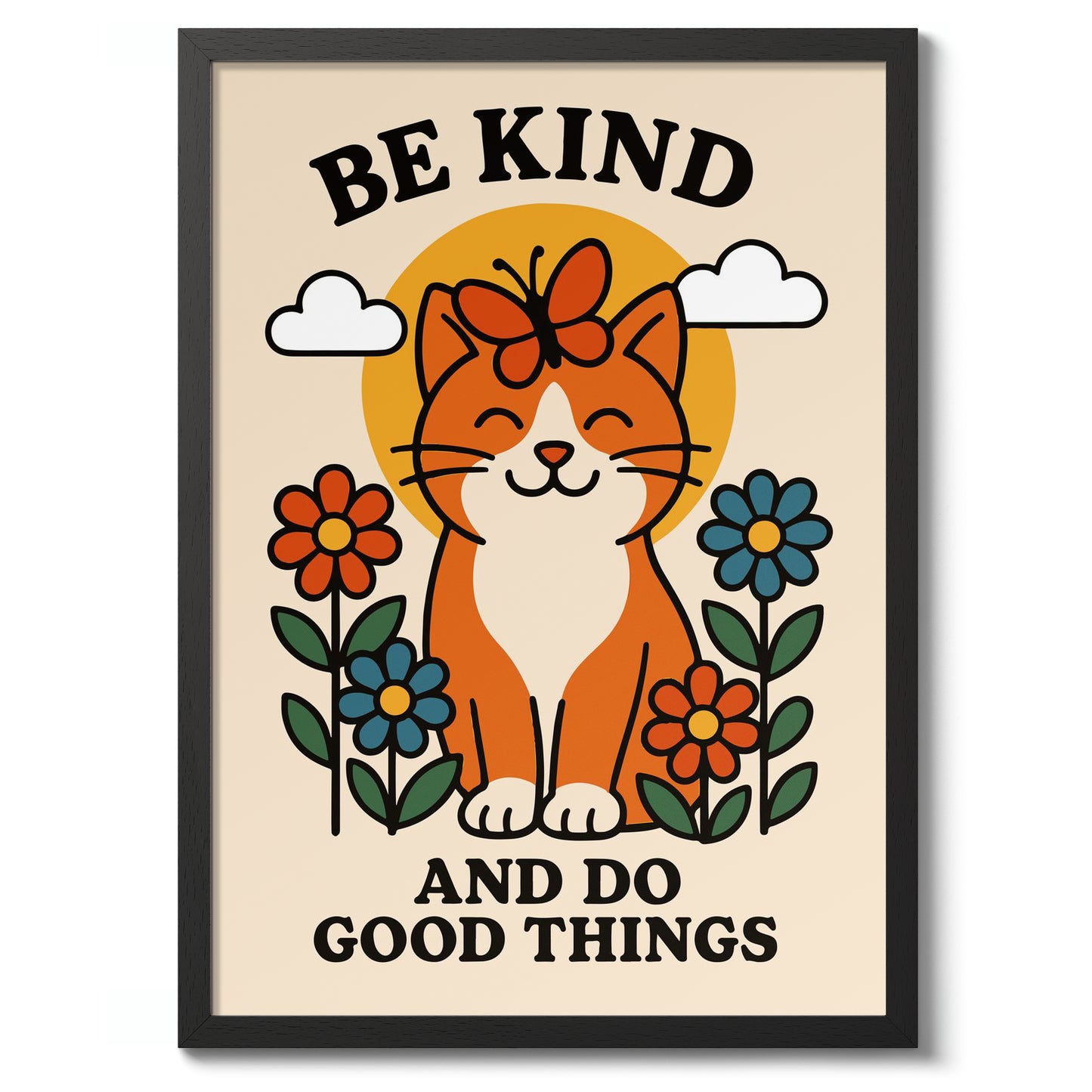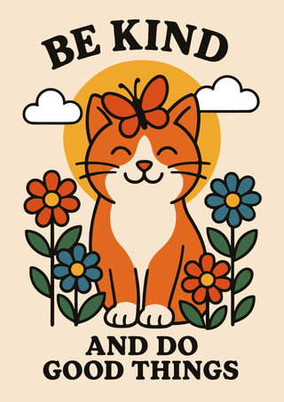This uplifting poster features a cheerful orange cat with a butterfly perched on its head, surrounded by vibrant flowers under a warm sun. The bold, motivational message "Be Kind and Do Good Things" accompanies the charming illustration. Ideal for bringing a touch of positivity and colorful whimsy to any space, this poster seamlessly blends inspirational quotes with adorable animal art.
