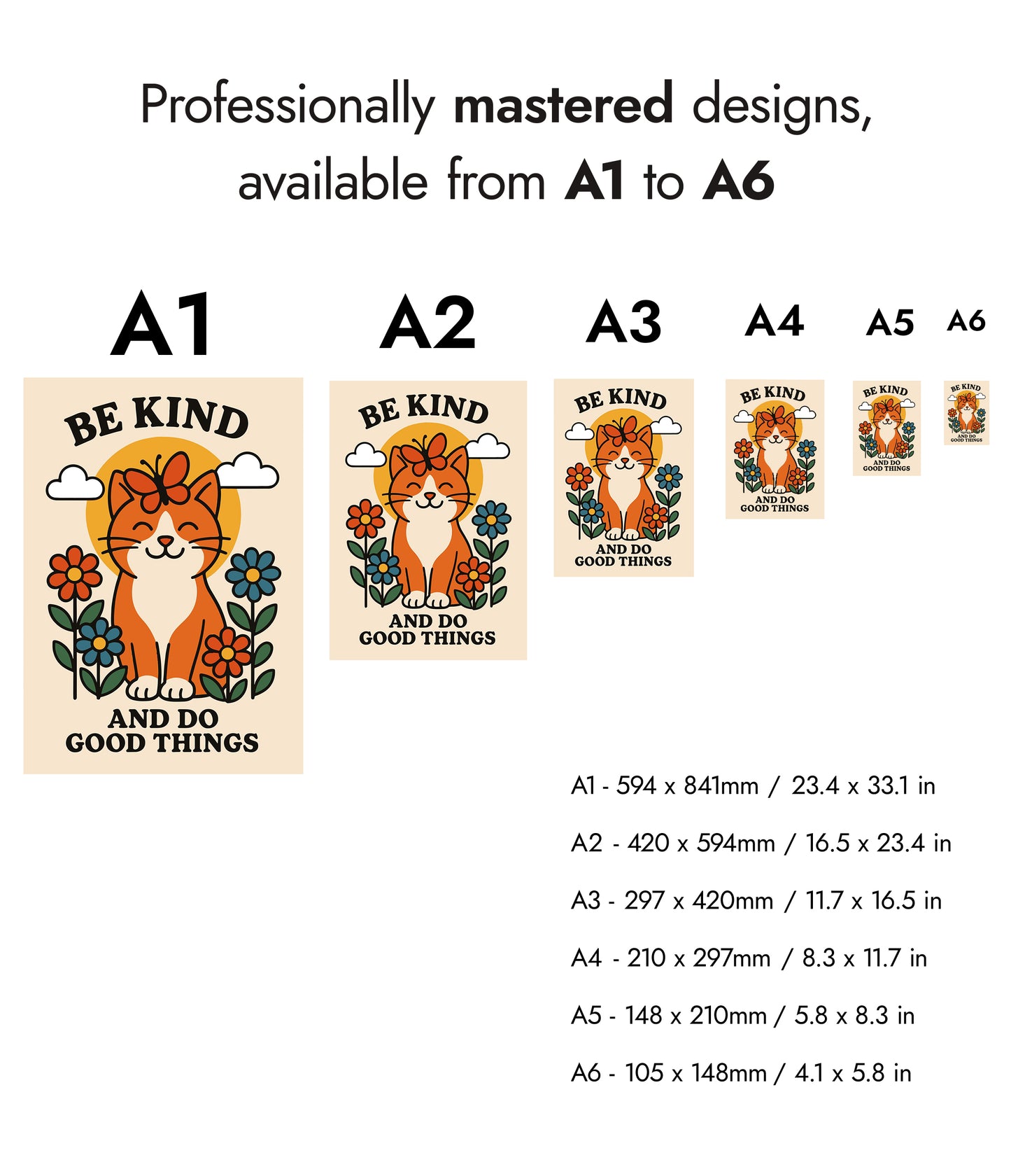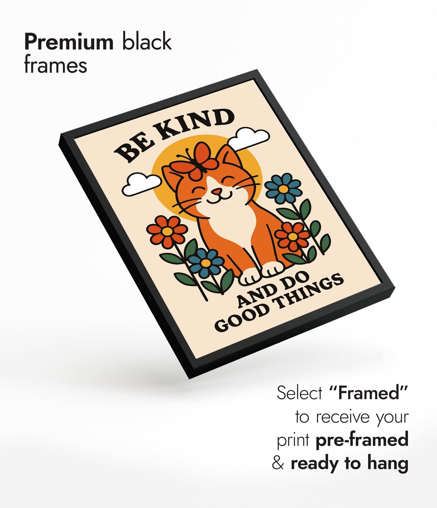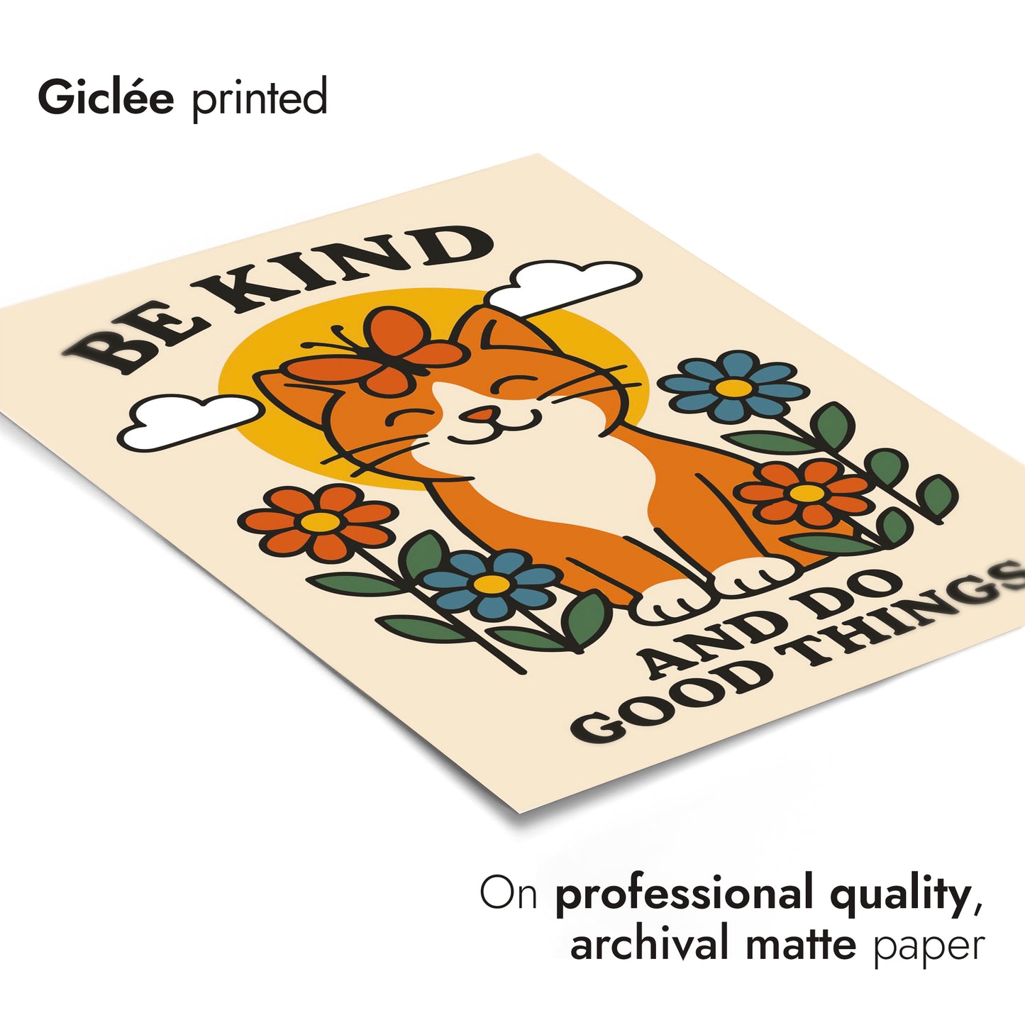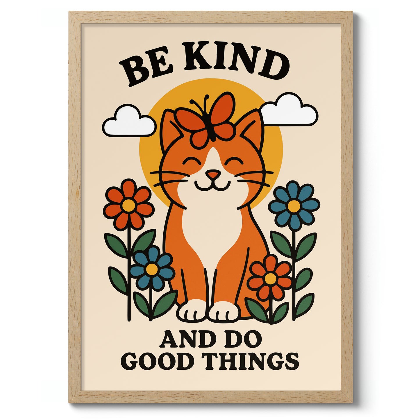 This uplifting poster features a cheerful orange cat with a butterfly perched on its head, surrounded by vibrant flowers under a warm sun. The bold, motivational message "Be Kind and Do Good Things" accompanies the charming illustration. Ideal for bringing a touch of positivity and colorful whimsy to any space, this poster seamlessly blends inspirational quotes with adorable animal art.