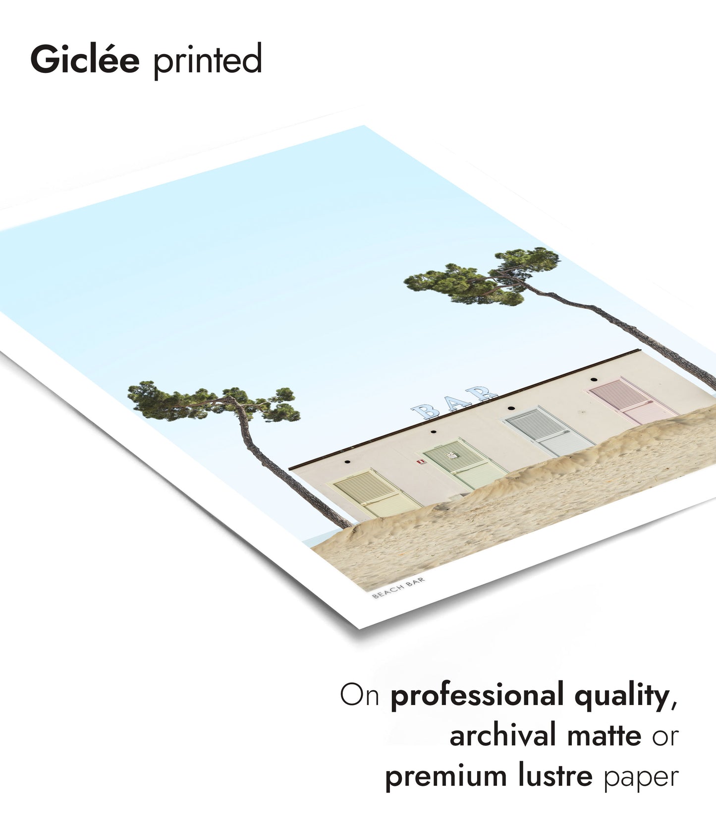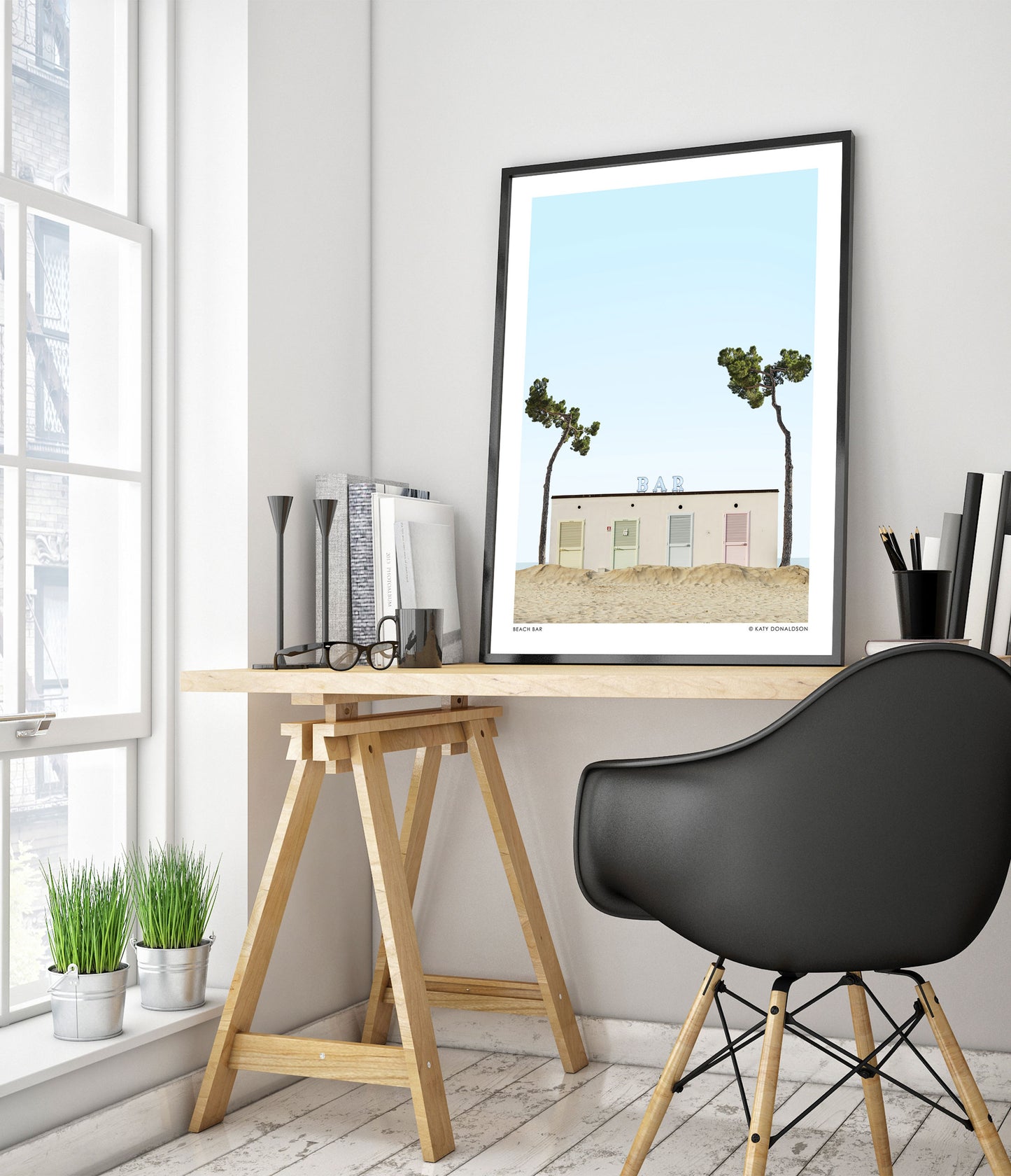 "Beach Bar" by Katy Donaldson captures a tranquil beach scene featuring a minimalist bar structure nestled between two windswept trees. Set against a clear blue sky, this modern, photographic poster emphasizes simplicity and calmness, perfect for contemporary spaces. The soft pastel hues of the bar doors add a subtle pop of colour, harmonizing with the sandy surroundings.