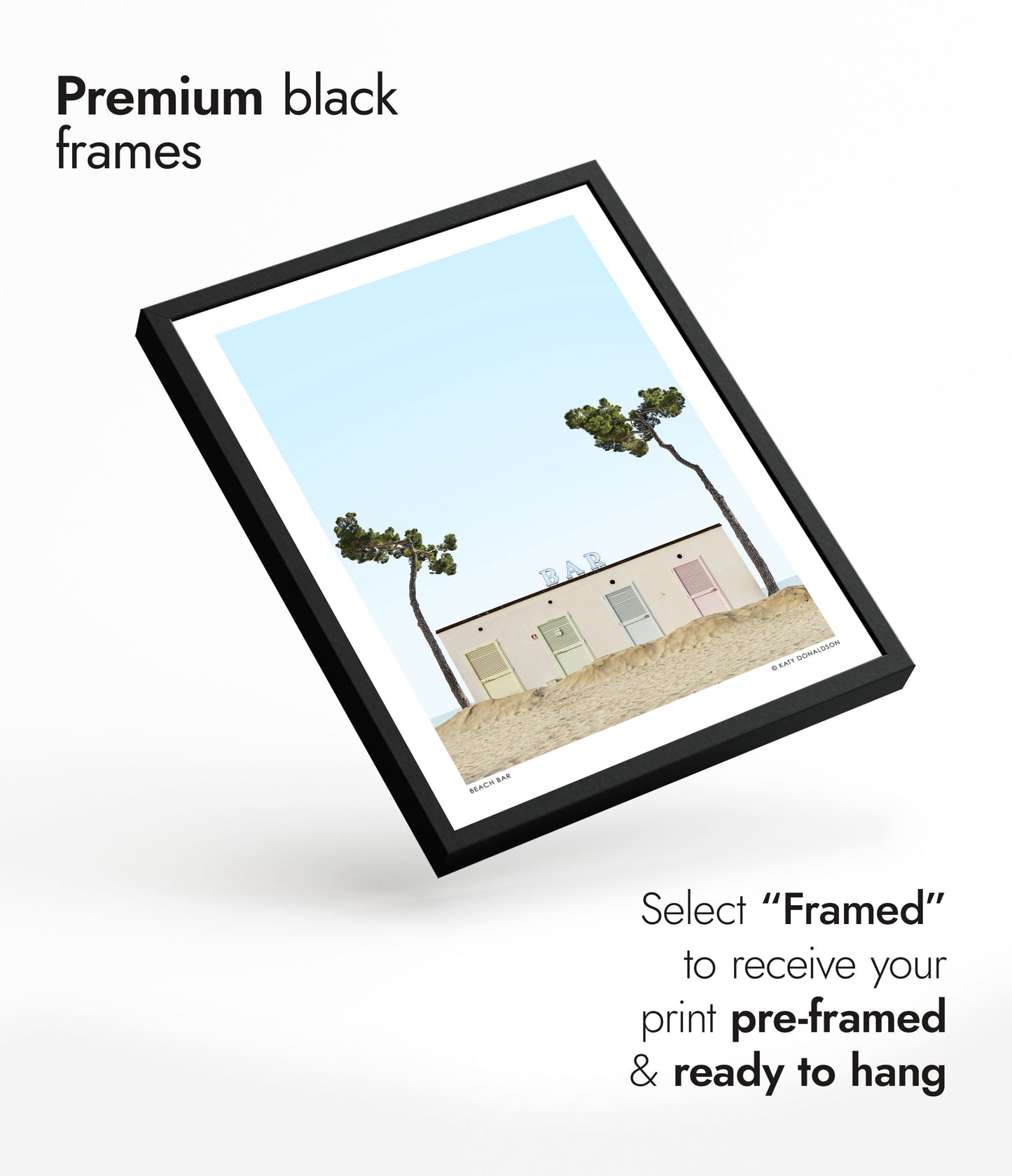 Solid wood frames available in black stained or natural finishes, with UV resistant acrylic glass. Framed orders arrive pre-installed with your choice of print, ready to hang. Available in all print sizes.