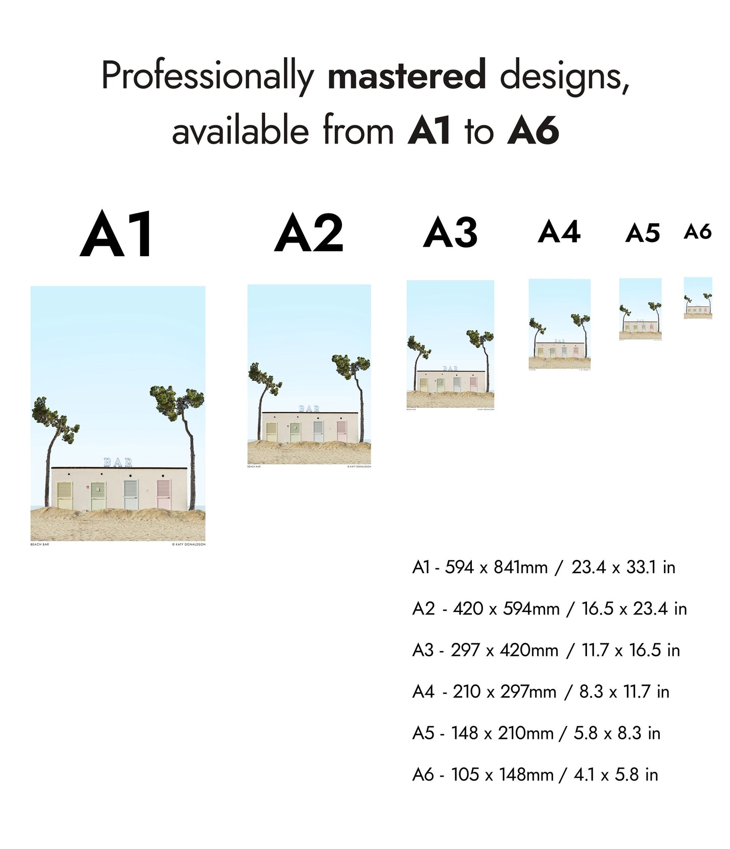 8 colour giclée print process on high-quality 230gsm archival matte paper. All our paper is FSC Certified and prints come with a lifetime fade-resistance guarantee.