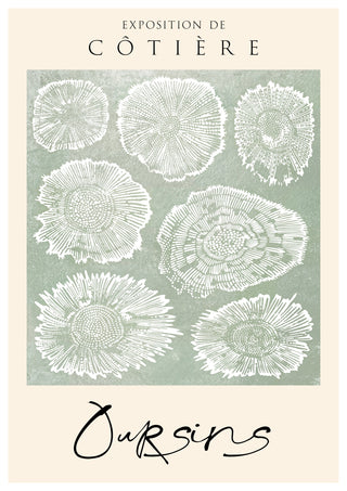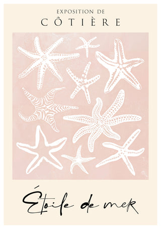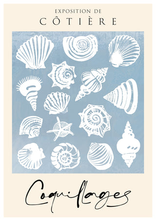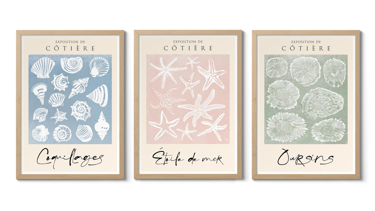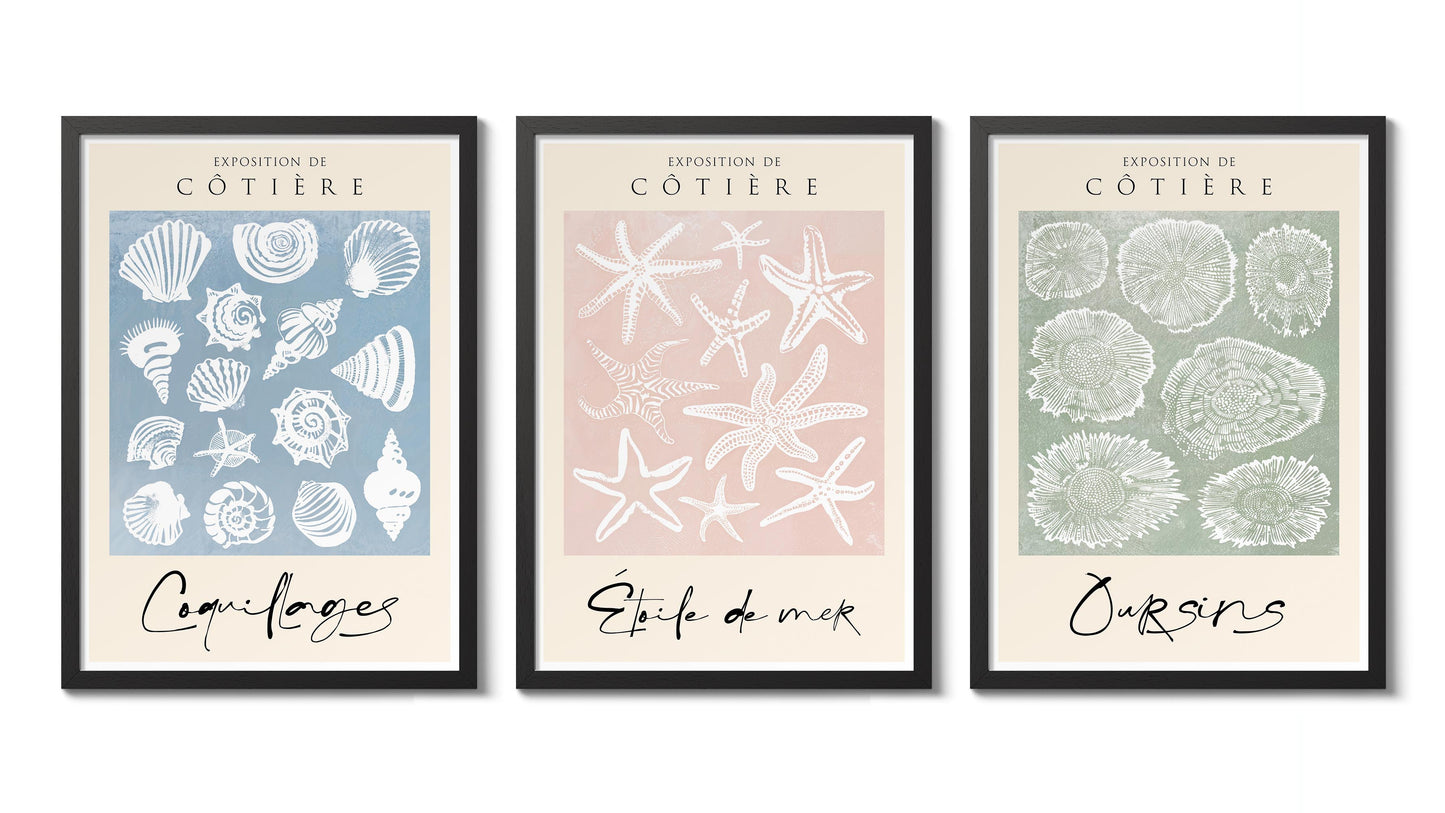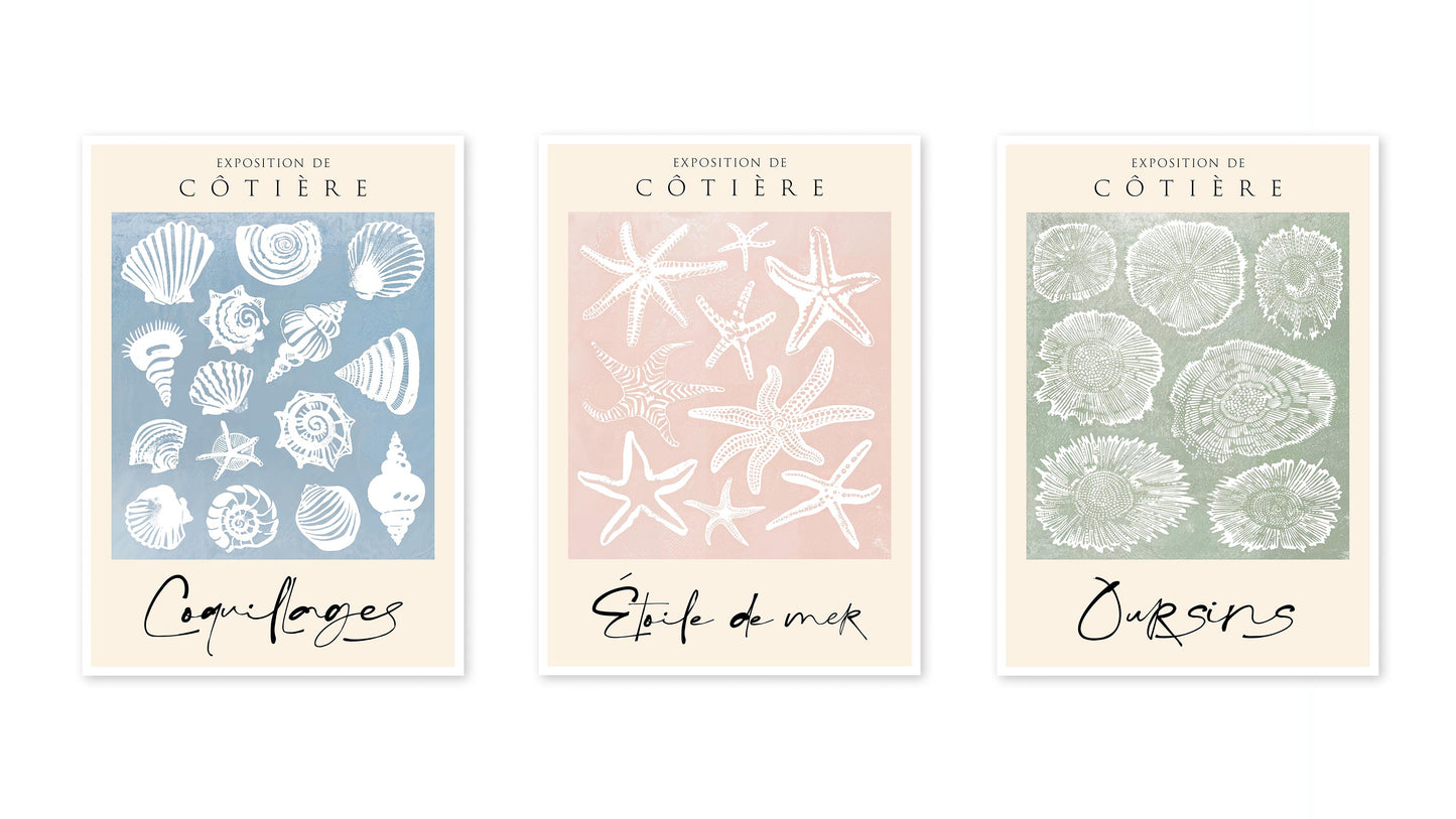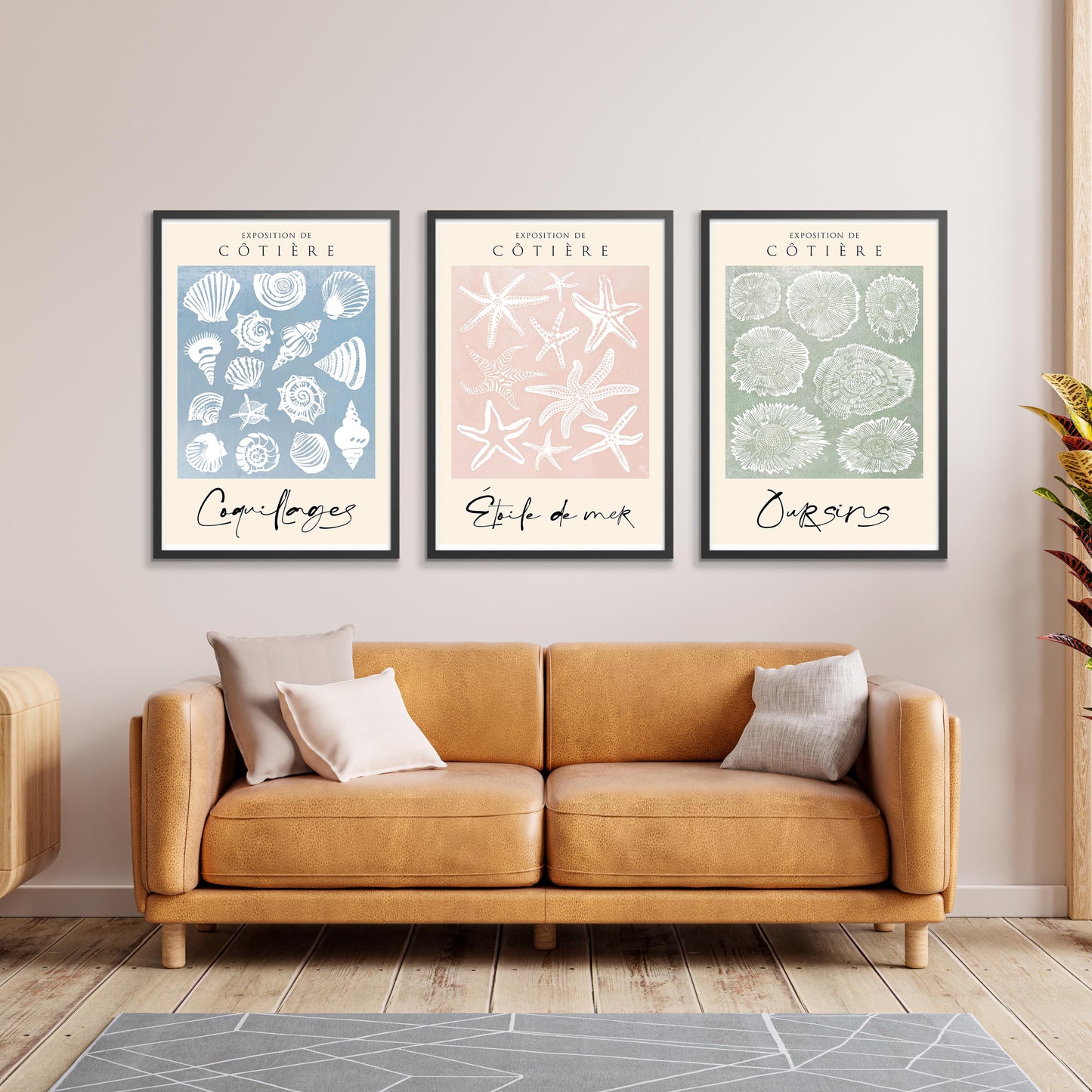 This vintage-inspired "Beach Life Exhibition" poster set features elegant illustrations of sea life, including shells, starfish, and sea urchins. Each piece employs a subdued color palette of beige, blue, pink, and green, evoking an oceanic ambiance. Ideal for coastal-themed decor, these art prints capture the serene beauty of ocean treasures, perfect for any nature enthusiast's collection.