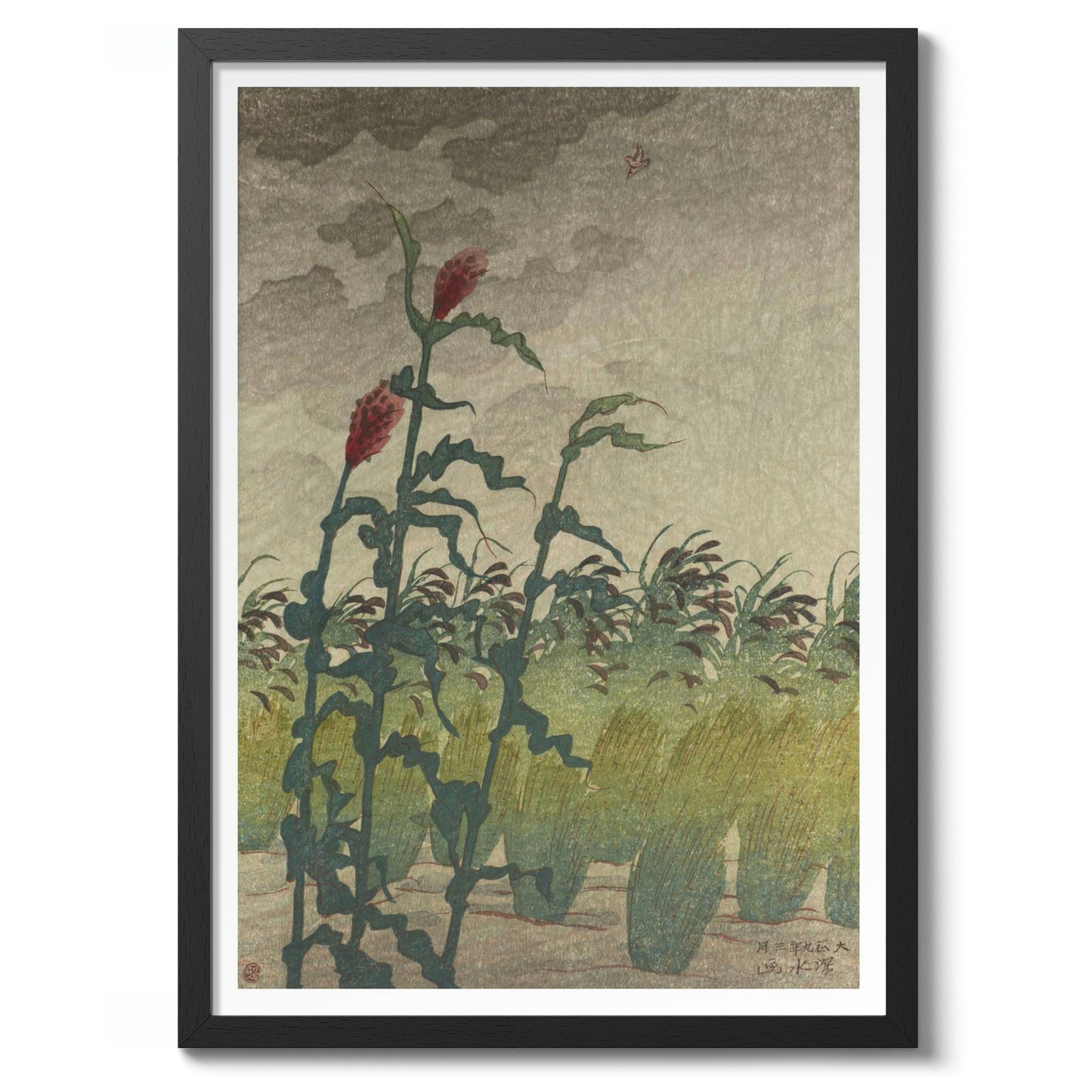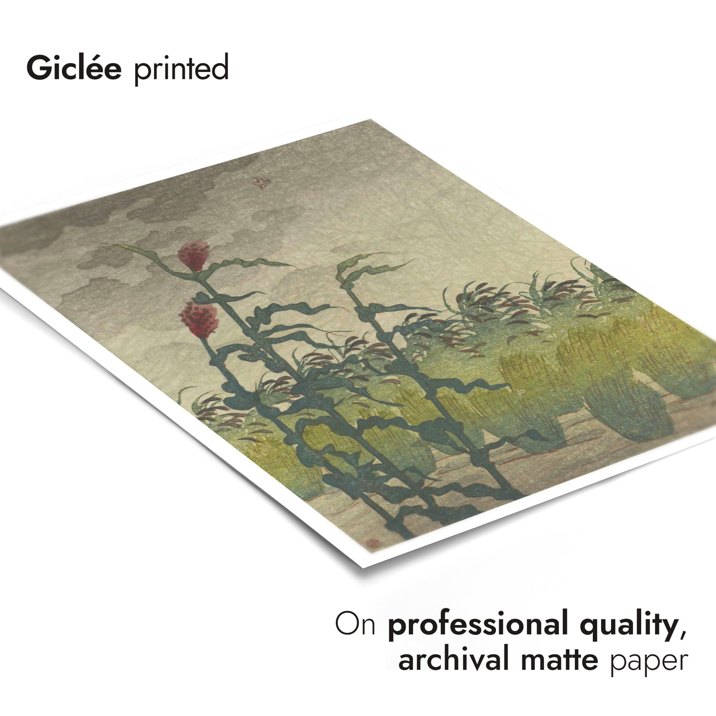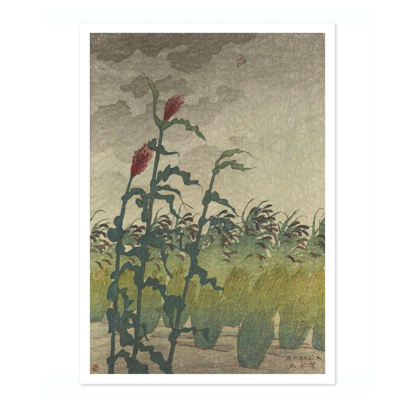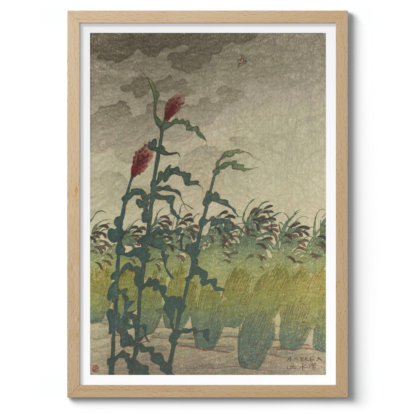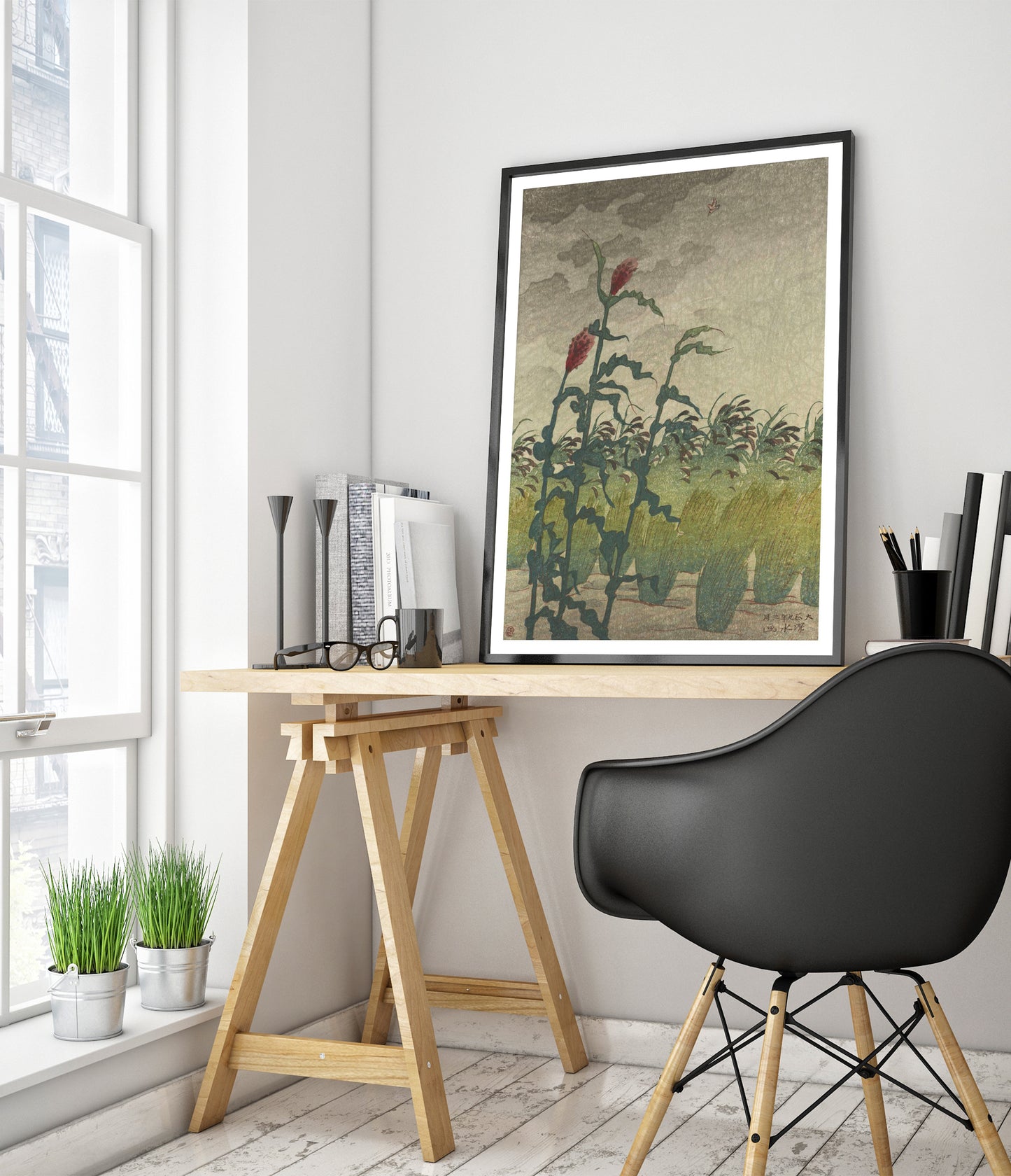 "Before a Thunderstorm" poster by Shinsui Ito captures the serene tension before a storm. This 1920 traditional Japanese woodblock print portrays tall plants swaying under a brooding grey sky, hinting at the approaching rain. The warm greens contrast with the looming storm clouds, evoking the atmospheric drama typical of Ukiyo-e and Shin-Hanga art styles.