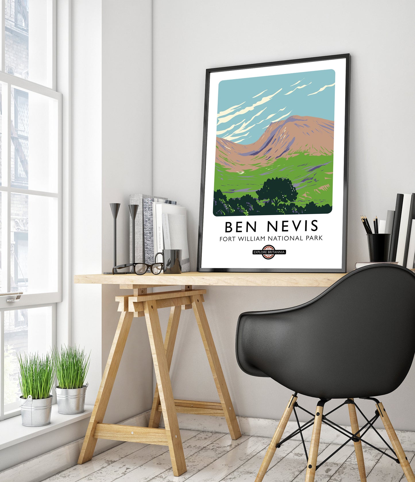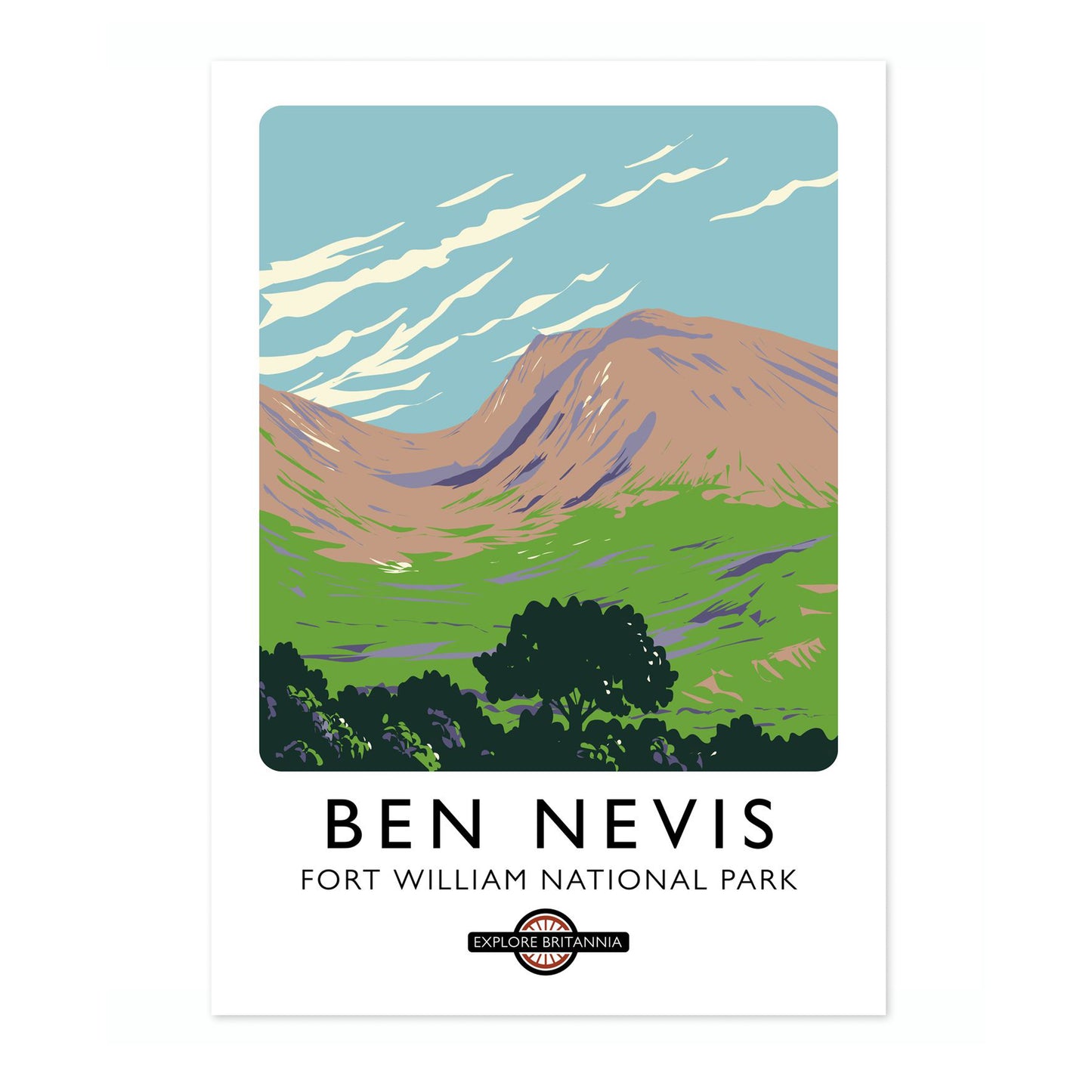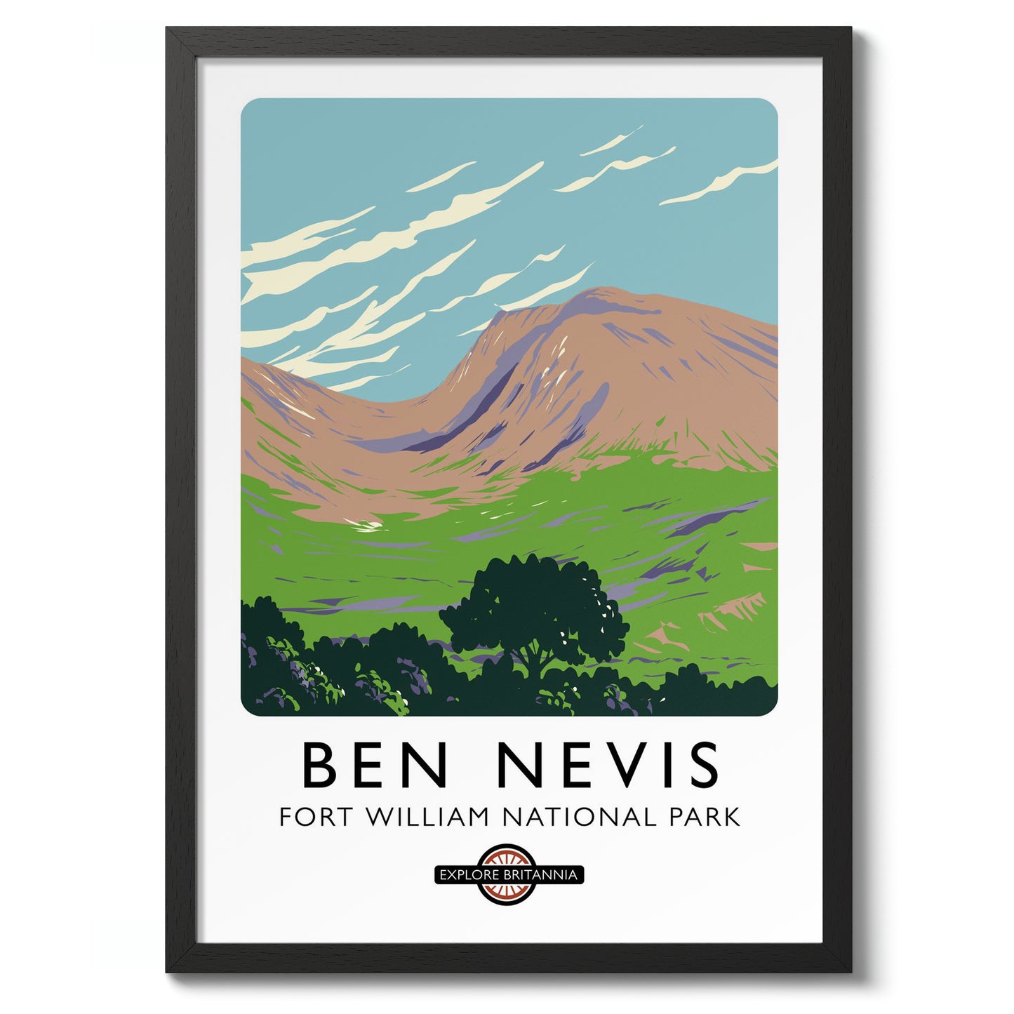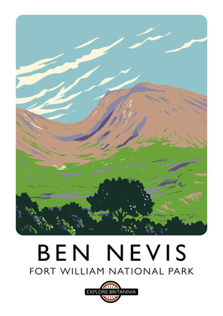 This Ben Nevis poster beautifully captures the serene landscape of Fort William National Park. Featuring lush green fields under a vibrant blue sky, the illustration conveys the majestic allure of Britain's iconic mountain. Ideal for lovers of travel and nature, this graphic art print highlights the natural beauty and undulating hills of this picturesque region. Perfect for enhancing any space with a touch of scenic tranquility.