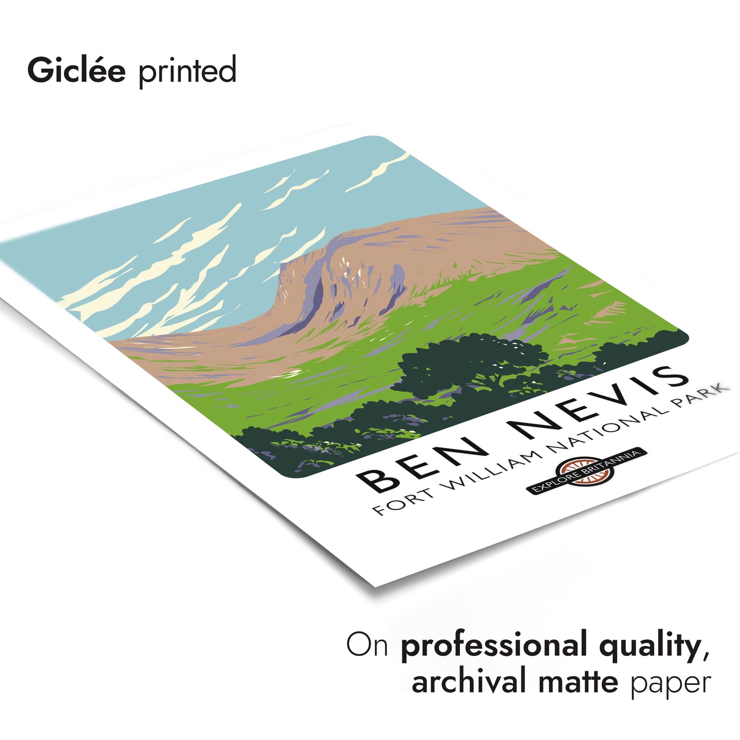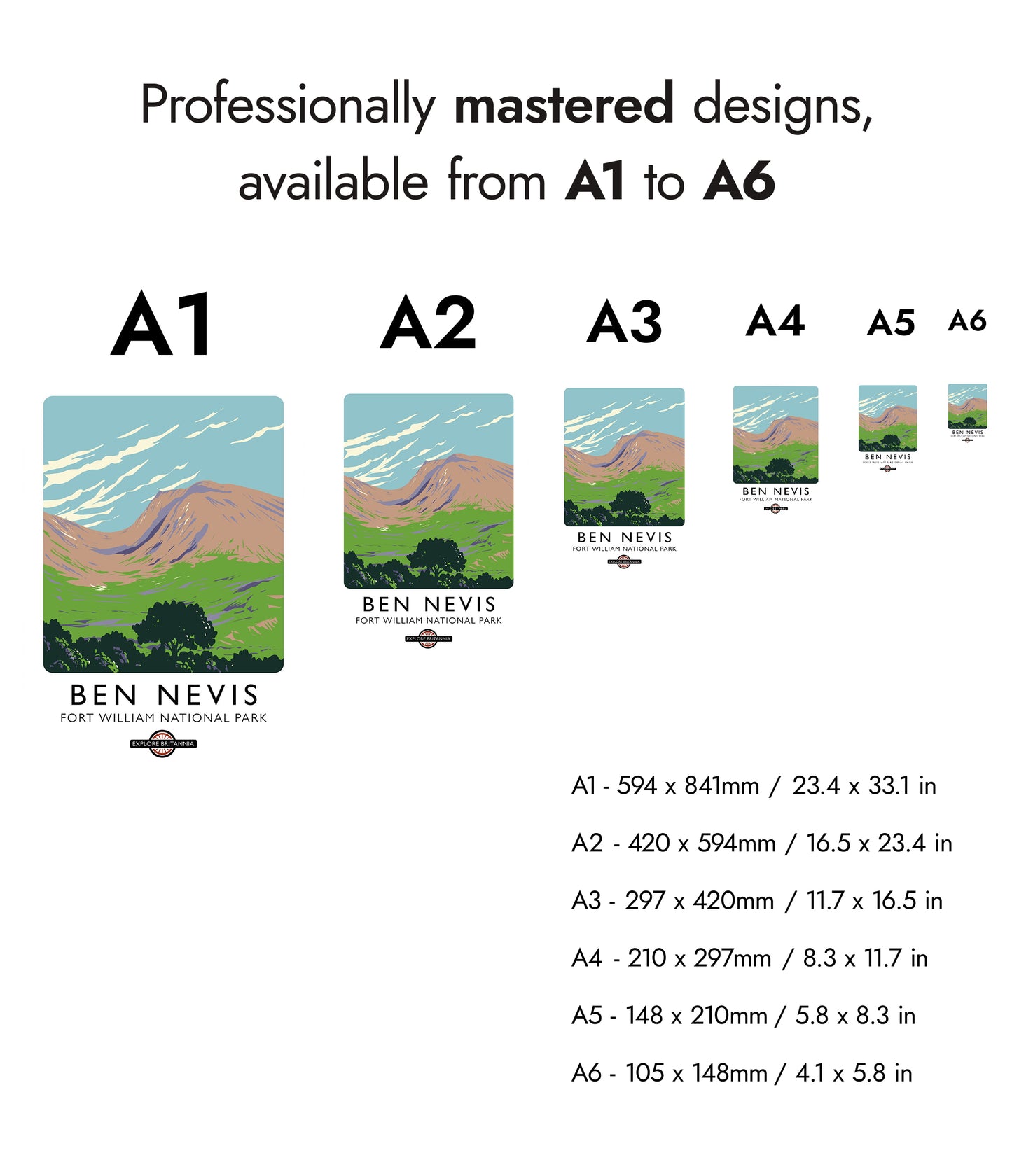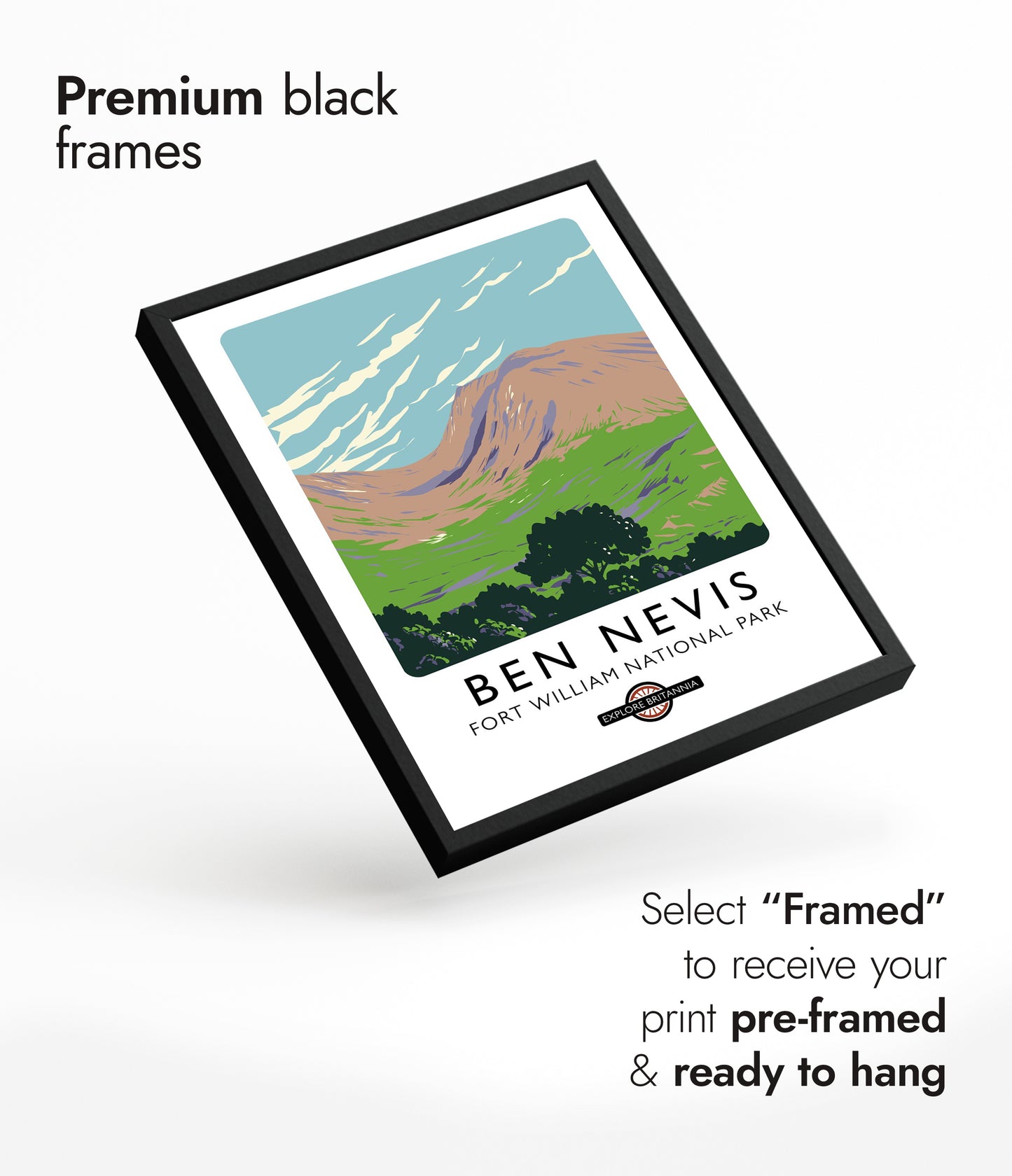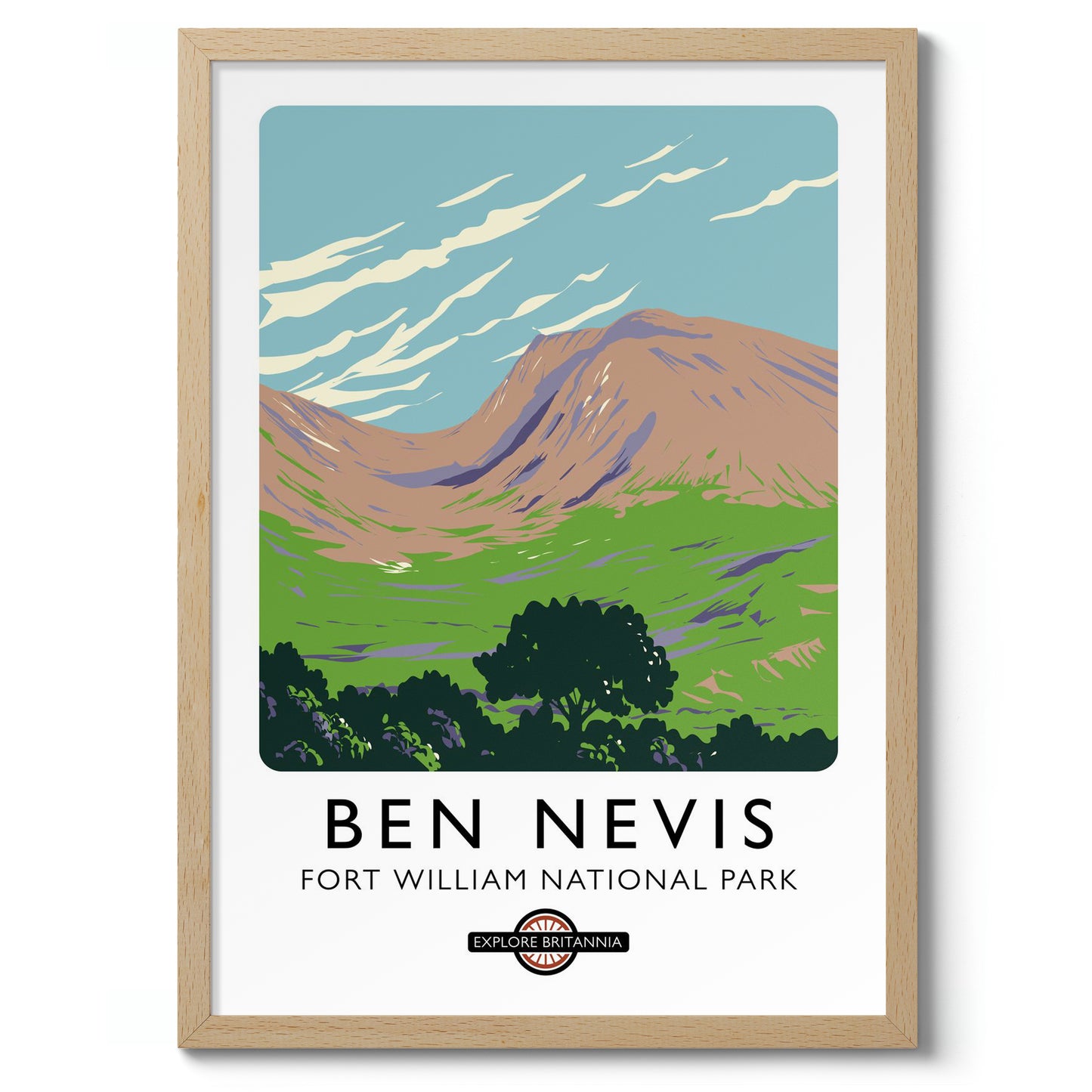 This Ben Nevis poster beautifully captures the serene landscape of Fort William National Park. Featuring lush green fields under a vibrant blue sky, the illustration conveys the majestic allure of Britain's iconic mountain. Ideal for lovers of travel and nature, this graphic art print highlights the natural beauty and undulating hills of this picturesque region. Perfect for enhancing any space with a touch of scenic tranquility.