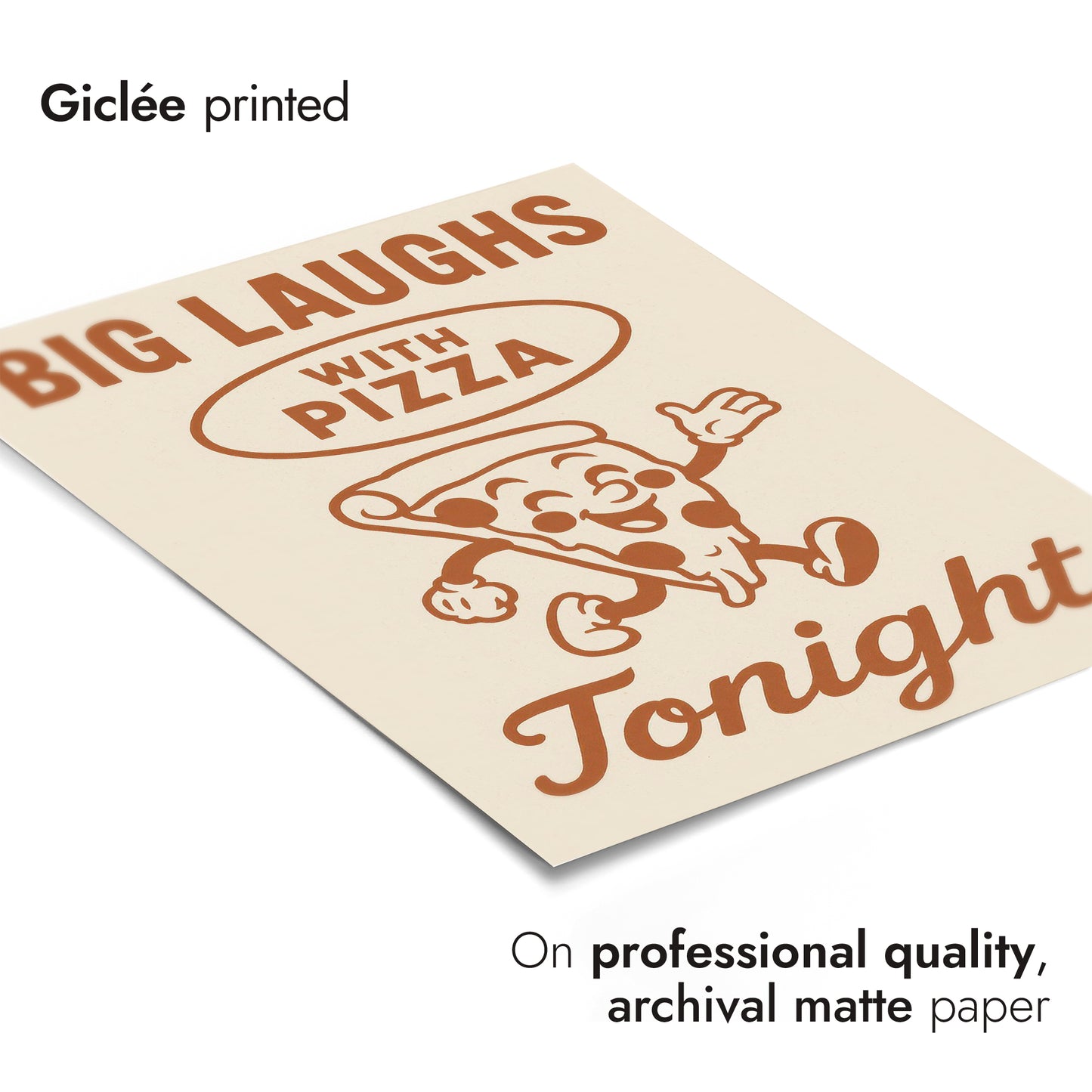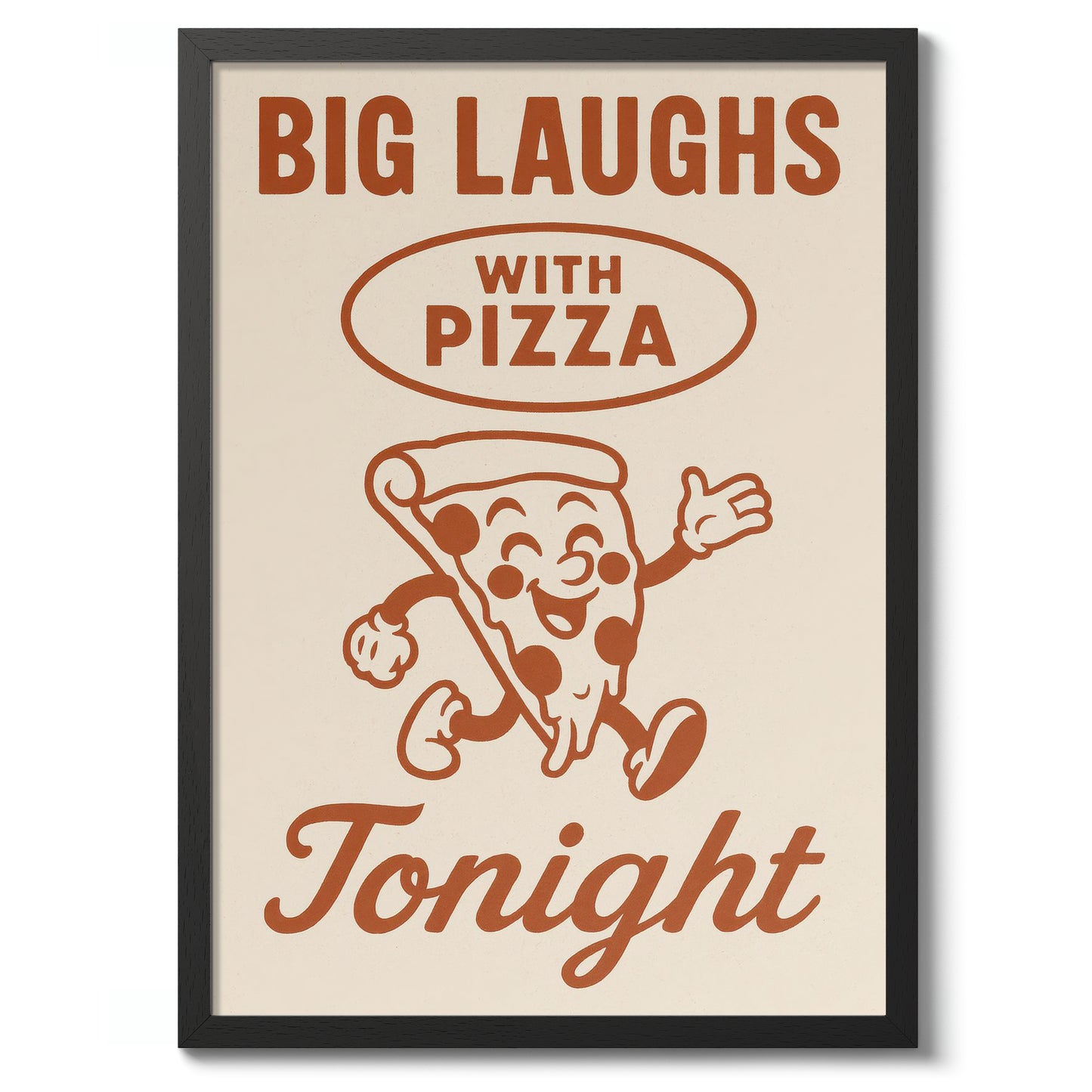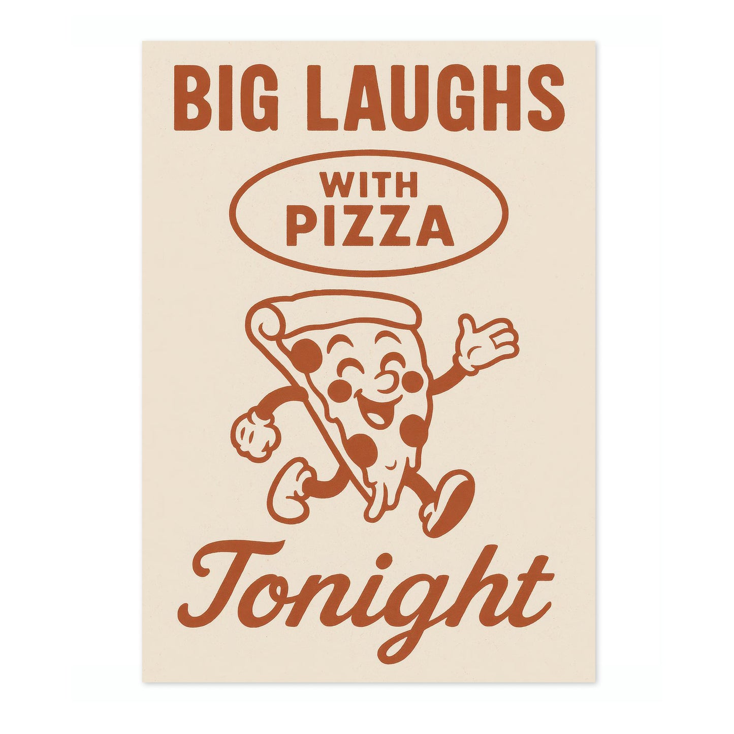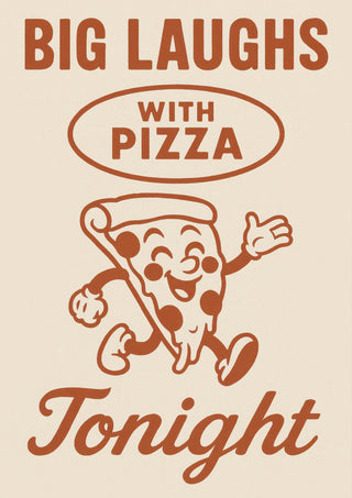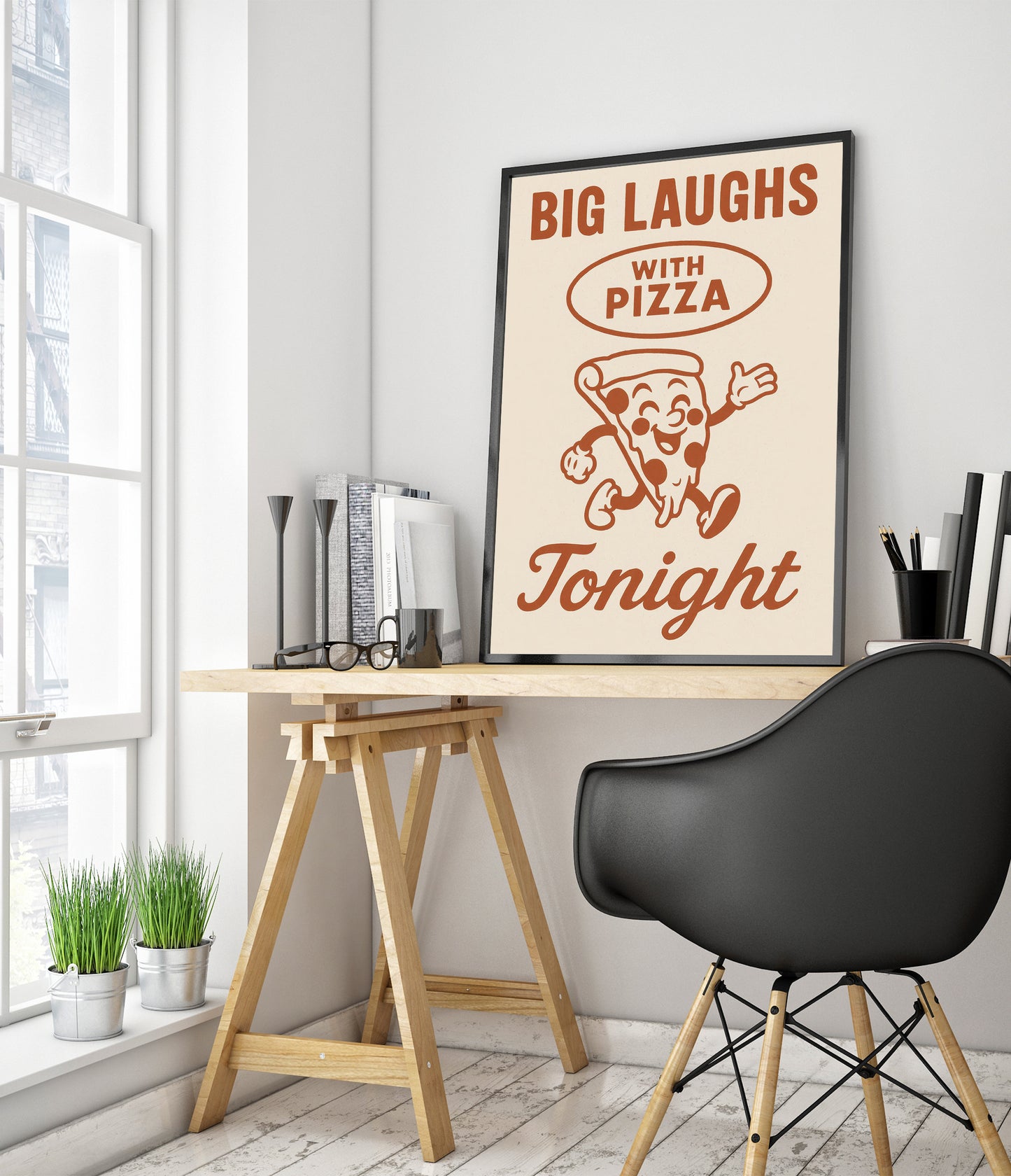 This vintage-style poster features a cheerful, anthropomorphic pizza slice mascot, exuding a playful vibe. The illustration includes bold typography with the tagline "Big Laughs with Pizza Tonight" in a warm orange hue. Its retro aesthetic and food theme make it an ideal piece for adding a touch of humor and nostalgia to your space, perfect for pizza enthusiasts and collectors of unique typography art.