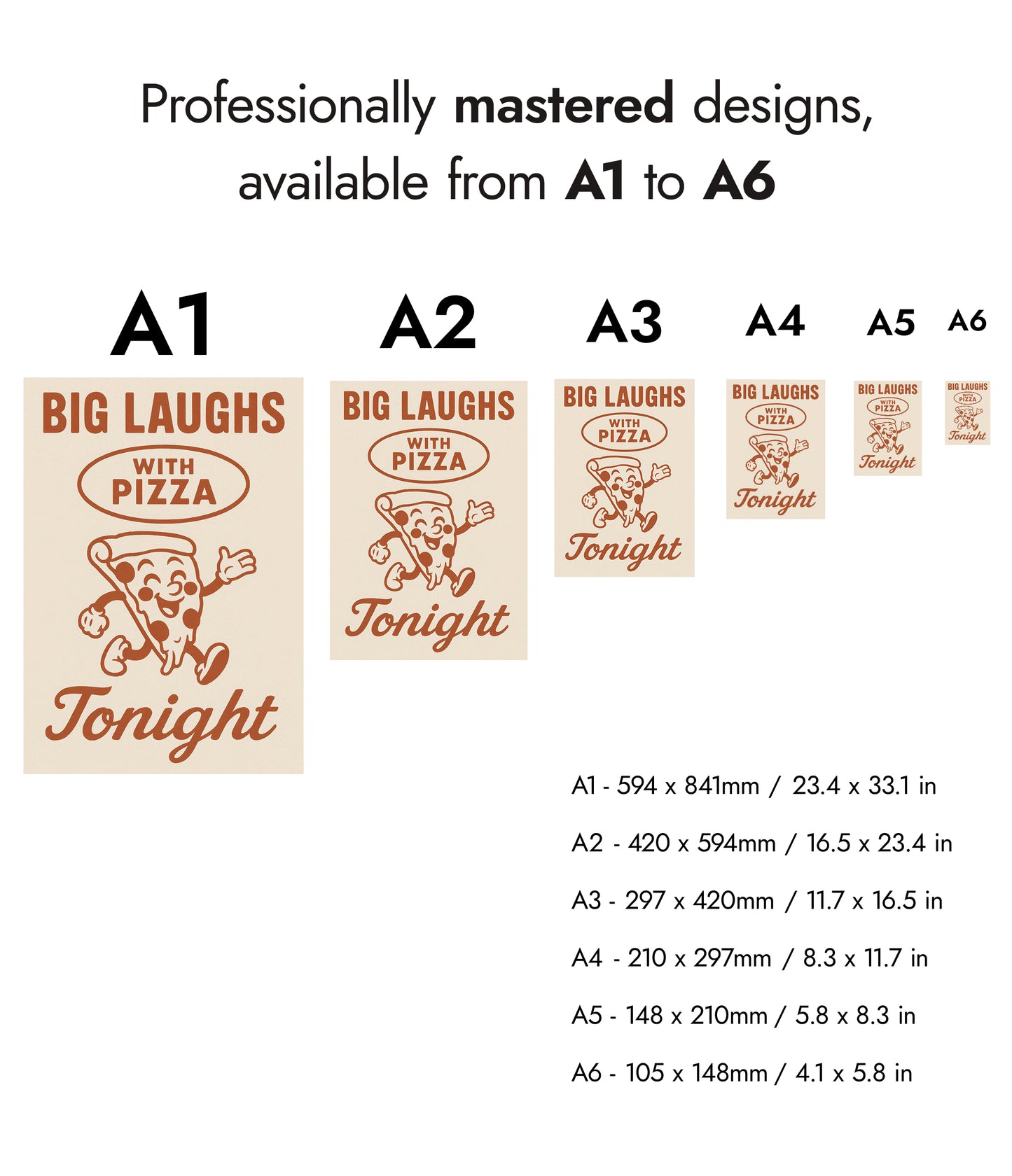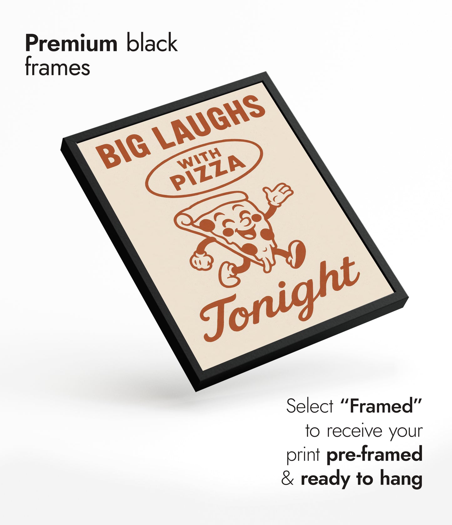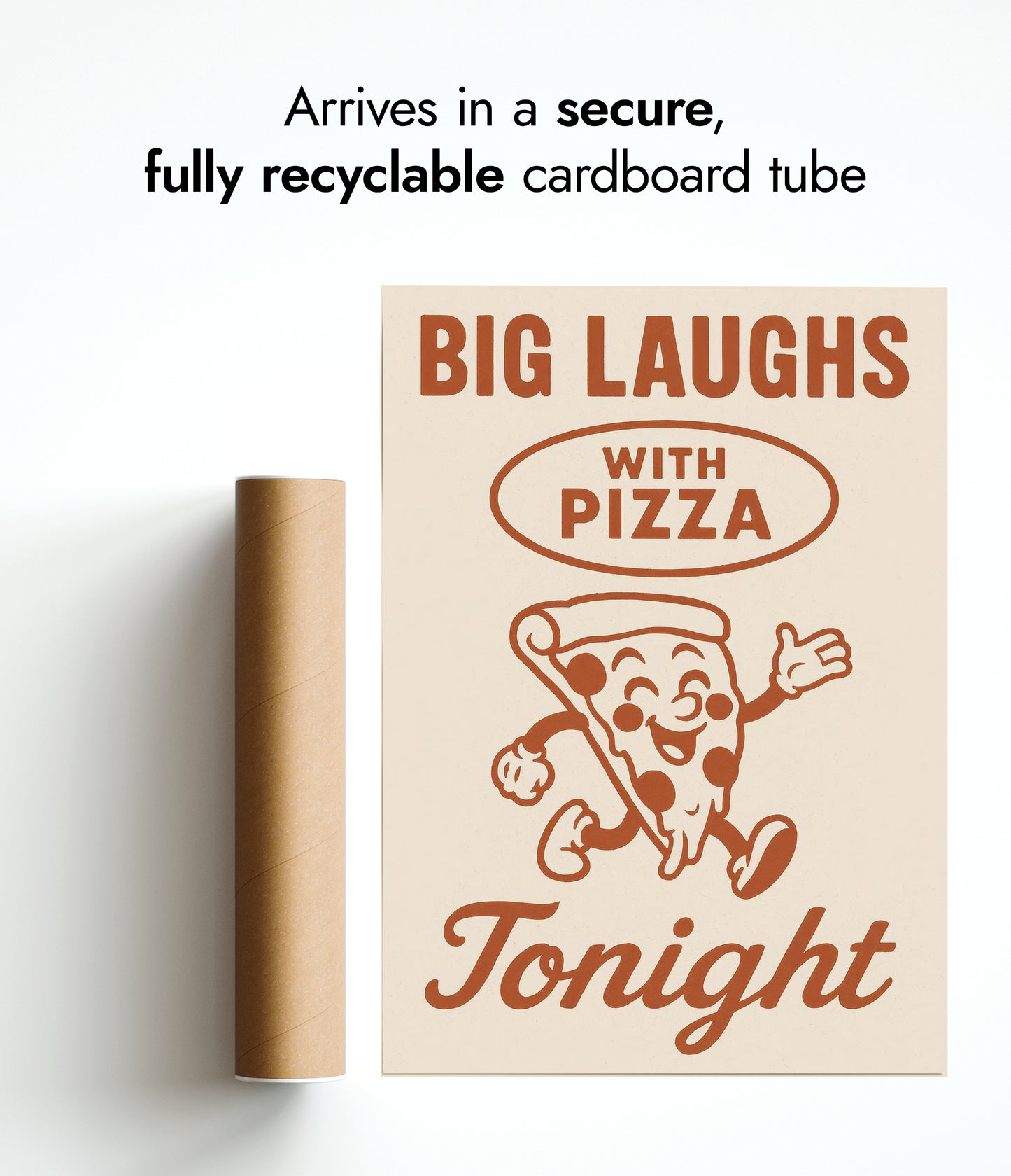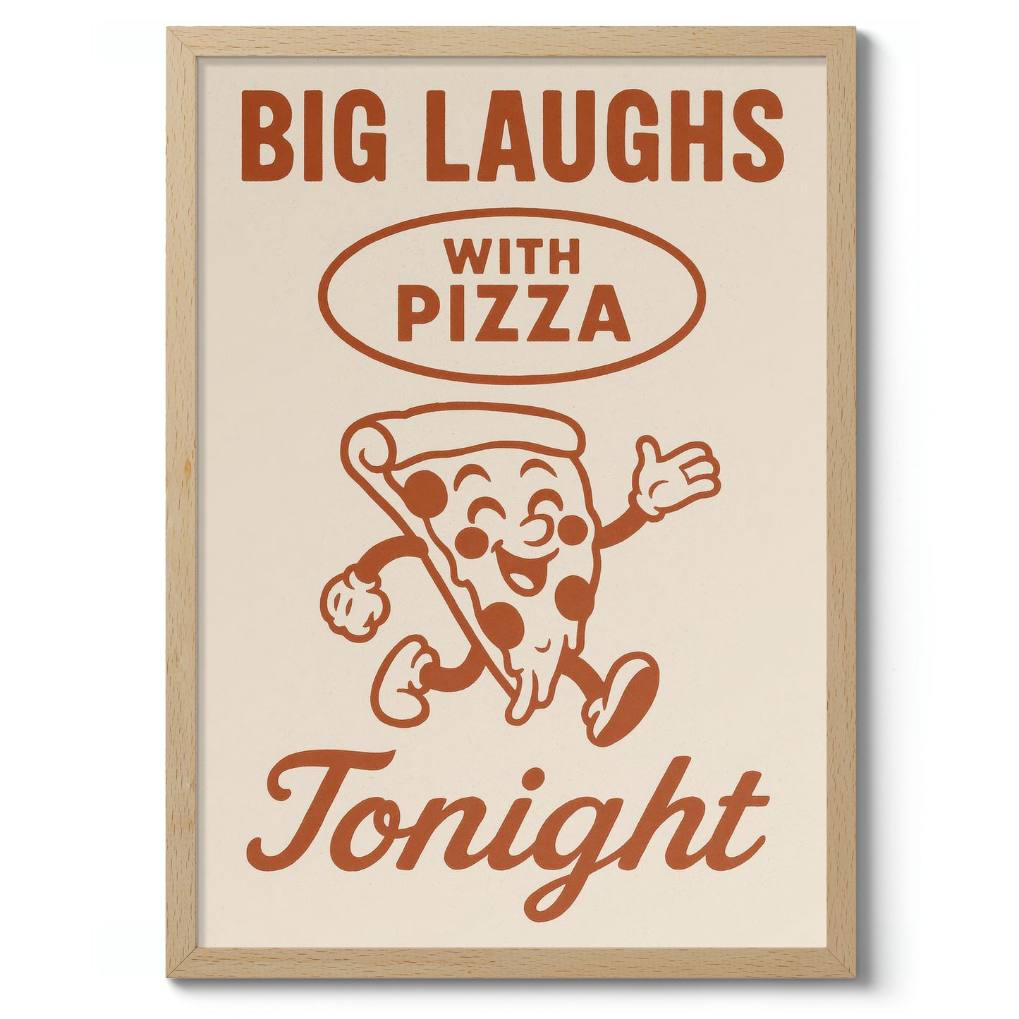 This vintage-style poster features a cheerful, anthropomorphic pizza slice mascot, exuding a playful vibe. The illustration includes bold typography with the tagline "Big Laughs with Pizza Tonight" in a warm orange hue. Its retro aesthetic and food theme make it an ideal piece for adding a touch of humor and nostalgia to your space, perfect for pizza enthusiasts and collectors of unique typography art.