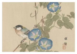 This "Bird & Morning Glory" poster features a traditional Japanese woodblock print by artist Kono Bairei. The artwork depicts a tit perched on a branch intertwined with vibrant blue morning glory flowers. The intricate details and soft hues emphasize the serene beauty of nature. Perfect for adding an element of classic Asian art to any space.