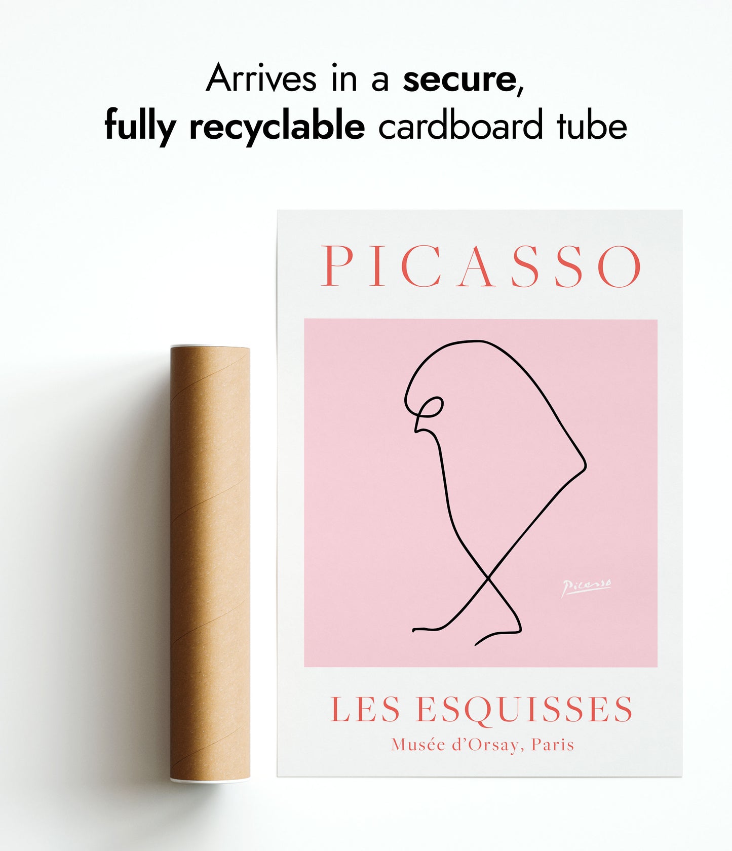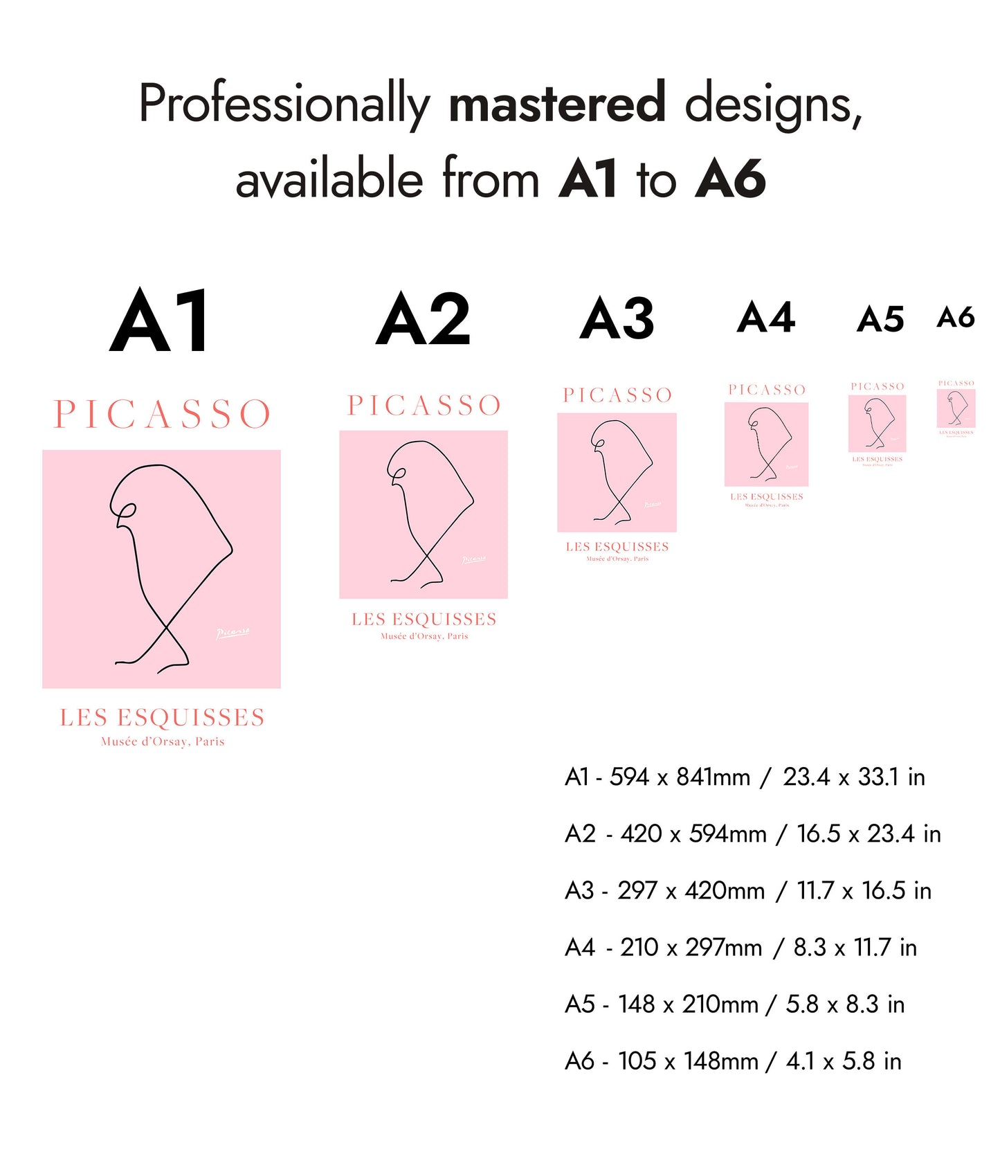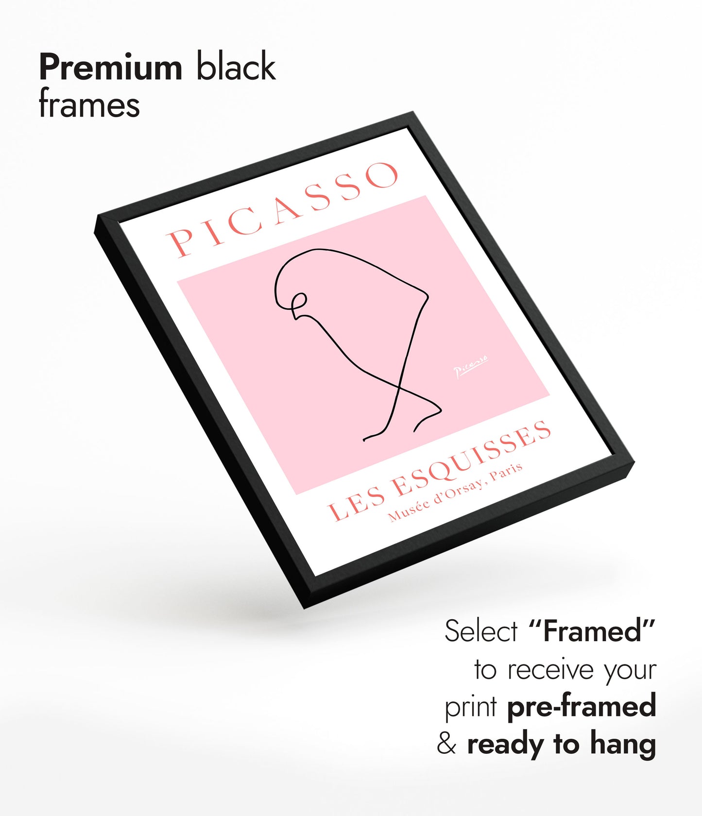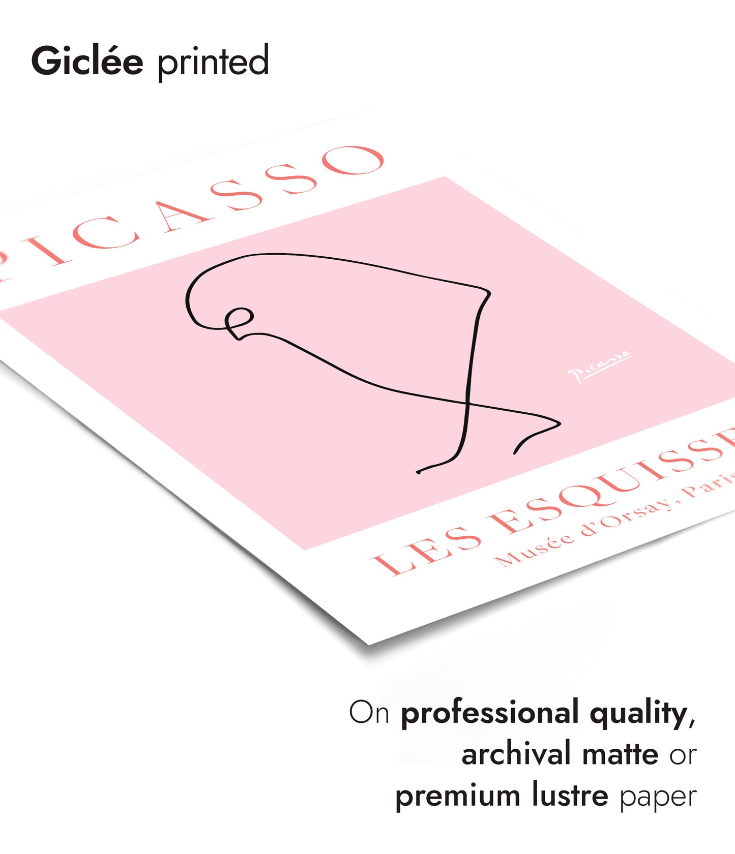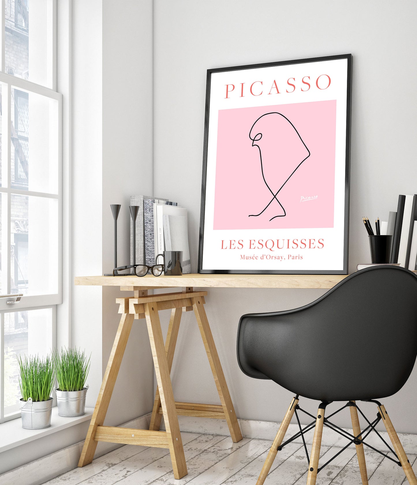 This minimalist poster features Picasso's "Pink Bird," showcasing his iconic line art technique. Displaying a graceful bird, the simple black lines against a soft pink background capture Picasso’s artistic essence. With "Les Esquisses" and "Musée d'Orsay, Paris" inscribed, this art print exudes elegance and timeless charm, perfect for lovers of abstract and minimalist designs.