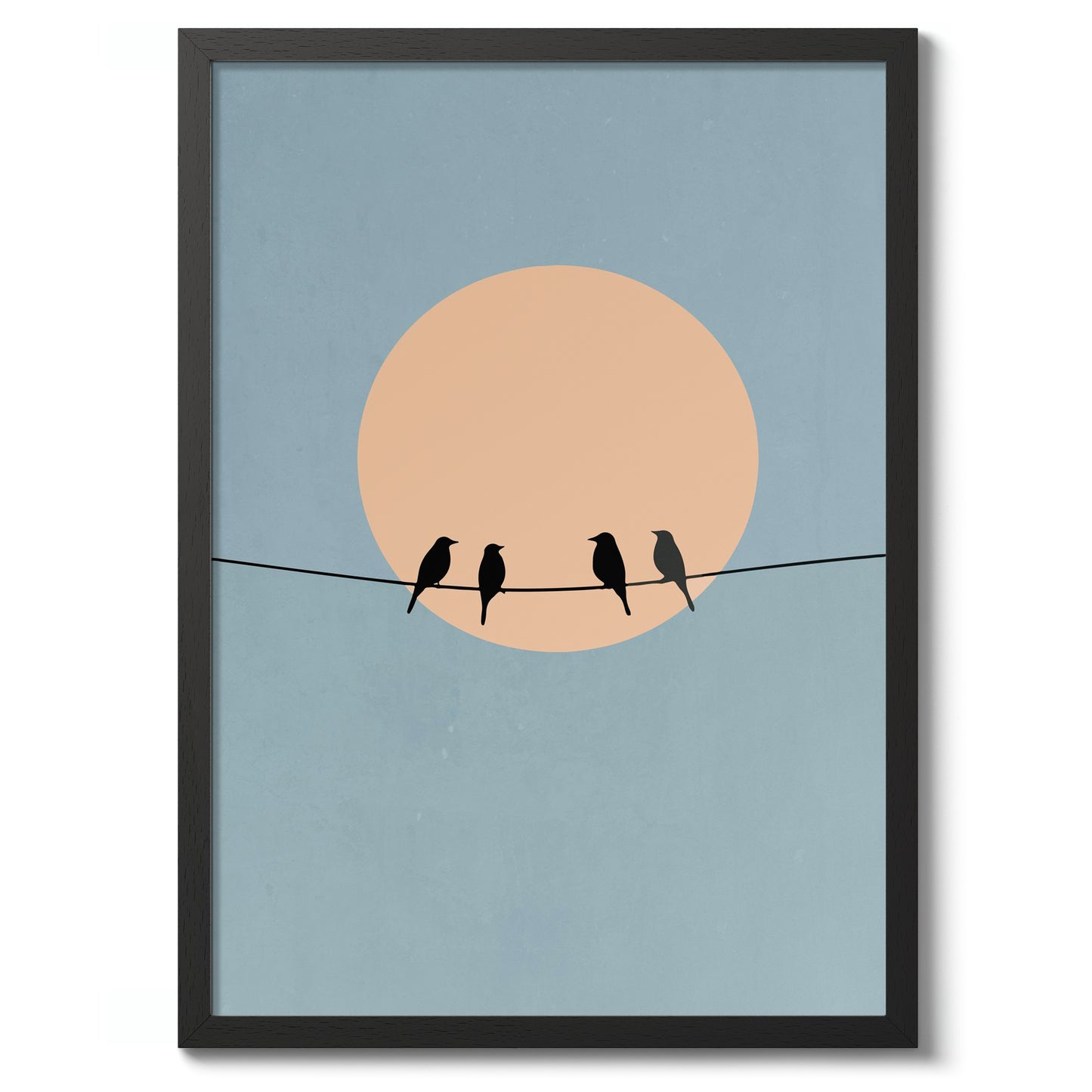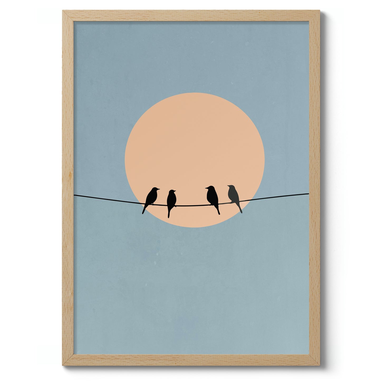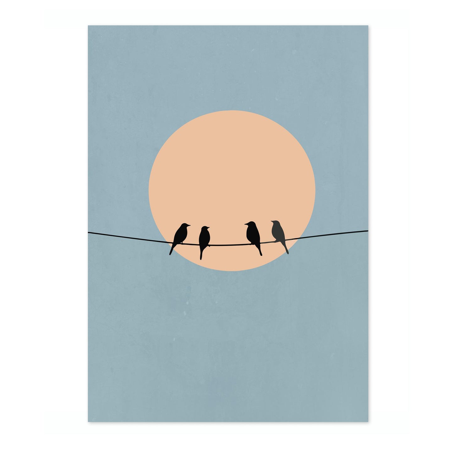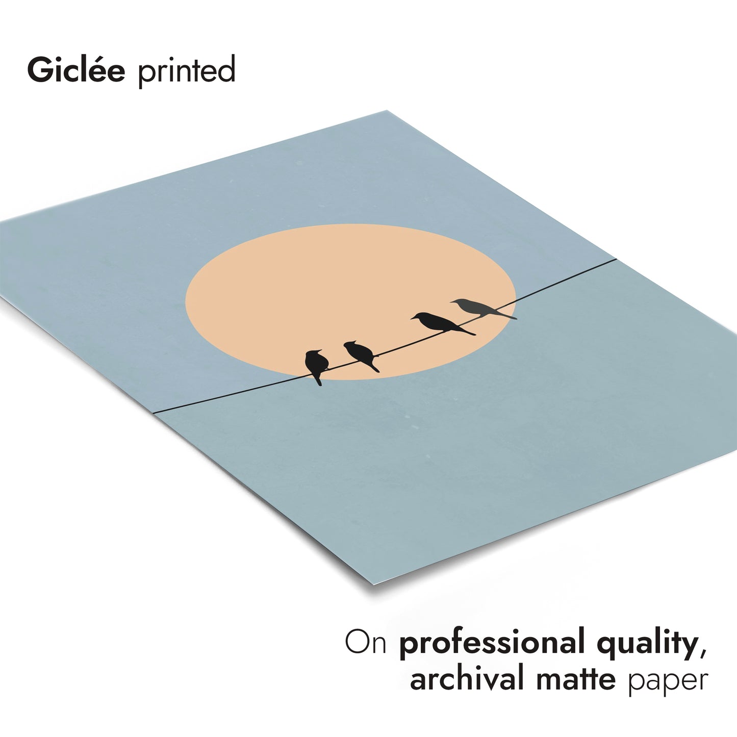 This "Birds on a Wire" poster captures four silhouetted birds perched against a large, pastel sun on a soft blue background. The minimalist design embodies a serene boho aesthetic, evoking themes of sunrise or sunset. Ideal for adding a tranquil touch to any space, this artwork offers a graphic interpretation of nature's simple beauty.