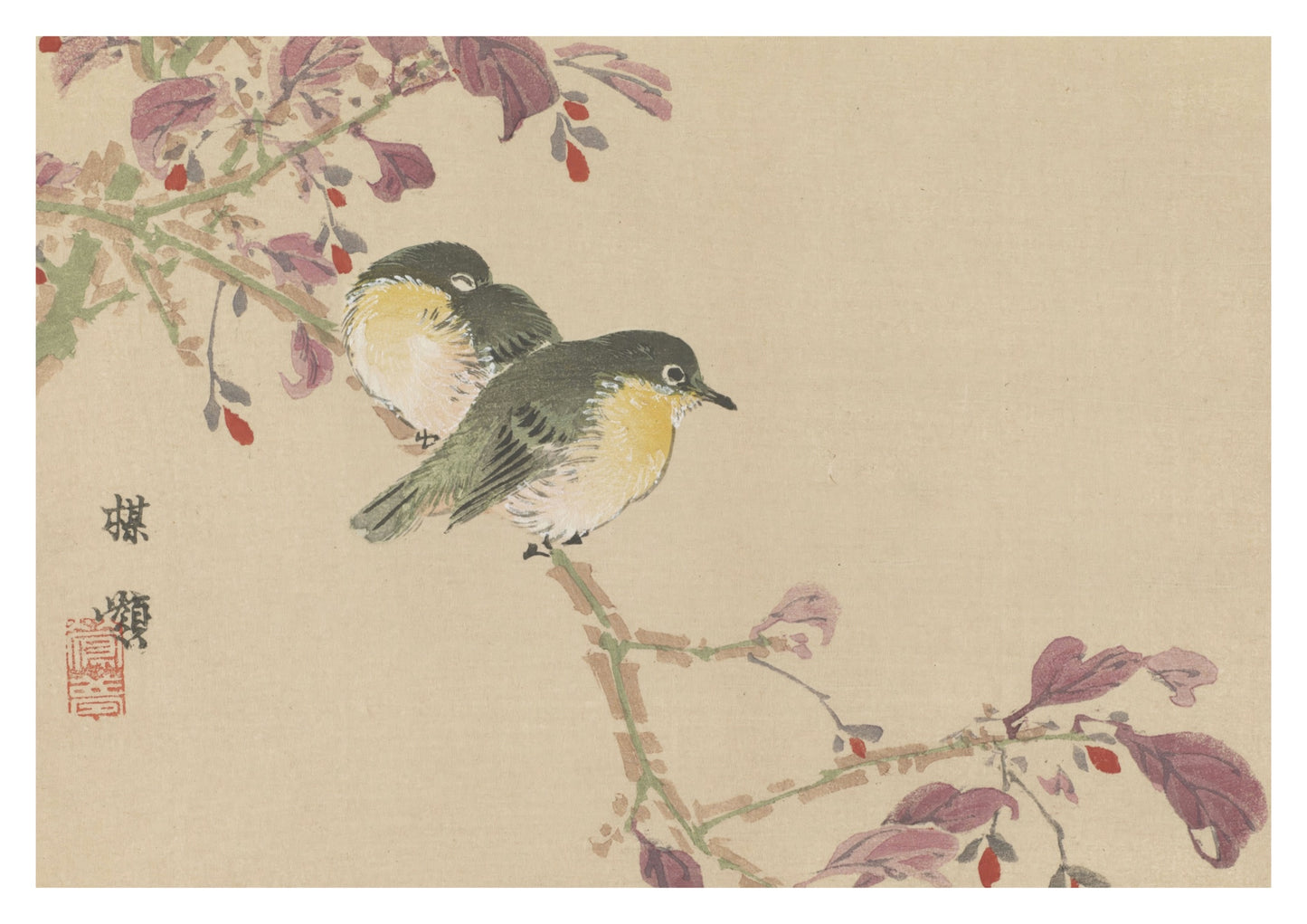 This "Birds on Cherry" poster captures the elegance of two birds perched on a cherry blossom branch. Created by Kono Bairei in traditional Japanese woodblock style, the artwork showcases delicate branches adorned with subtle pink blossoms and intricate bird details. Ideal for lovers of ukiyo-e and nature themes.
