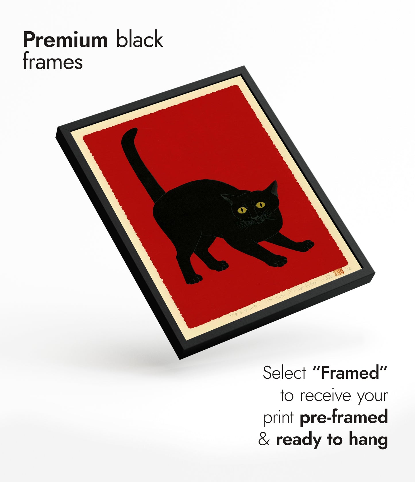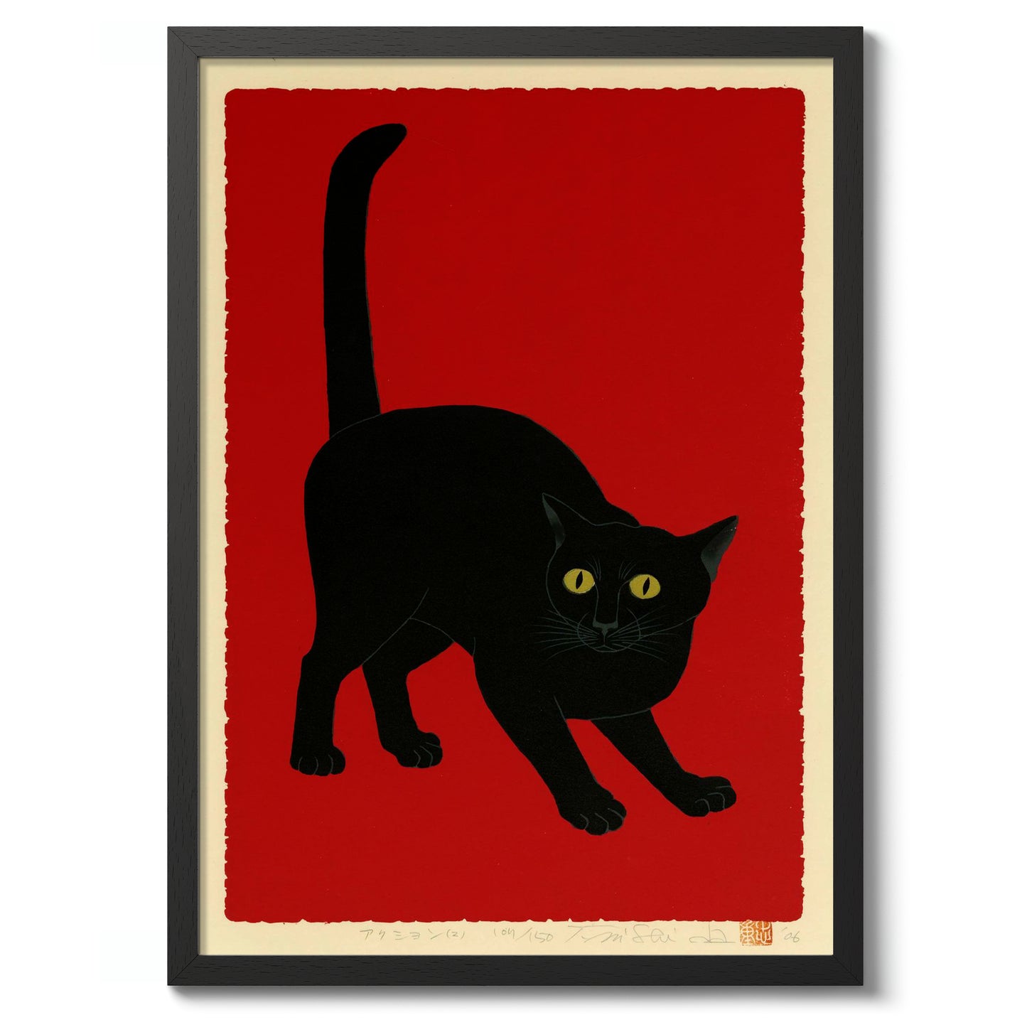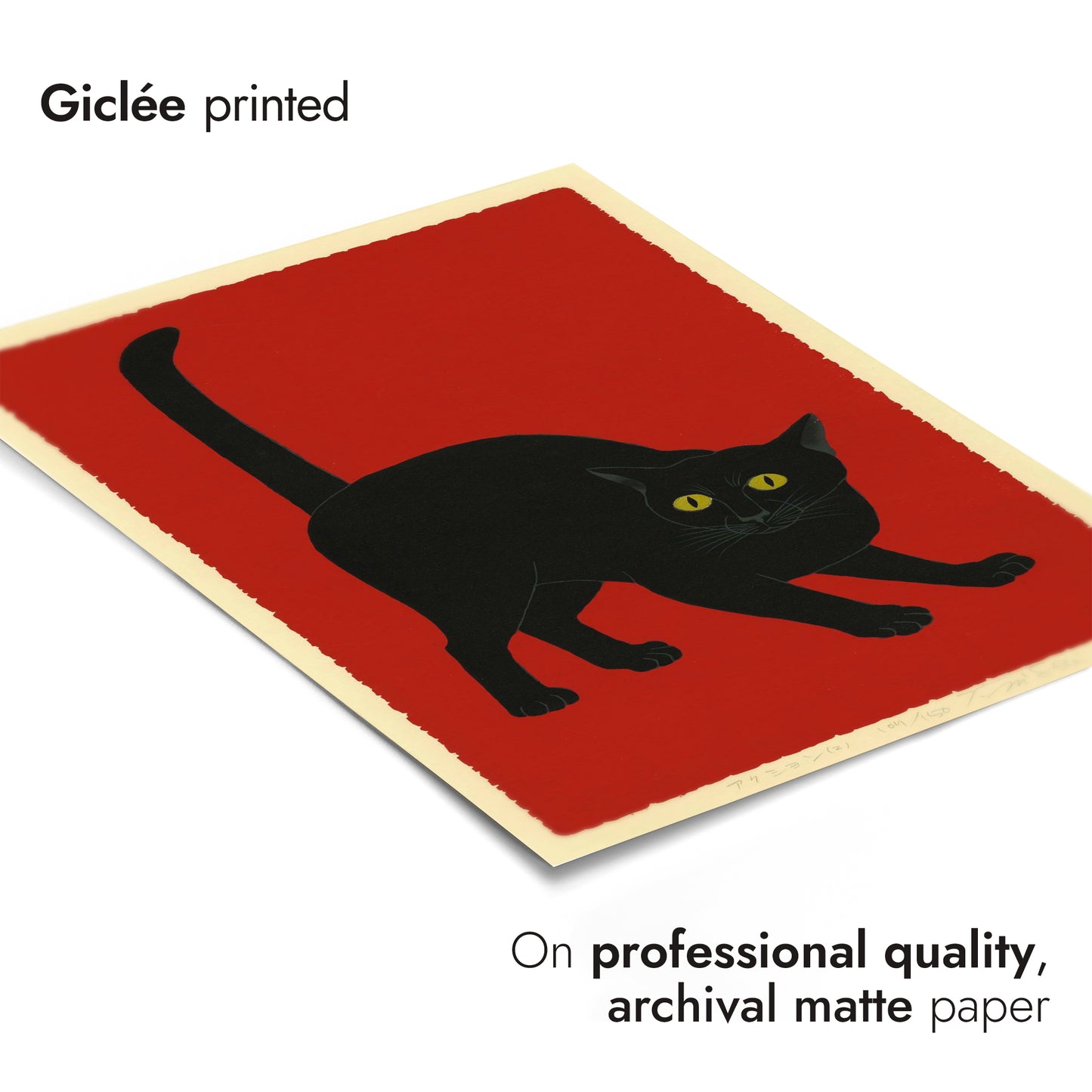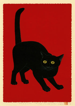 The "Black Cat on Red" poster by Tadashige Nishida features a striking woodblock illustration of a black cat poised against a bold red background. The cat's vivid yellow eyes contrast vividly with the deep red, highlighting its mysterious presence. This traditional Ukiyo-E piece showcases classic Japanese artistry, blending elegant simplicity with vibrant color to capture the essence of feline grace.