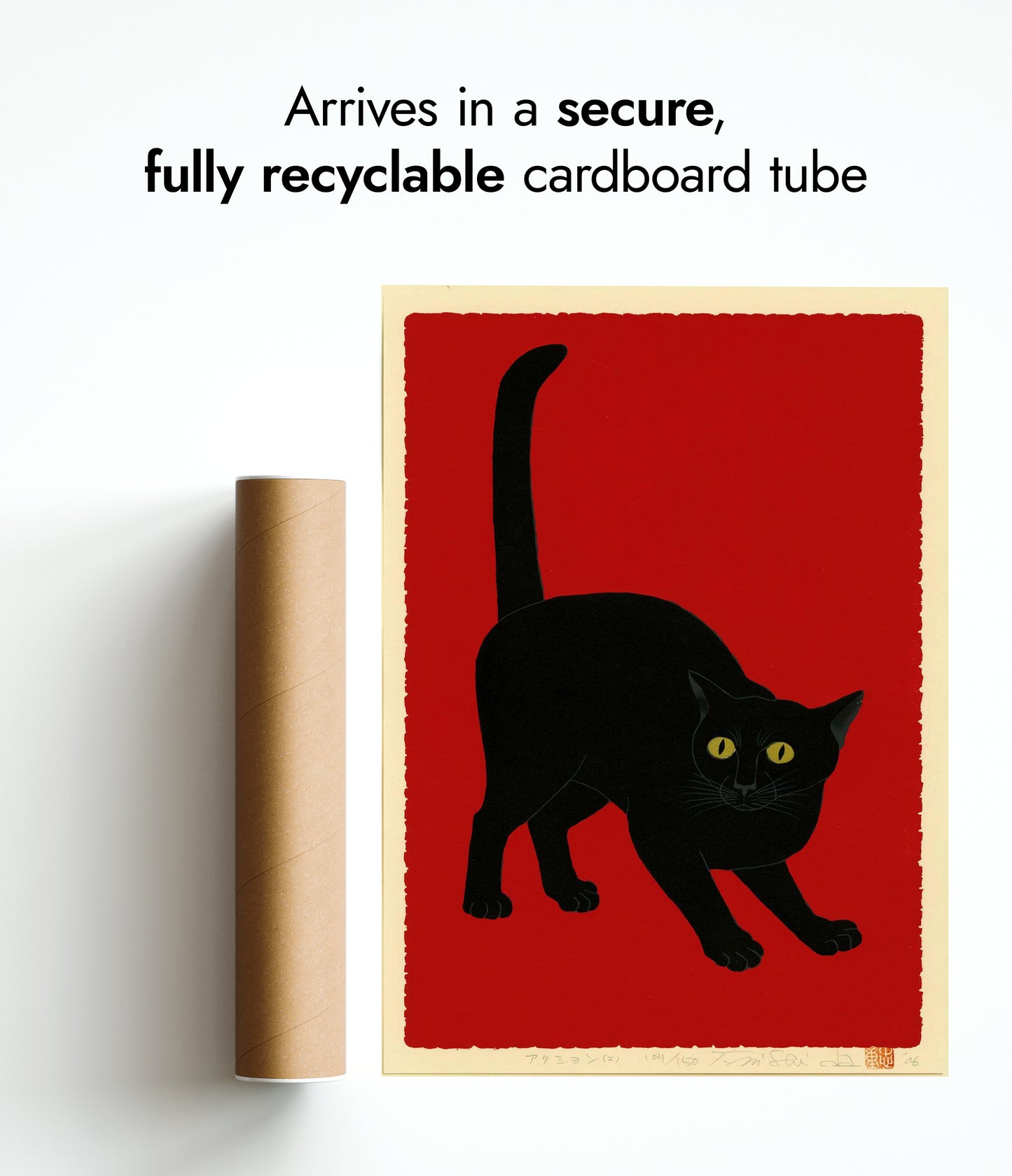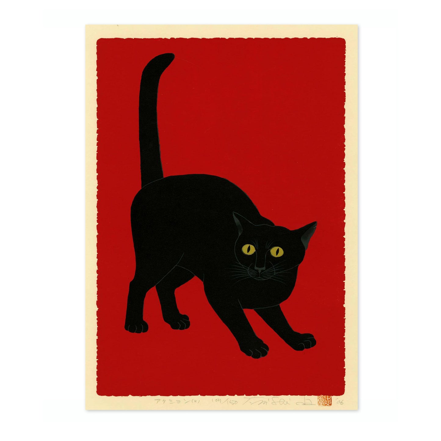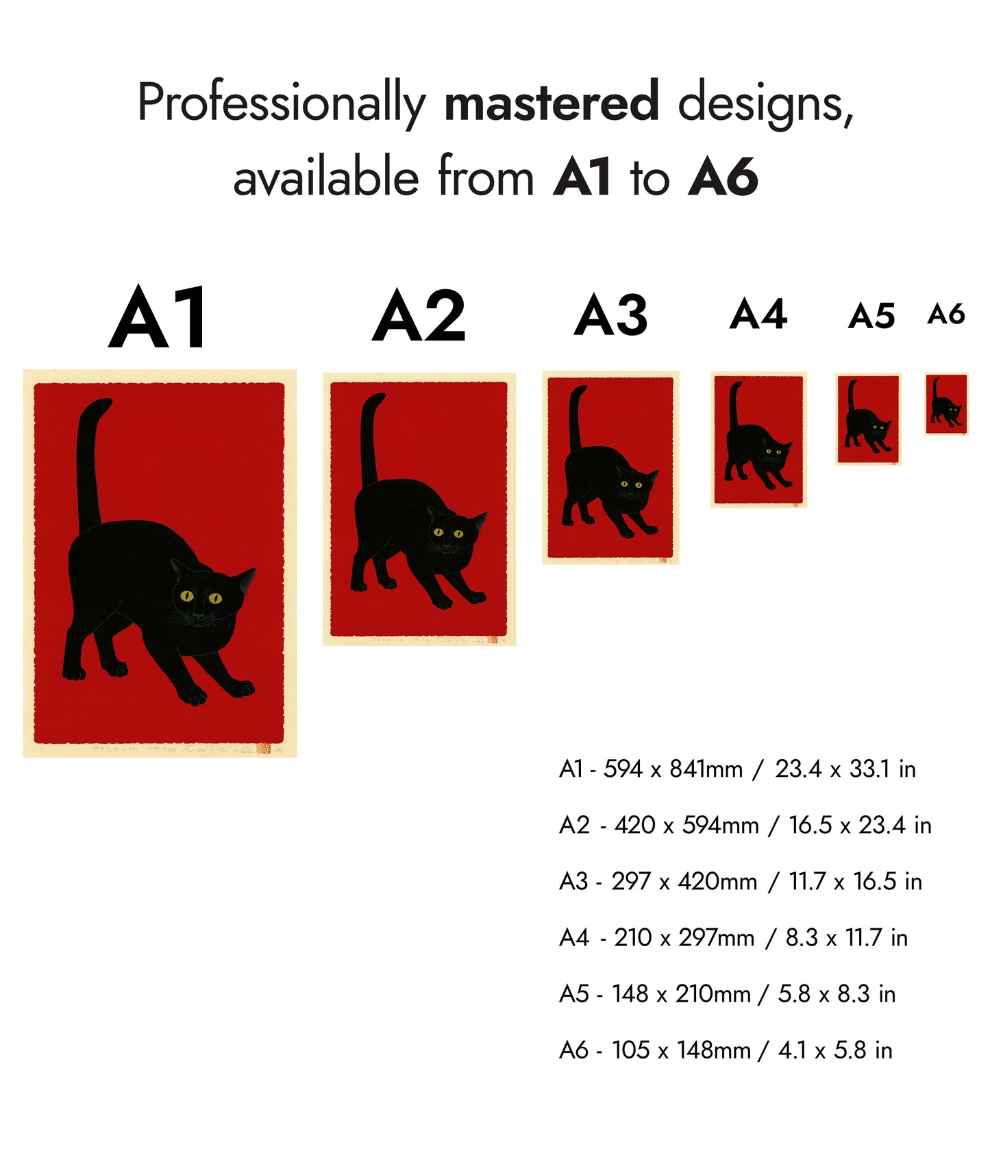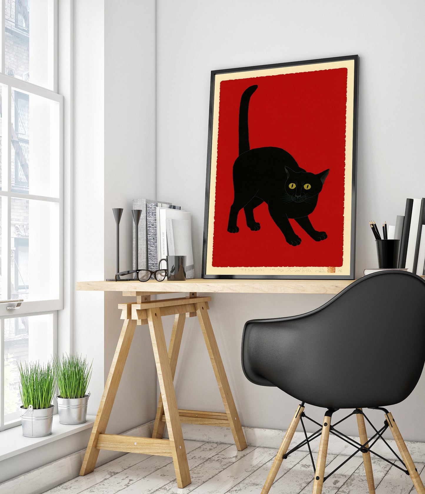 The "Black Cat on Red" poster by Tadashige Nishida features a striking woodblock illustration of a black cat poised against a bold red background. The cat's vivid yellow eyes contrast vividly with the deep red, highlighting its mysterious presence. This traditional Ukiyo-E piece showcases classic Japanese artistry, blending elegant simplicity with vibrant color to capture the essence of feline grace.