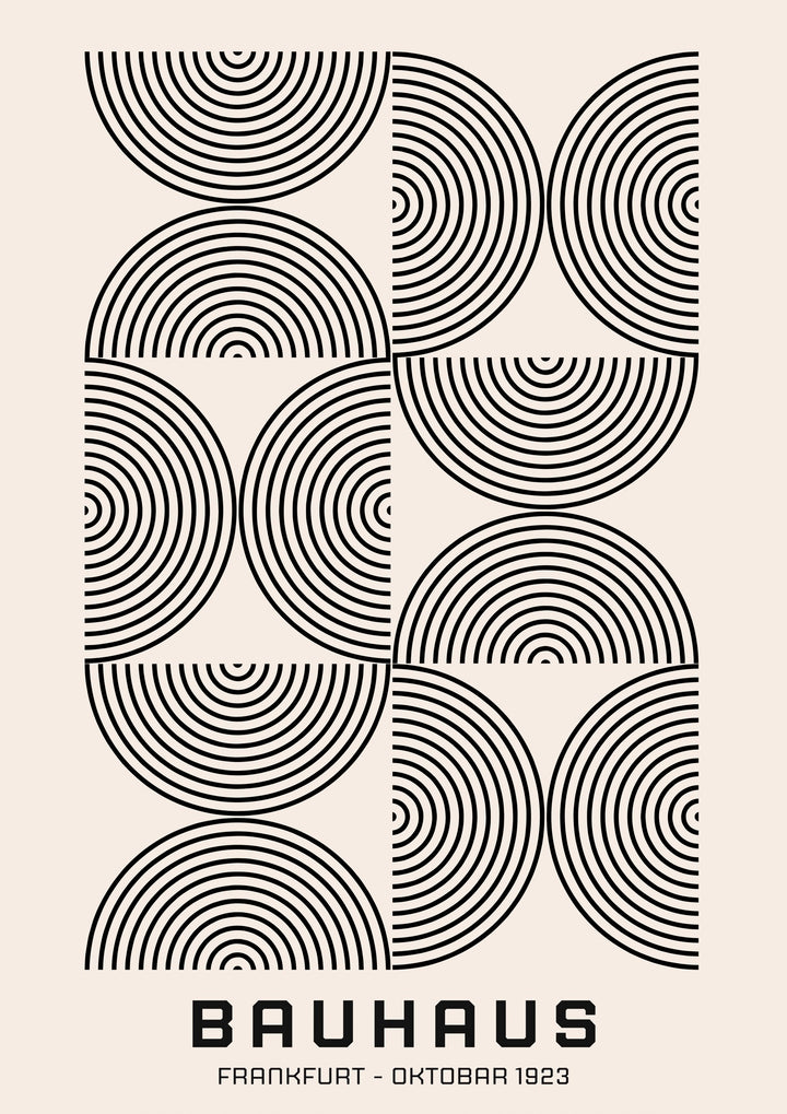 This Bauhaus art print titled "Black Concentric Semi-Circles" showcases a striking geometric design featuring black concentric semi-circles arranged symmetrically against a neutral background. The bold lines and minimalist aesthetic create a captivating contrast, embodying mid-century modern and abstract art styles. Ideal for lovers of graphic and geometric art, this poster adds a sophisticated touch to any space.
