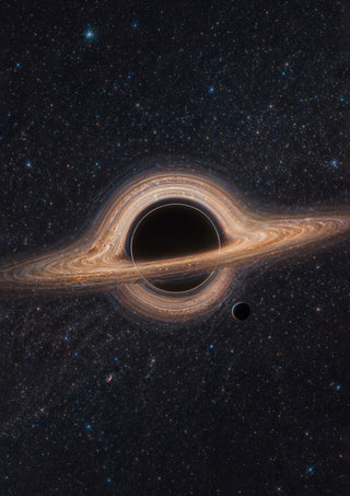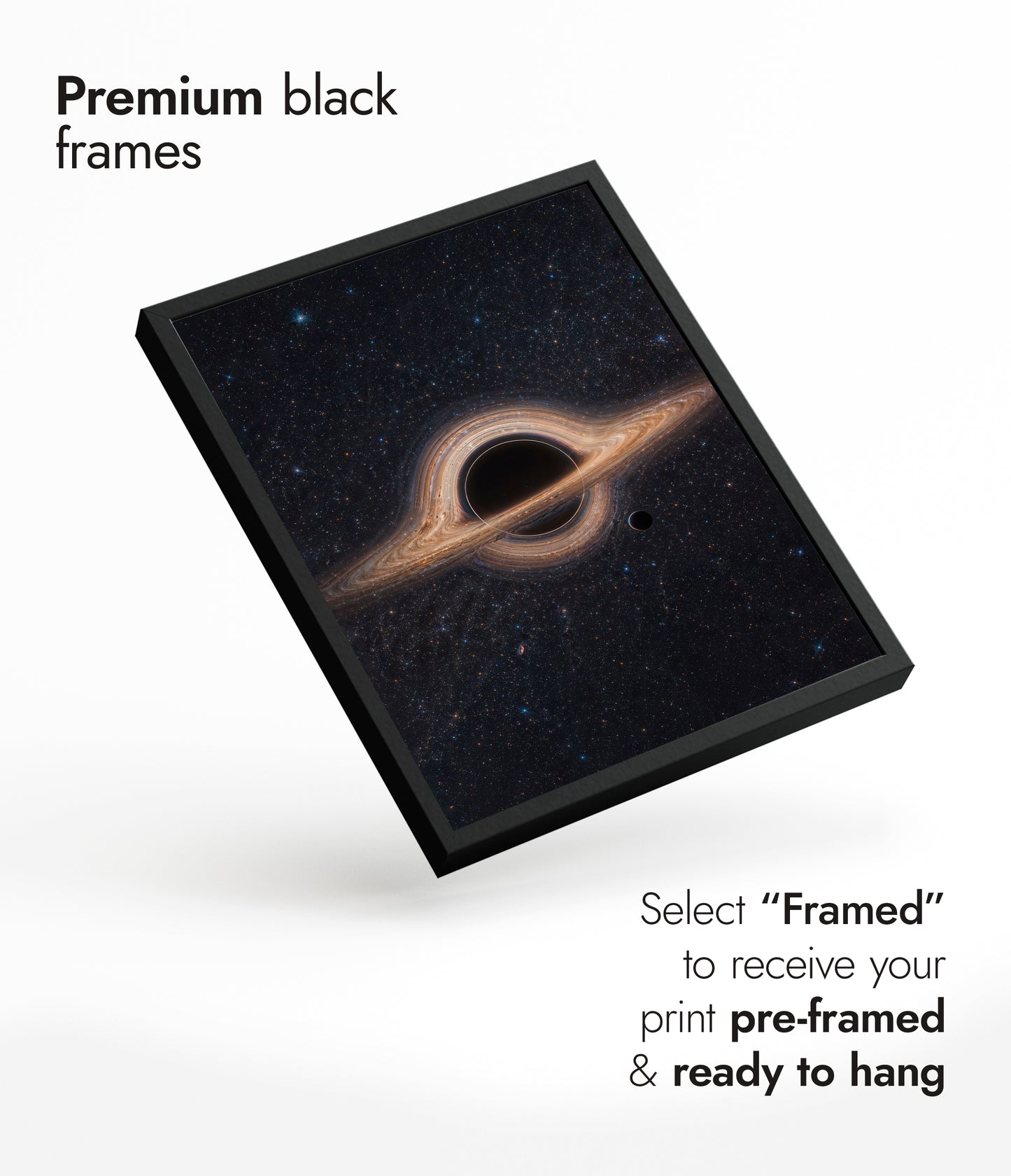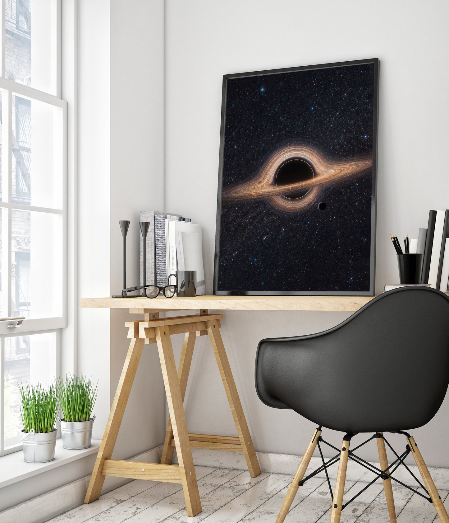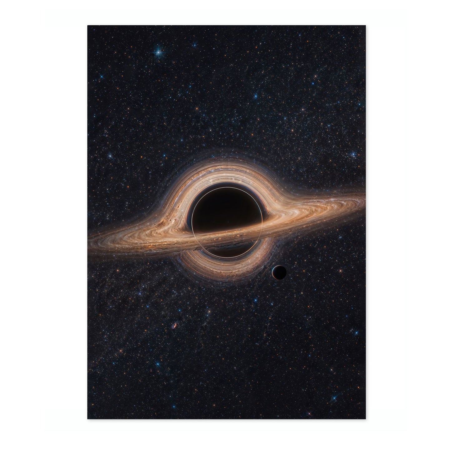 This captivating poster displays a black hole at the heart of a starry expanse, framed by swirling cosmic clouds. Captured through a lens reminiscent of Hubble's powerful observation, it showcases the mysterious gravitational force surrounded by luminous, spiraling galaxies. Ideal for astronomy enthusiasts, this space-themed photographic print offers a mesmerizing glimpse into the wonders of the universe.