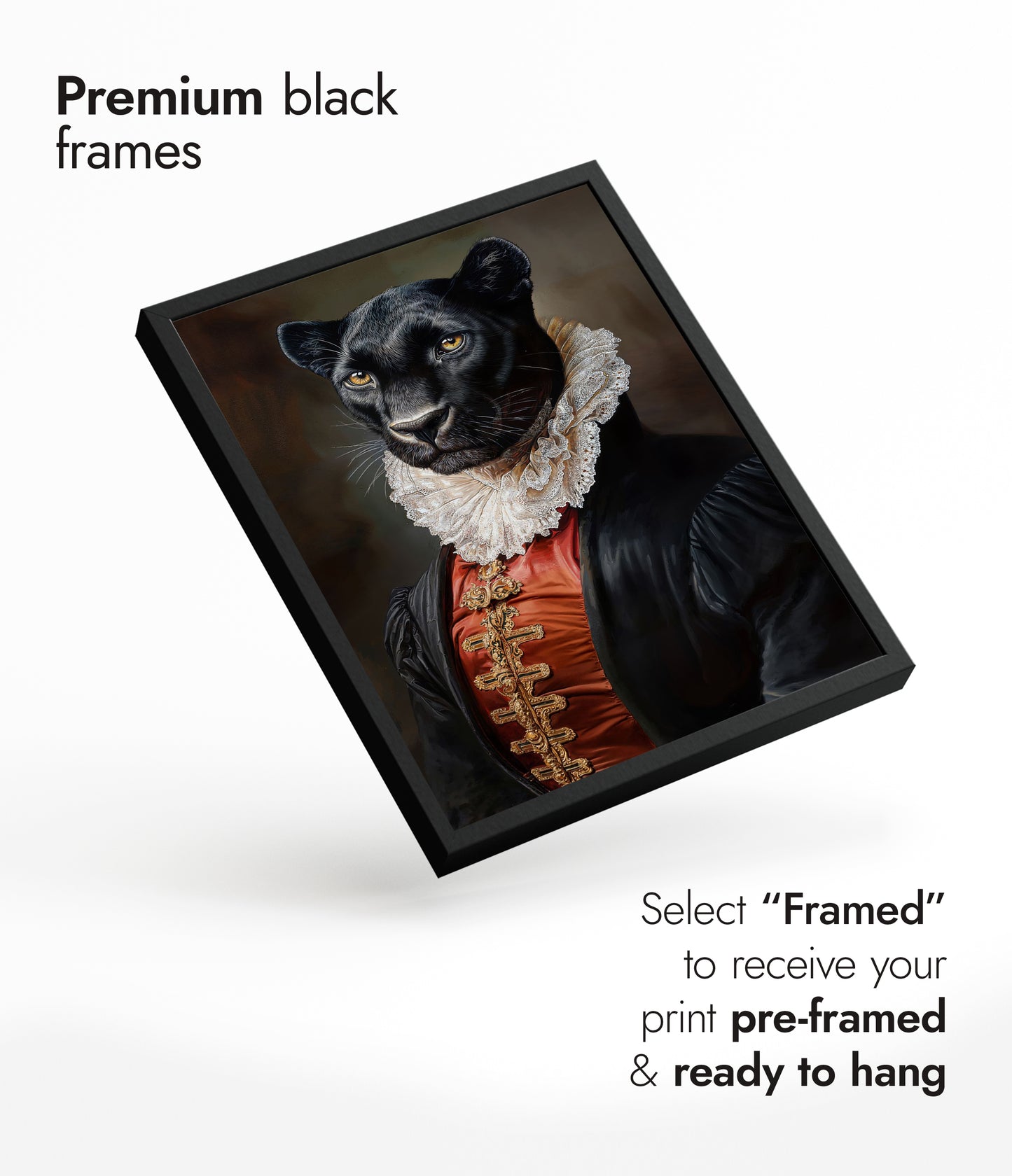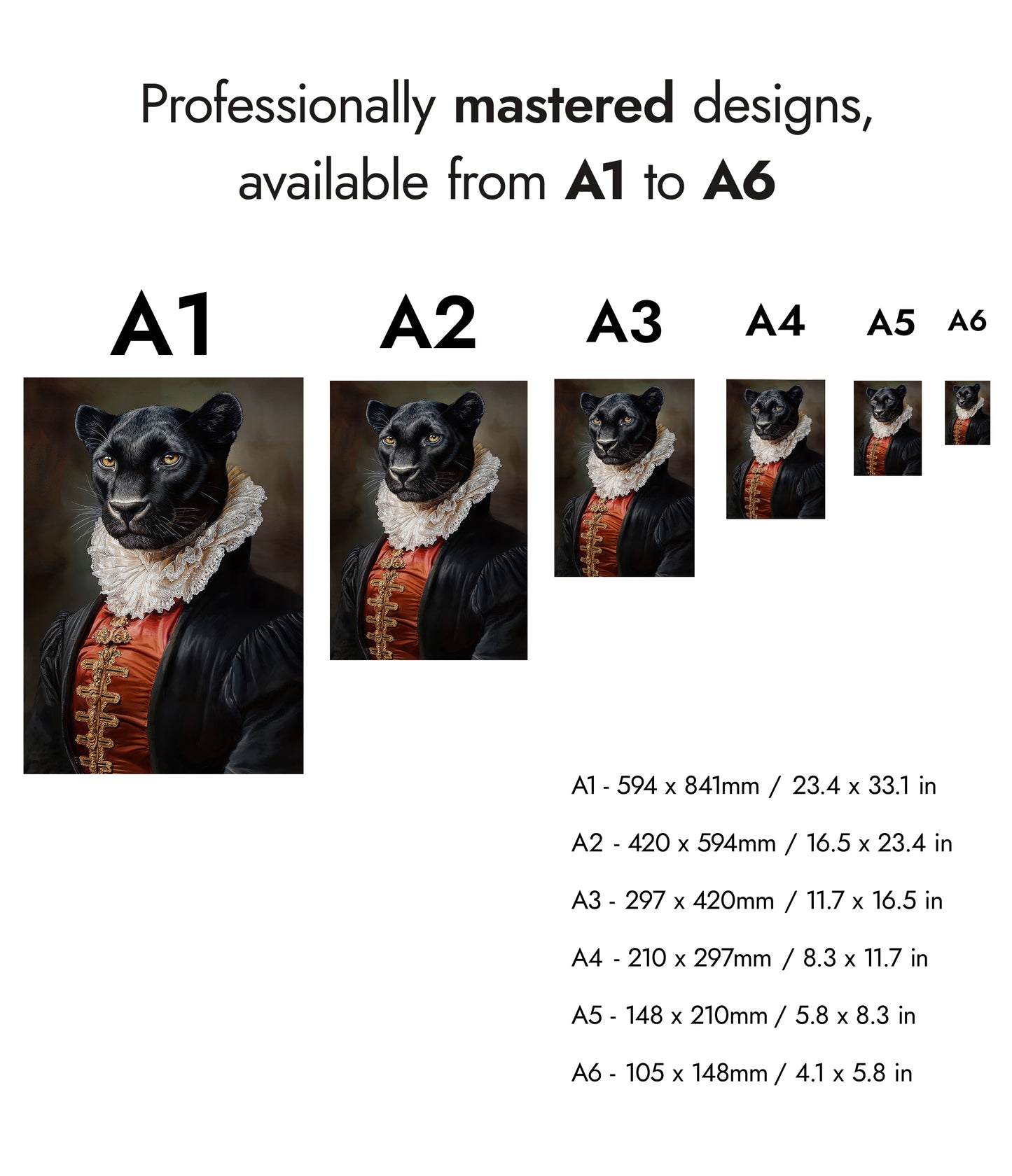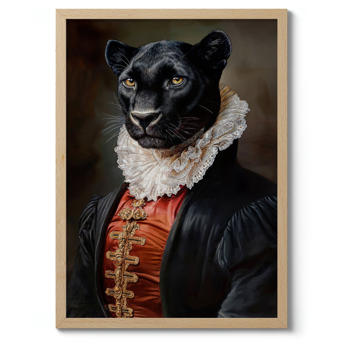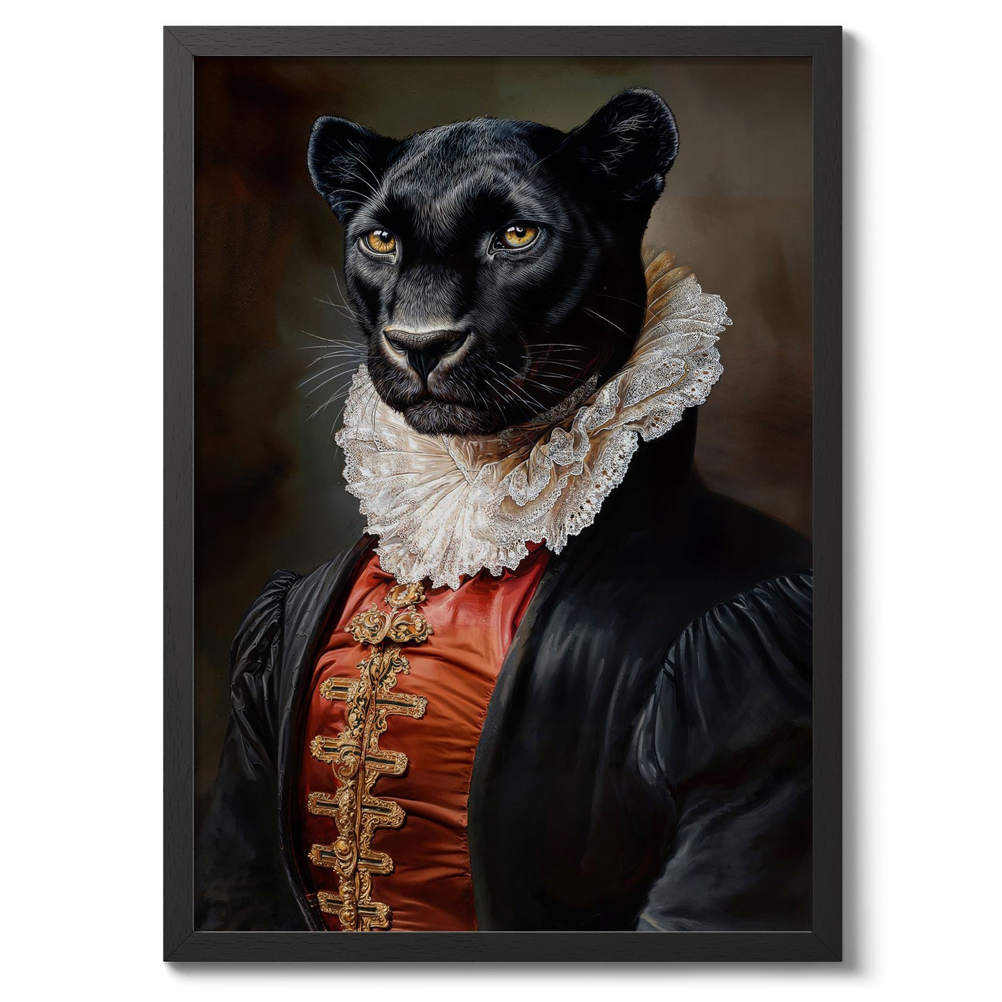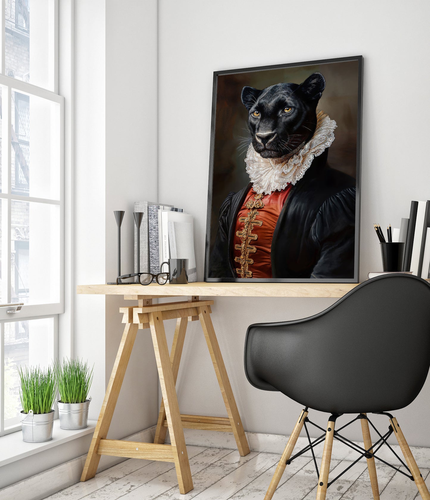 This striking art print features a regal black panther donned in a lavish, historic Tudor costume, complete with an ornate lace ruff and richly detailed garment. The lifelike illustration captures the panther's piercing yellow eyes and sleek fur, juxtaposing the grandeur of historical attire with nature's elegance. Ideal as a unique animal poster for adding character and humor to any space.