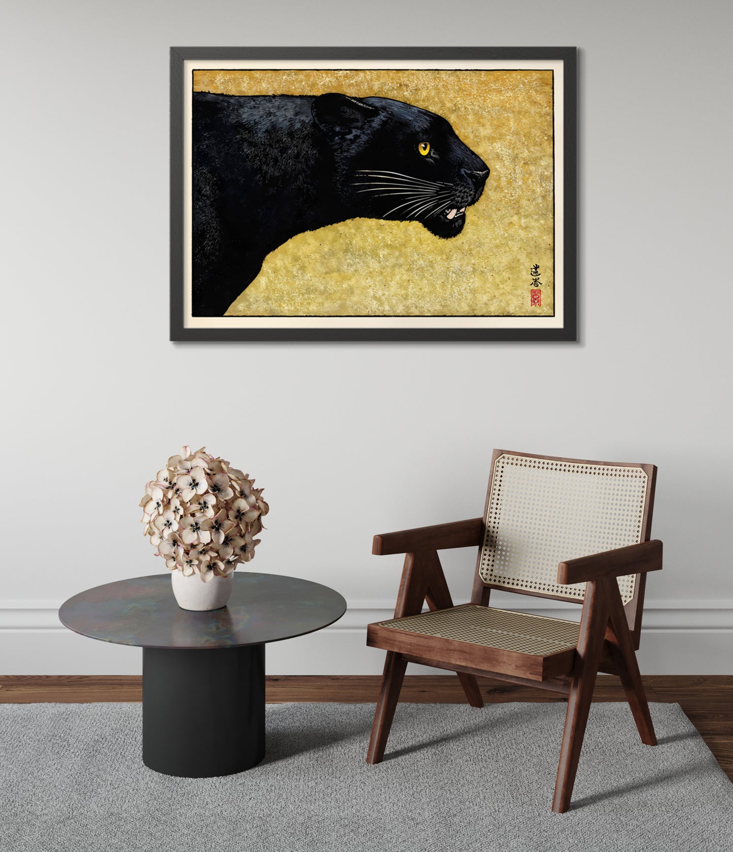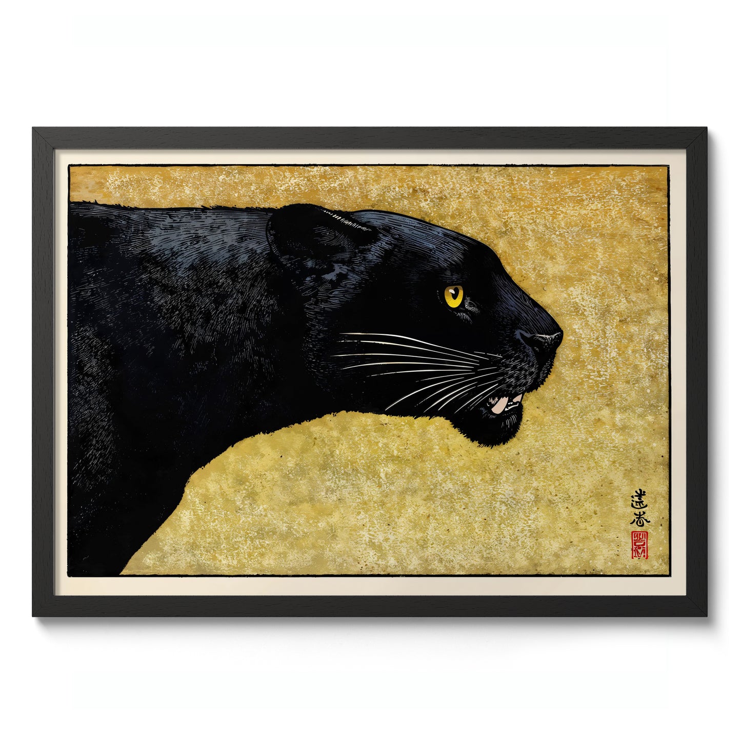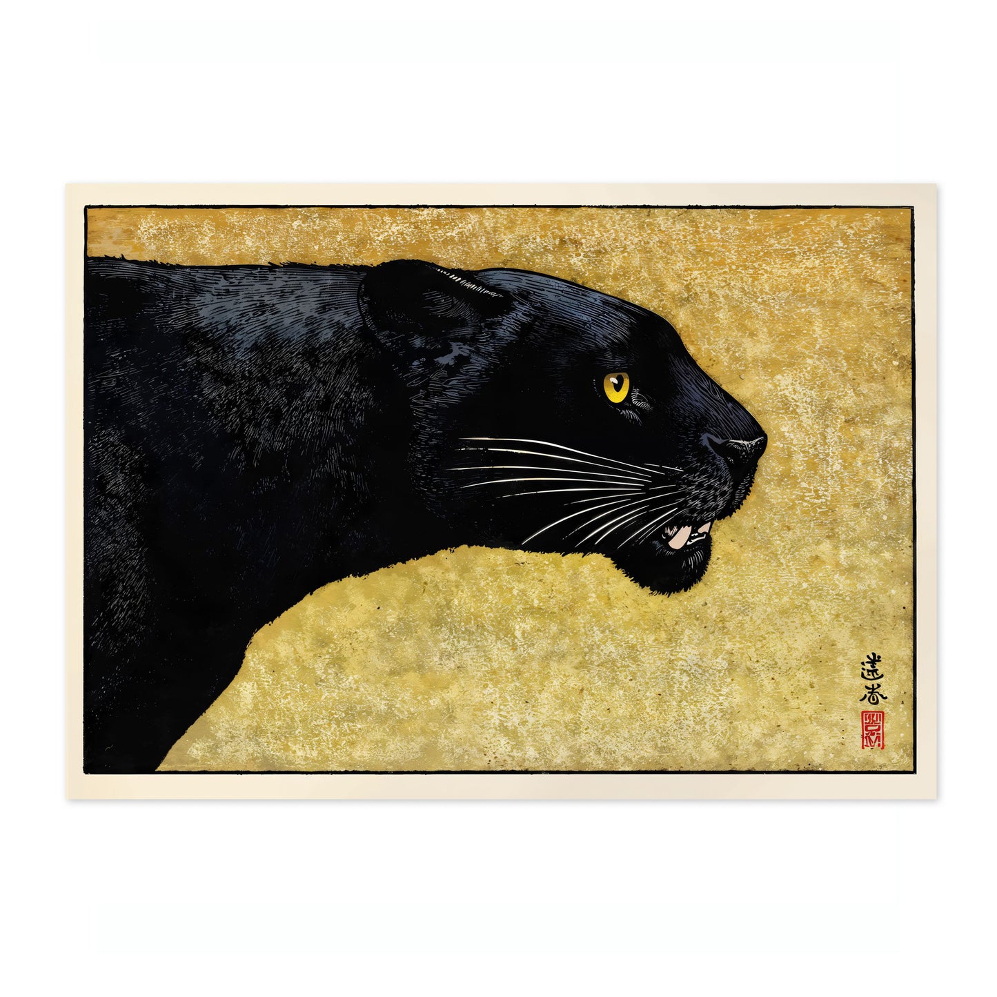 This striking "Black Panther" poster by Toshi Yoshida showcases a traditional Japanese woodblock style. A sleek black panther, with intense yellow eyes, contrasts against a textured yellow backdrop. Capturing the essence of Japanese artistry, this animal-themed piece embodies elegance and power, perfect for those seeking an iconic fusion of wildlife and traditional Japanese art in poster form.