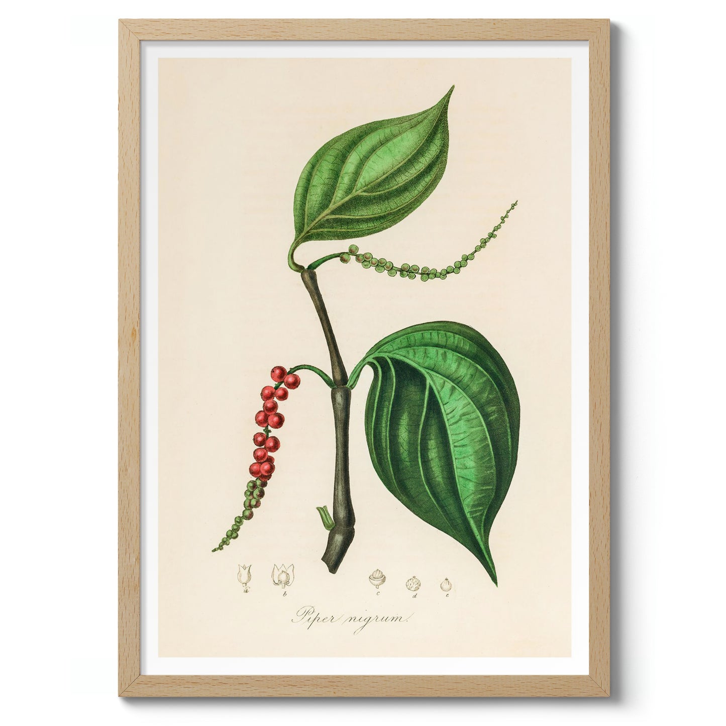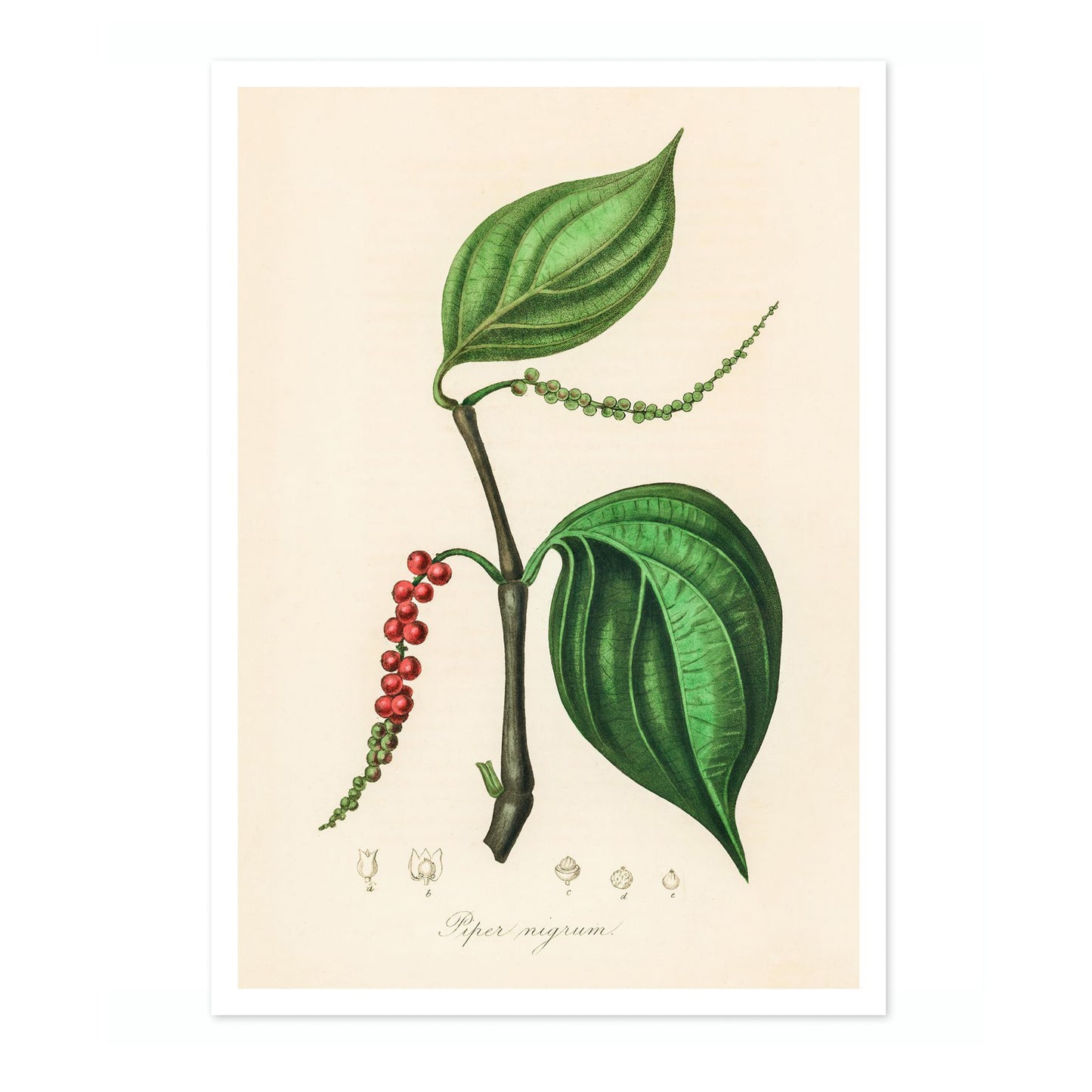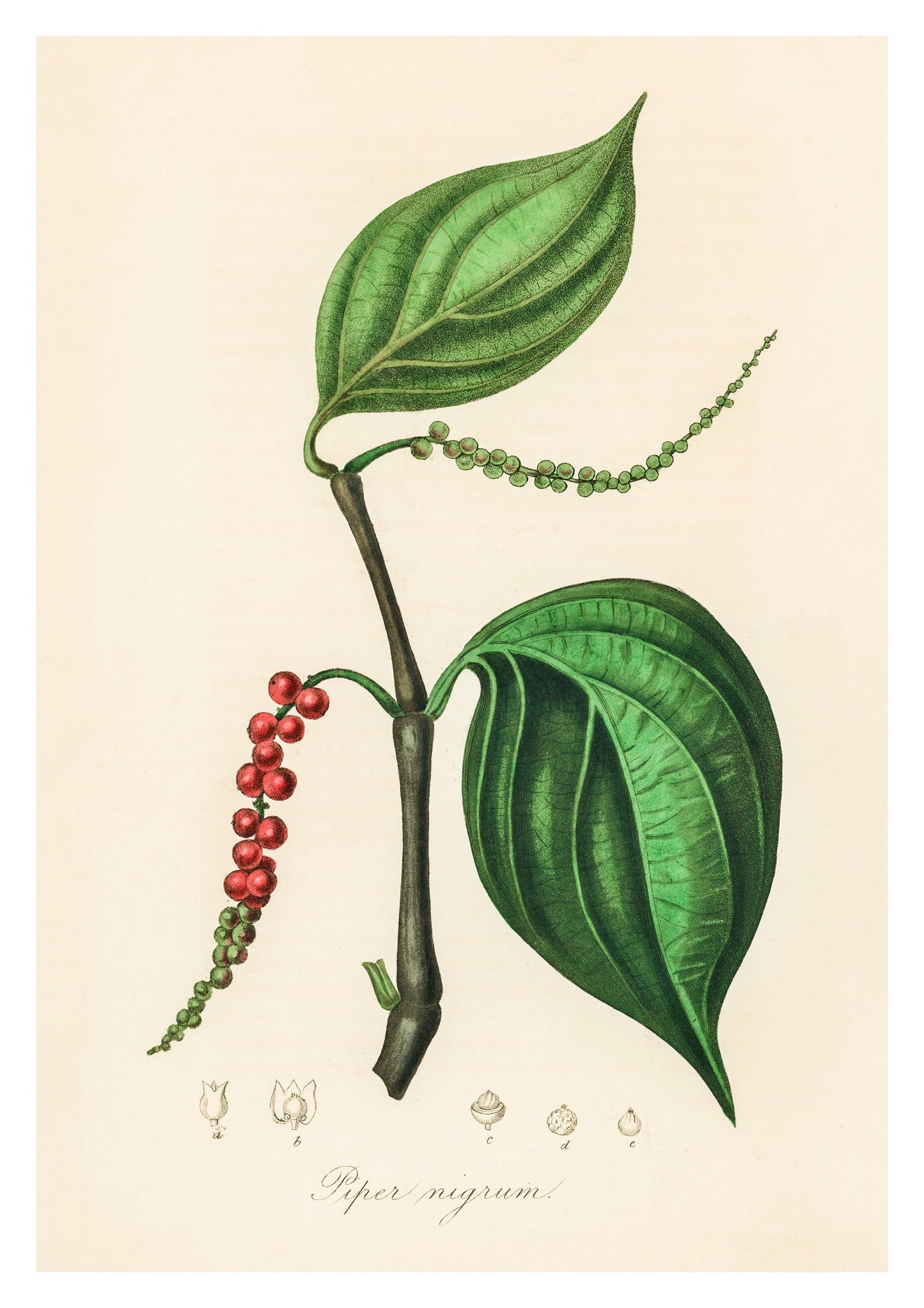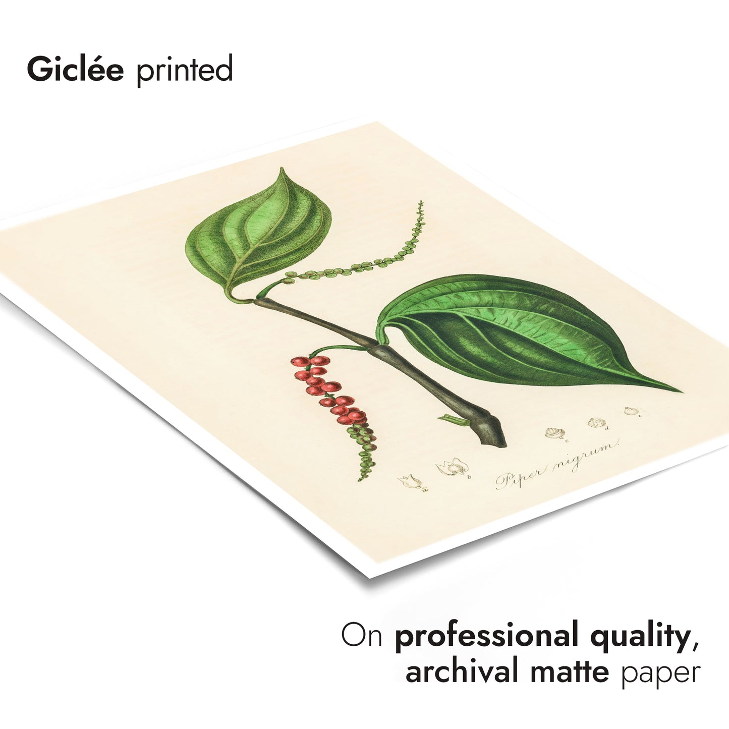This vintage botanical poster by John Stephenson features an intricately detailed illustration of the Piper nigrum plant. Displaying vibrant green leaves juxtaposed with clusters of red peppercorns, this artwork captures the natural essence of the black pepper plant. The beige background enhances the botanical study's timeless elegance, making it ideal for nature enthusiasts and vintage art lovers.