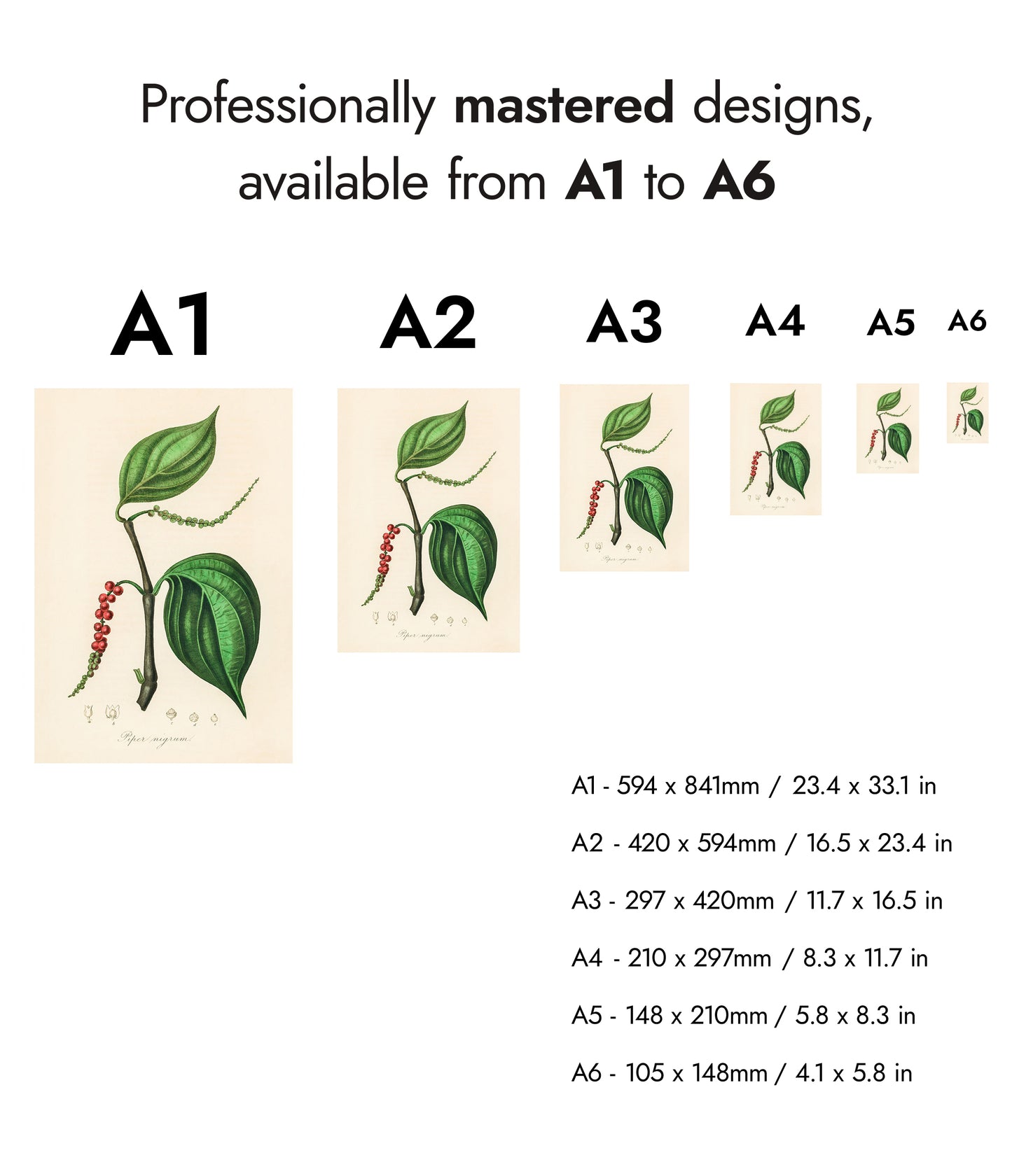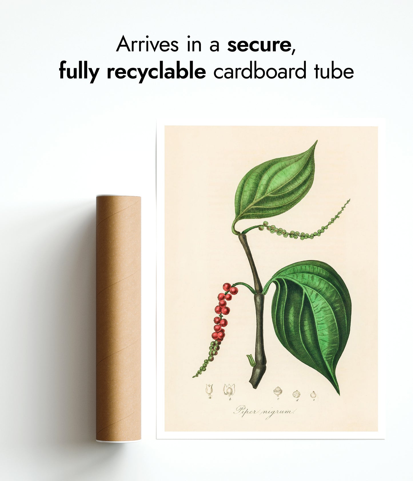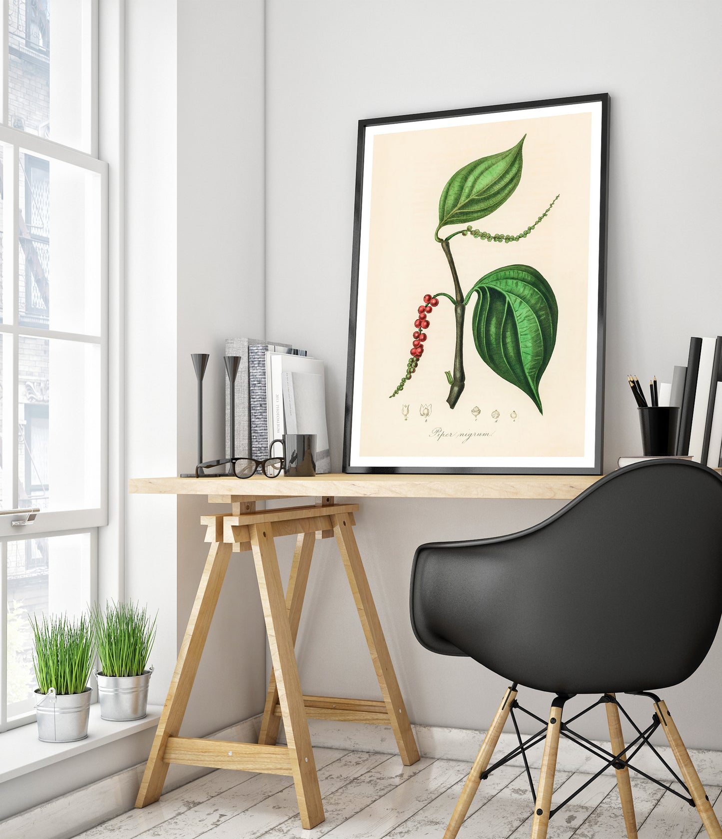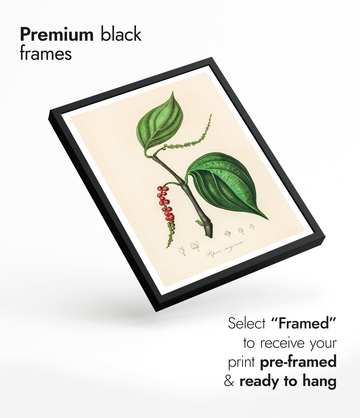 This vintage botanical poster by John Stephenson features an intricately detailed illustration of the Piper nigrum plant. Displaying vibrant green leaves juxtaposed with clusters of red peppercorns, this artwork captures the natural essence of the black pepper plant. The beige background enhances the botanical study's timeless elegance, making it ideal for nature enthusiasts and vintage art lovers.