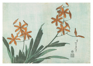 This blackberry lily poster by Katsushika Hokusai showcases traditional Japanese woodblock techniques. The illustration features delicate orange lilies with lush green leaves set against a serene light blue background. Hokusai’s meticulous attention to detail in this still life captures the essence of Japanese art, making it an exquisite addition to any space.