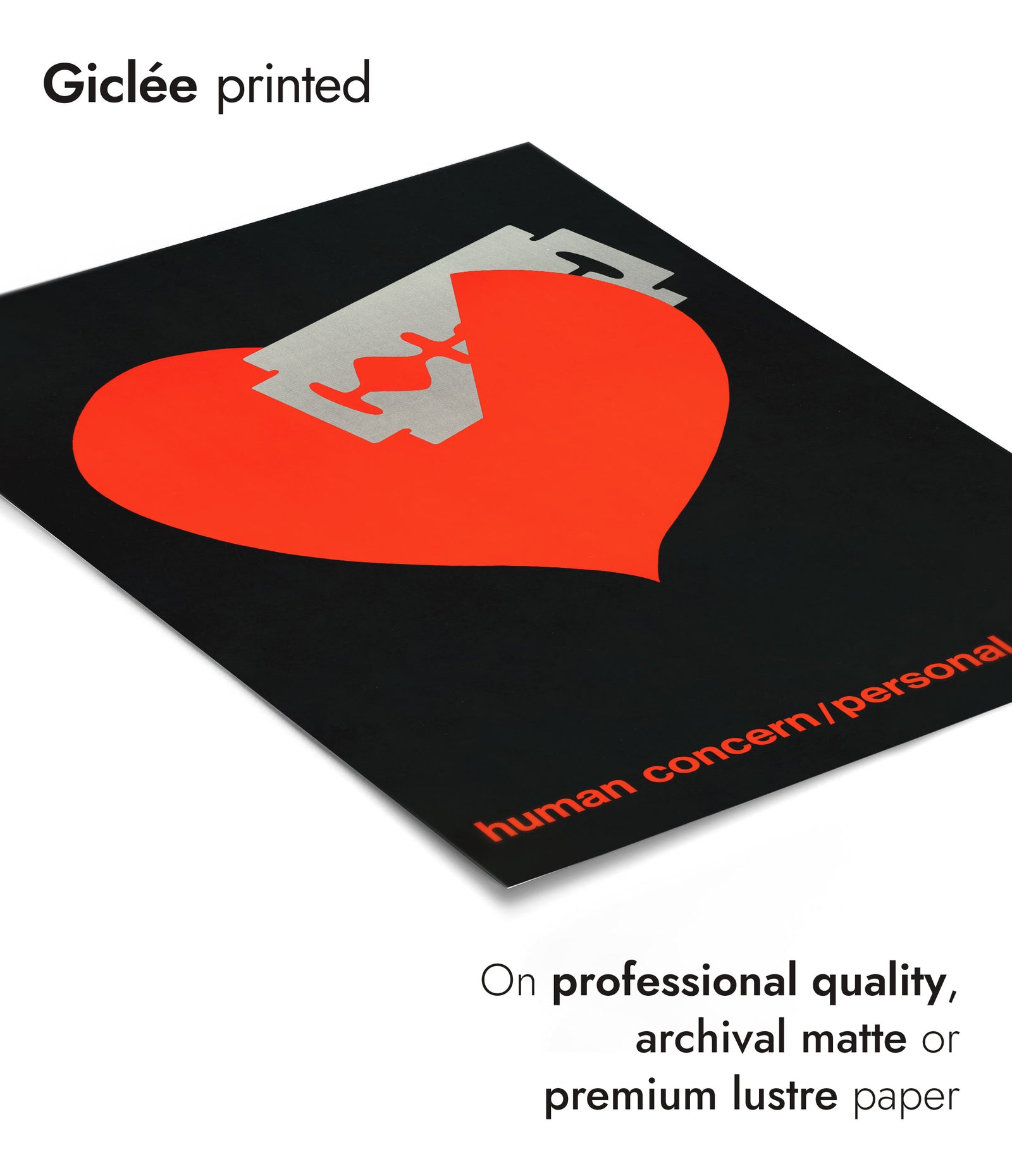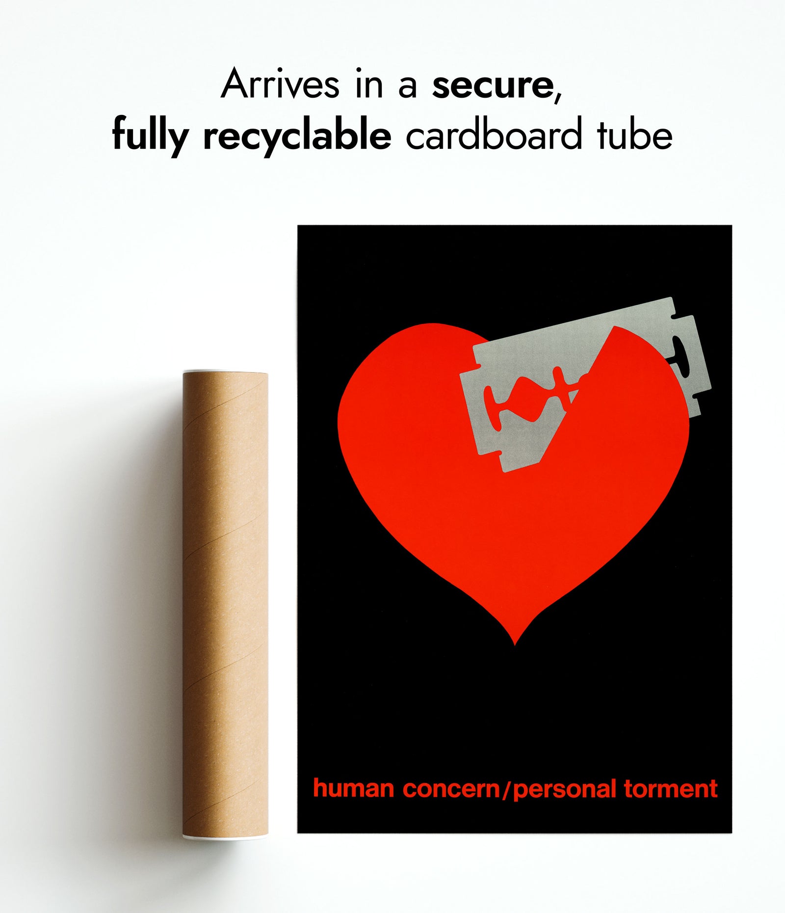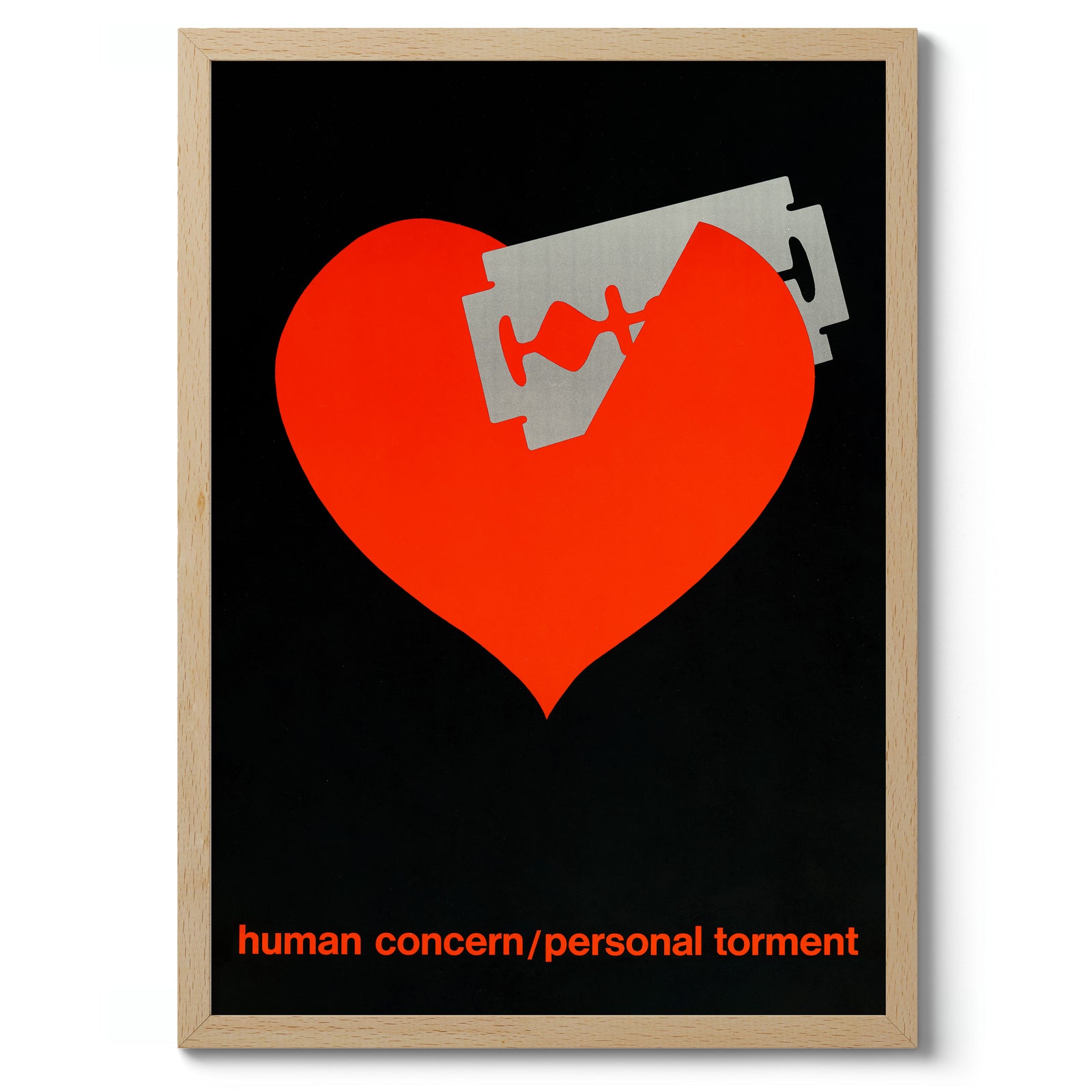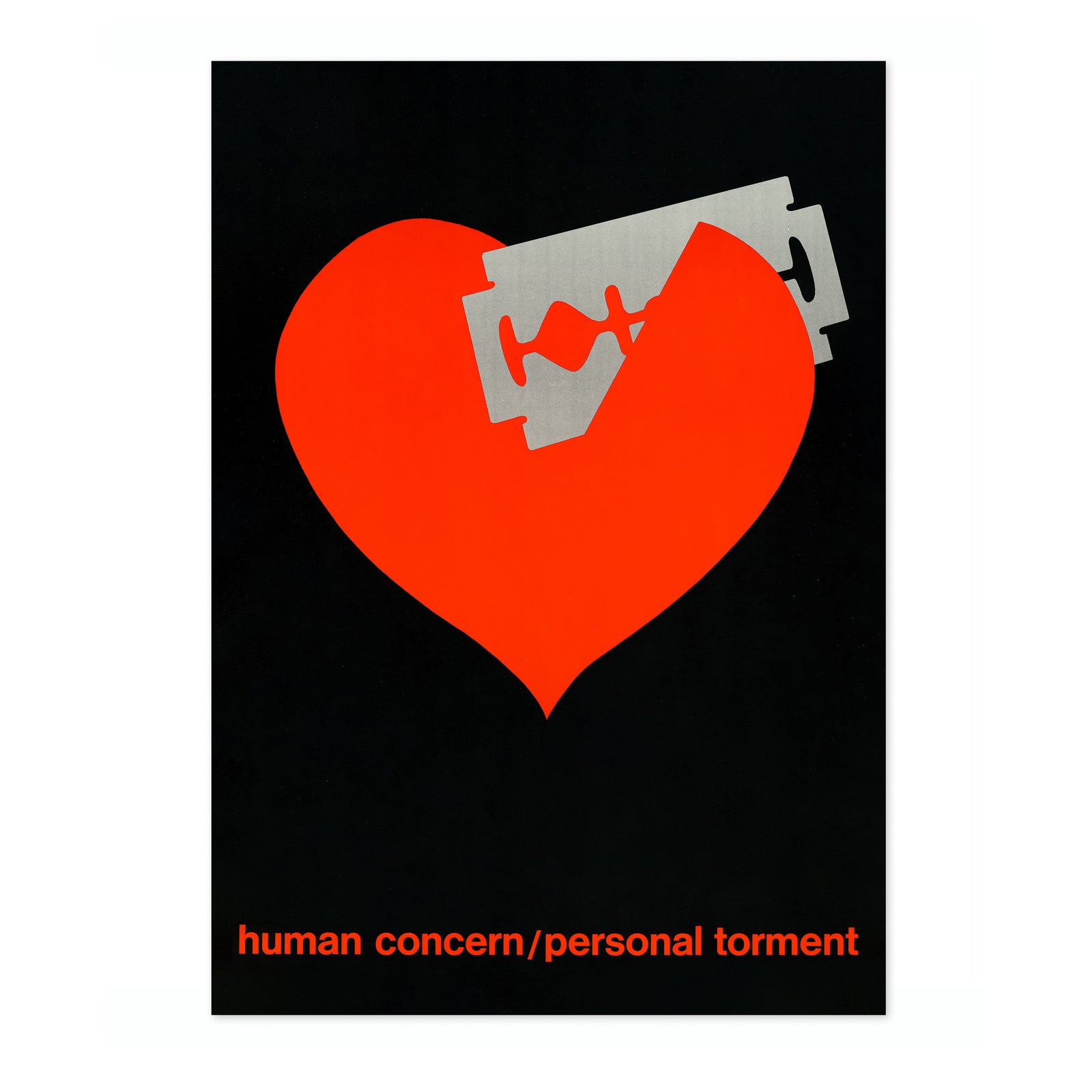 This "Bleeding Heart" poster features a striking red heart pierced by a razor blade, set against a black background. The minimalist, graphic vintage style is complemented by the poignant slogan "human concern/personal torment" at the bottom. Ideal for adding a bold, emotional statement to any space, this art print combines stark contrasts and powerful imagery.