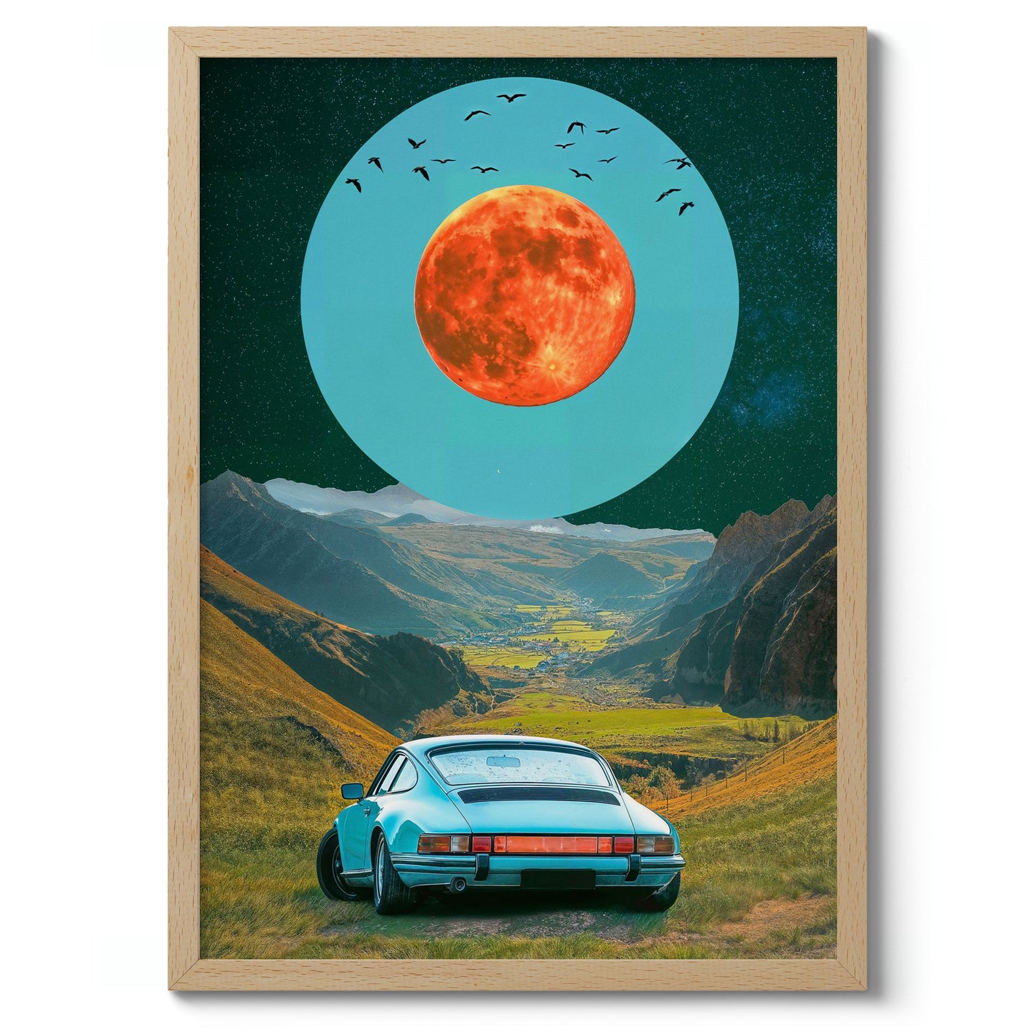 This "Blood Moon" poster showcases a surrealistic blend of sci-fi and retro elements. A vintage car overlooks an expansive valley with towering mountains, under a dramatic blood moon eclipsing a teal sky. A flock of birds adds movement, enhancing the mystical atmosphere. Perfect for fans of graphic and modern art styles seeking a cosmic adventure.