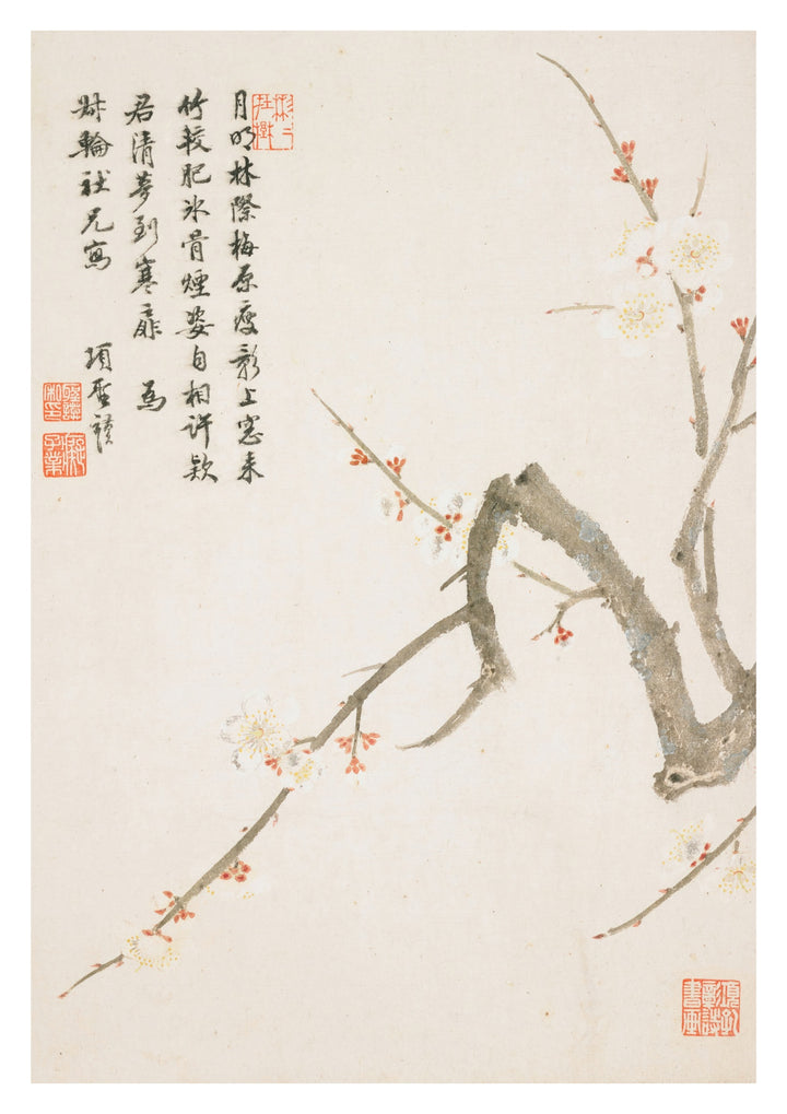 The "Blossoming Plum Flower" poster by Xiang Shengmo captures the delicate elegance of blooming plum flowers in the traditional Sumi-E painting style. This artwork features a graceful branch with subtle blossoms, accompanied by beautiful calligraphy. Ideal for those who appreciate Japanese and Chinese art traditions, this piece brings a sense of tranquility to any space.