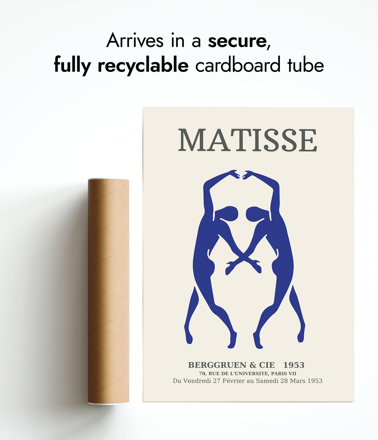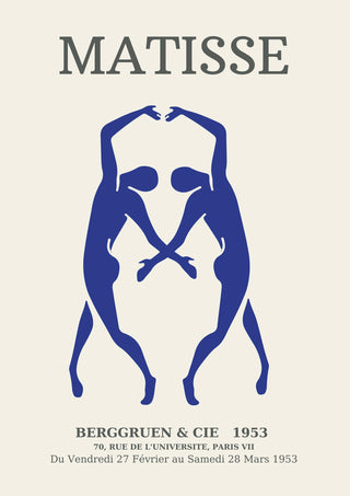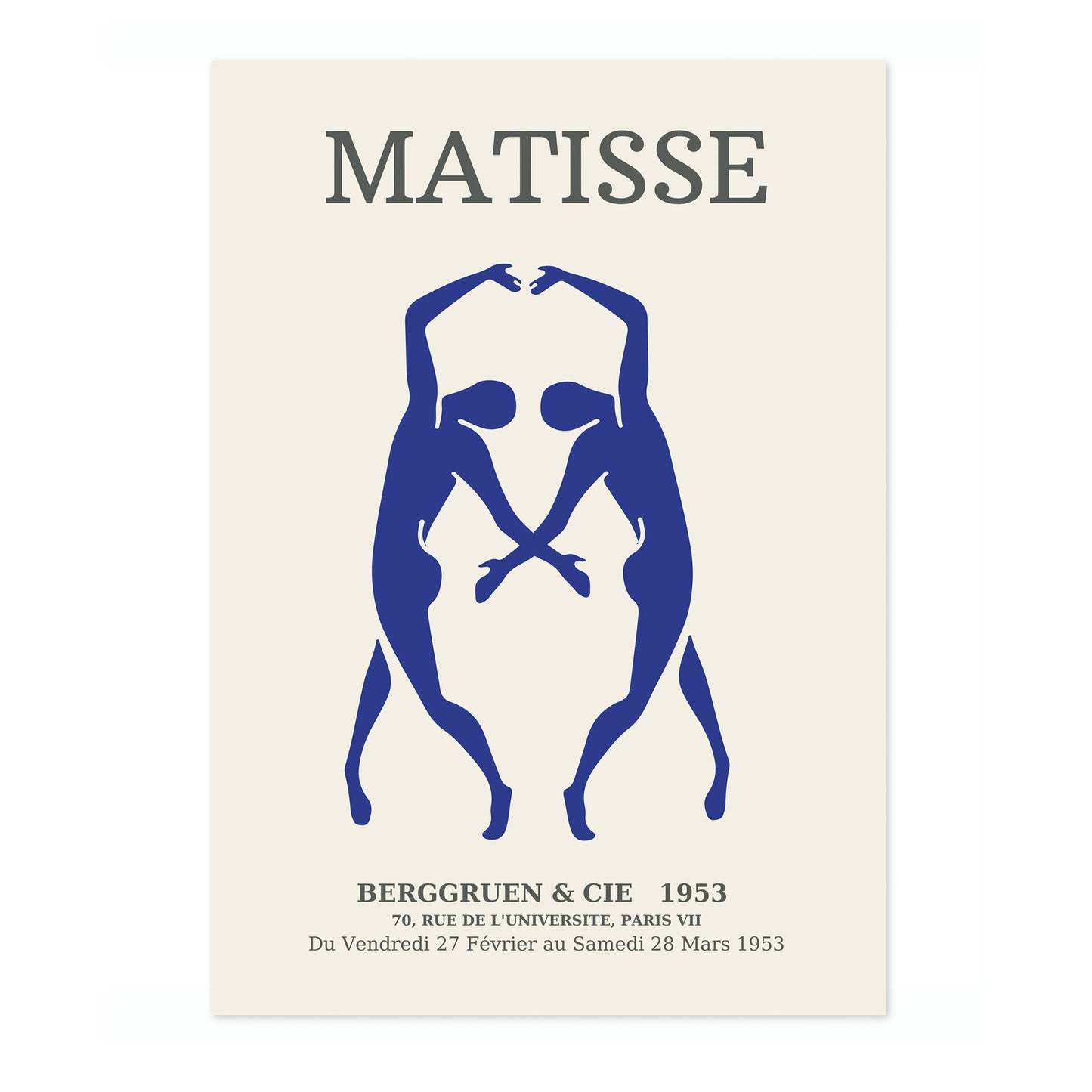 The "Blue Body Dance" poster by Henri Matisse features two abstract, blue figures poised in a mirrored dance pose. Set against a beige background, the cutout style creates a dynamic sense of motion and symmetry. This graphic artwork, reminiscent of a 1953 Paris exhibition, highlights Matisse's expertise in using simple shapes and bold colors to express grace and elegance.